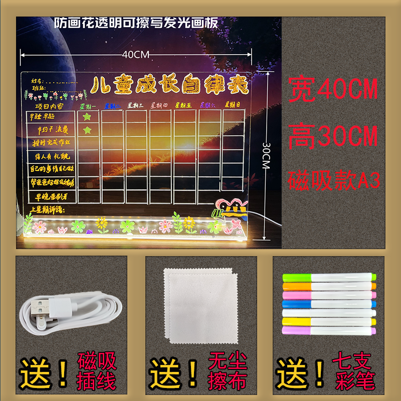 • 30*40에는 7가지 컬러 펜 + 지우개 + 바닥 카드 1개(USB 플러그인)가 함께 제공되며 걸거나 세울 수 있습니다.