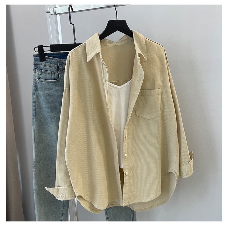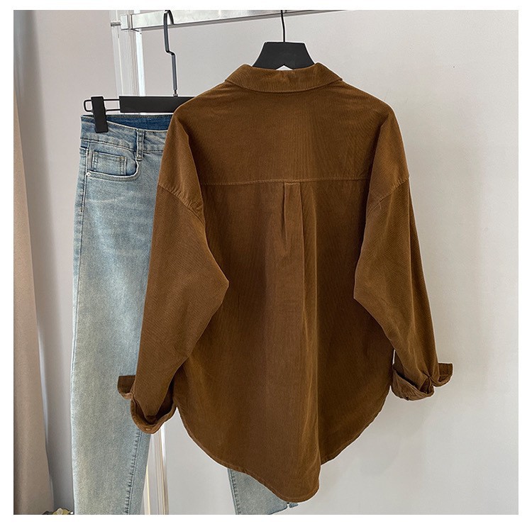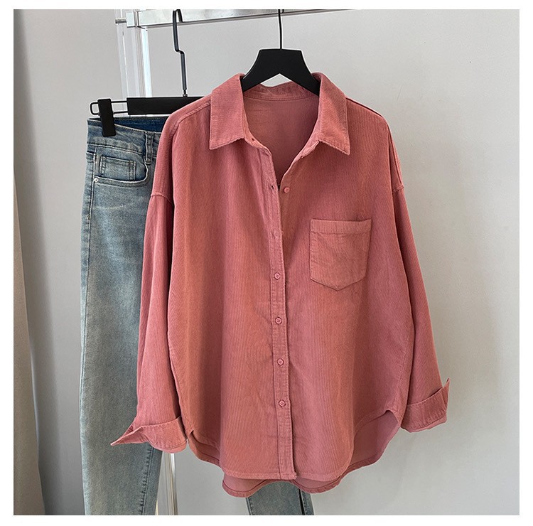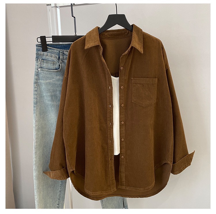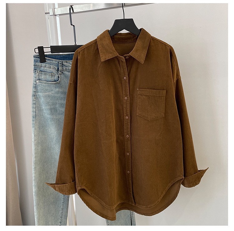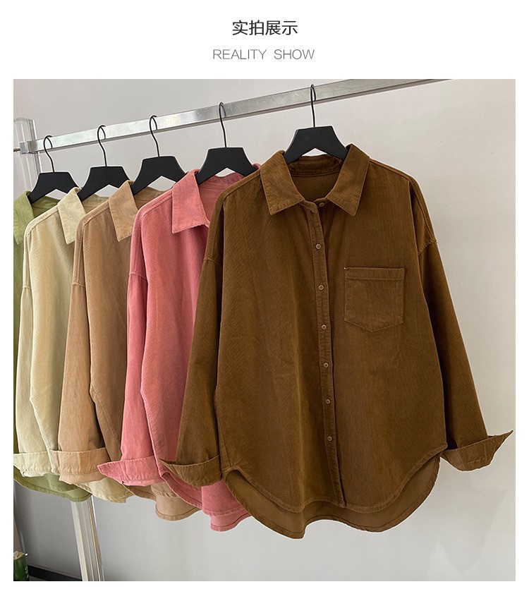 코듀로이 셔츠 여성의 느슨한 디자인 틈새 긴 소매 중간 길이 쌓인 단색 셔츠 외부 카디건 탑스토어 가기