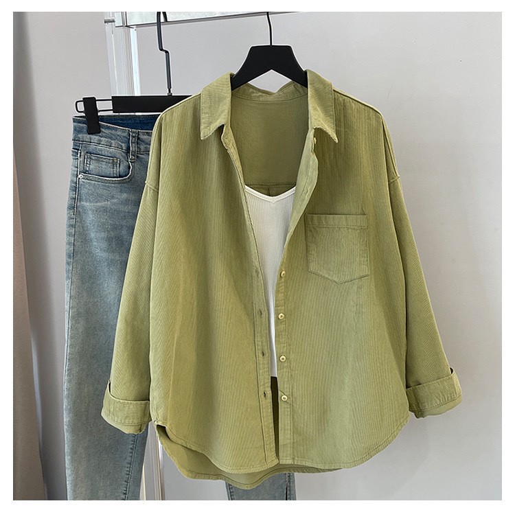 코듀로이 셔츠 여성의 느슨한 디자인 틈새 긴 소매 중간 길이 쌓인 단색 셔츠 외부 카디건 탑