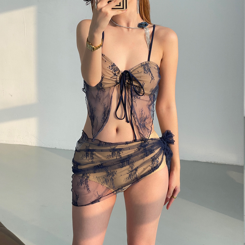 소스 공장 레이스 튜브 탑 분할 수영복 세트 여성 휴가 온천 배꼽 커버 슬리밍 스커트 비키니