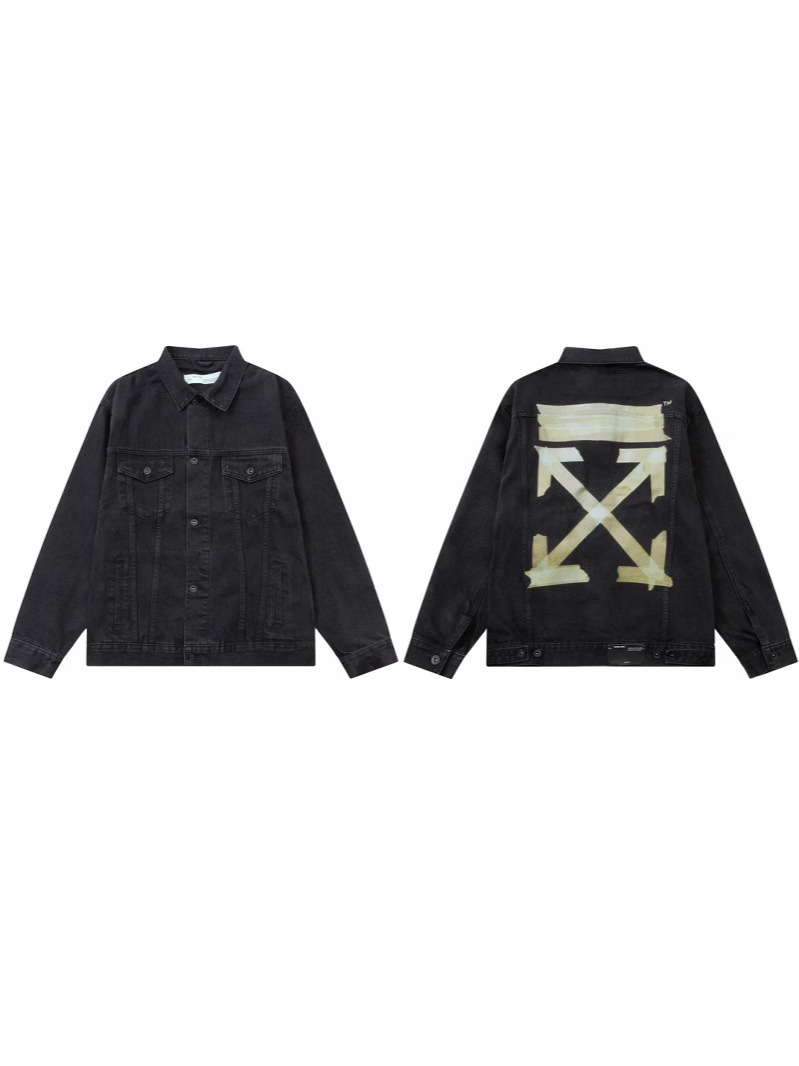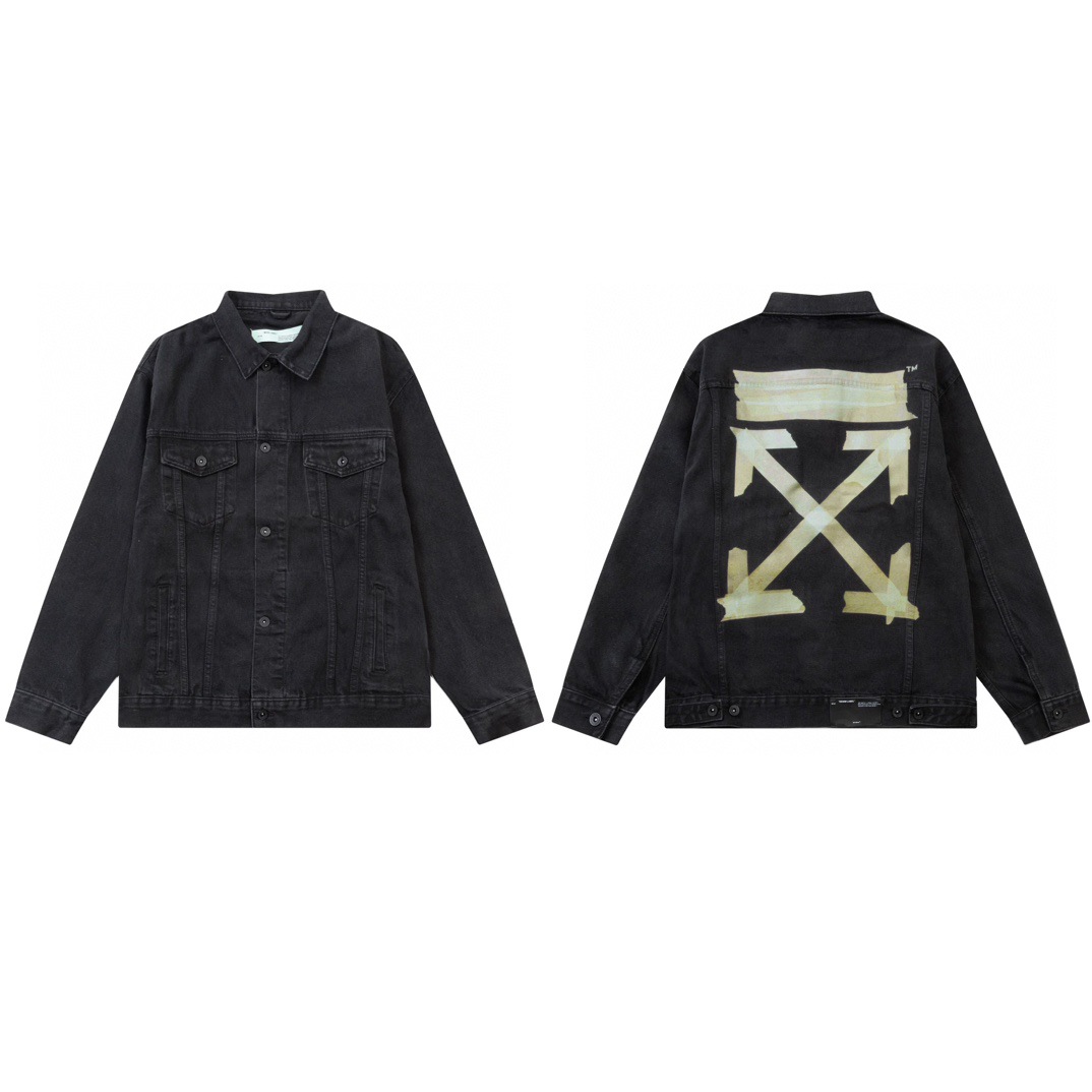2024ss 새로운 OW 테이프 패치 화살표 캐주얼 느슨한 남성과 여성의 블랙 데님 재킷 코트