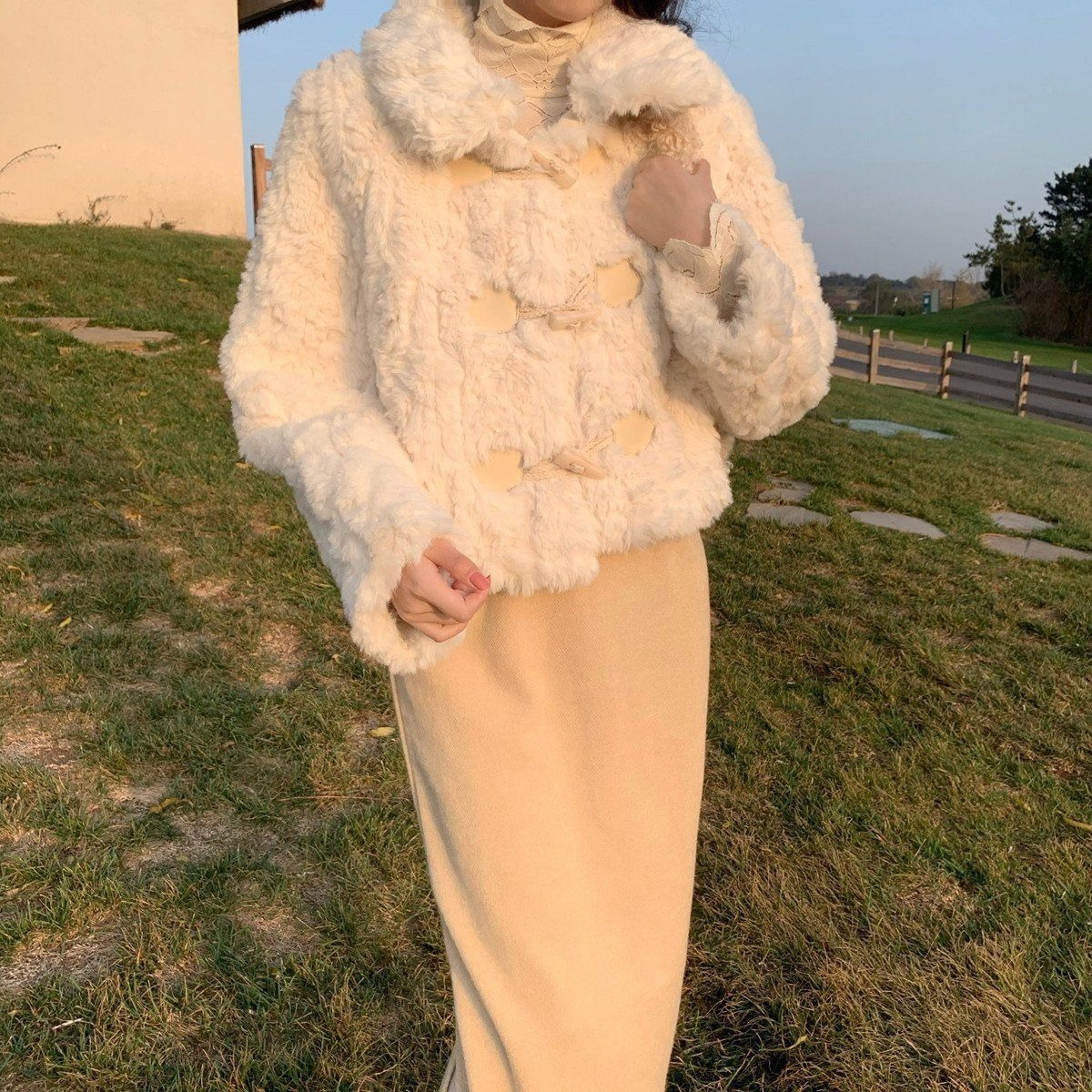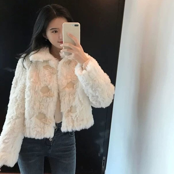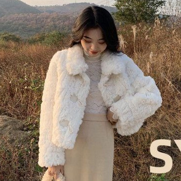짧은 짧은 람스울 코트 여성의 한국 패션 모조 토끼 봉제 모피 2024 가을과 겨울 새로운 황소 뿔 버클스토어 가기