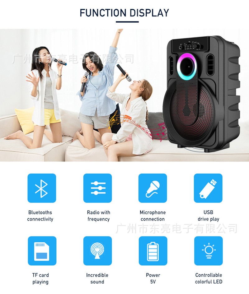 Supports USB/TF/FM/Bluetooth/TWS, with microphone function, flame light+rainbow light, TYPE-C interface charging function.