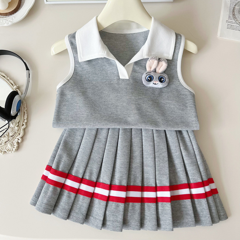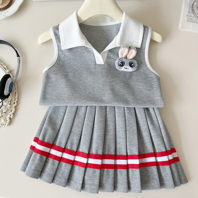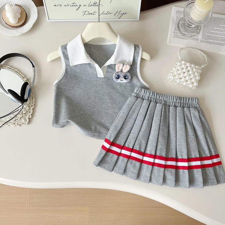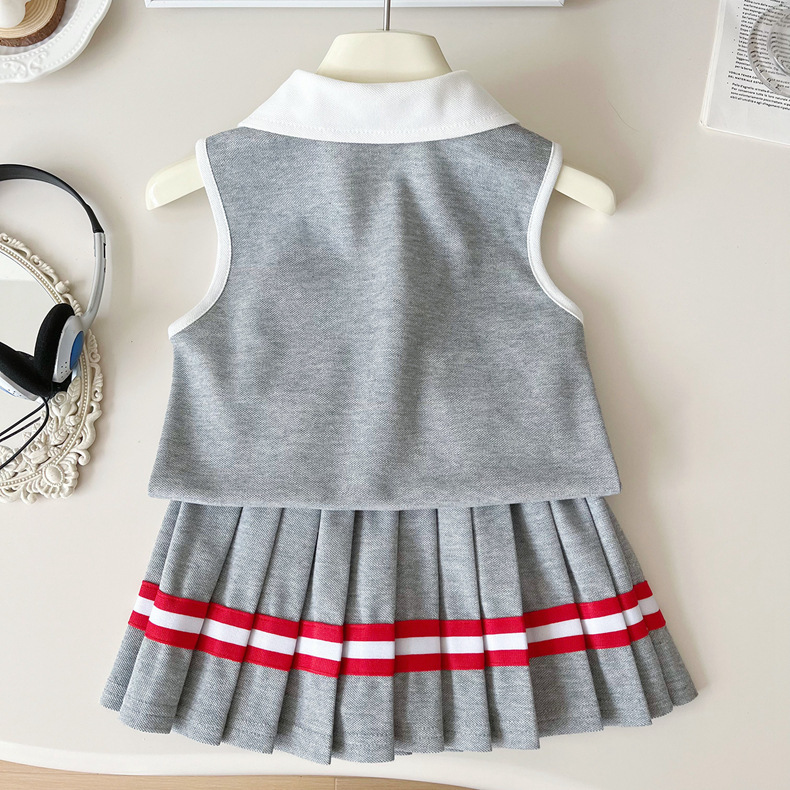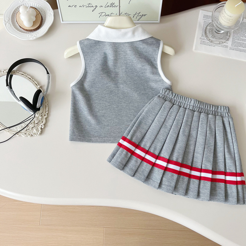 여자 여름 새로운 도착 세트 스타일 여자 대학 스타일 민소매 폴로 칼라 조끼 탑 플리츠 스커트 투피스 세트