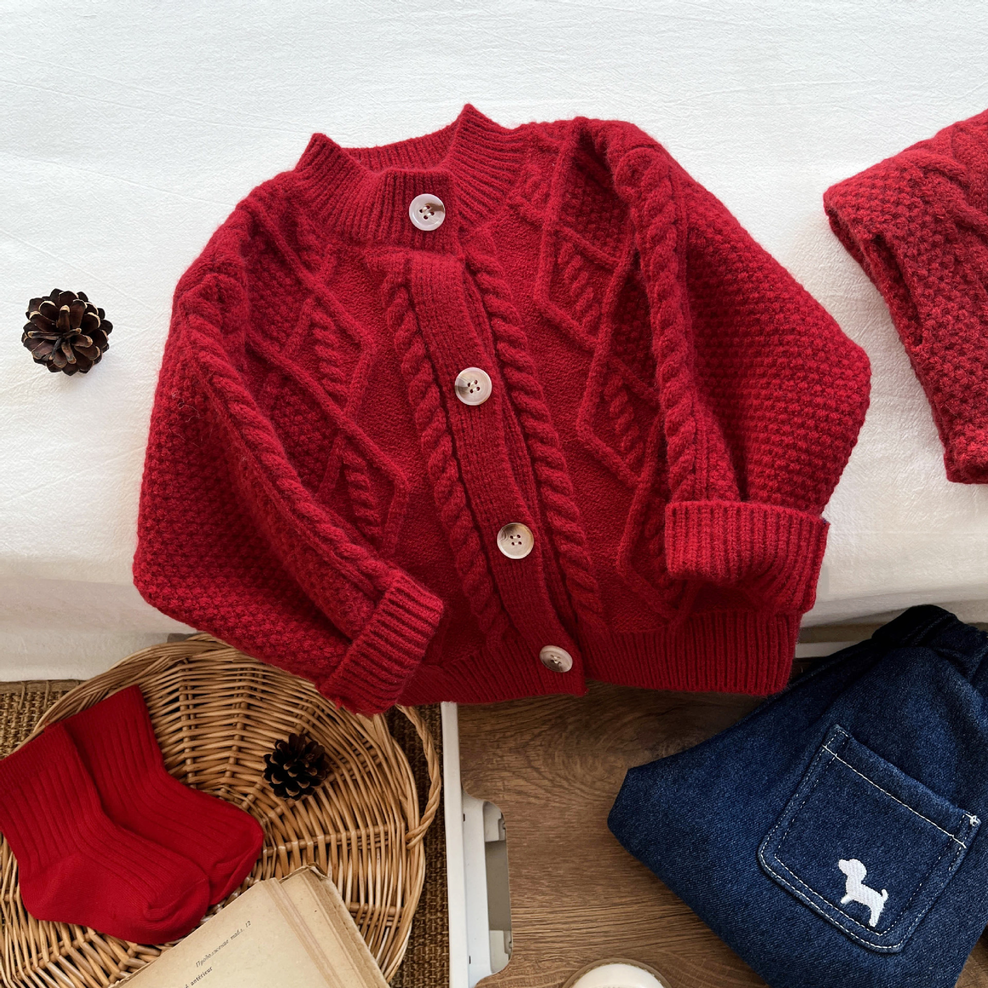 아기의 붉은 스웨터 소년의 한국식 신년 서비스 크루 넥 코트 여성 보물 튀김 거리 두꺼운 트위스트 니트 카디건