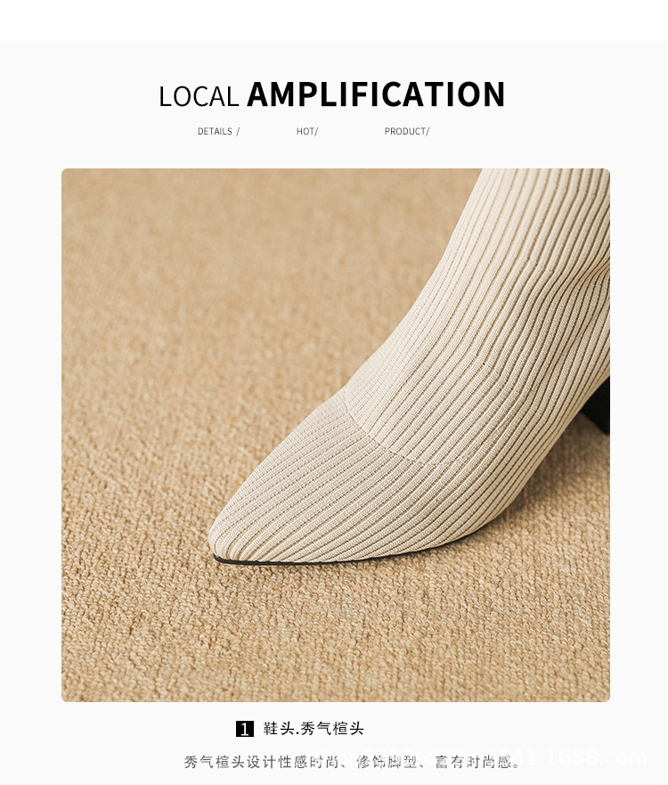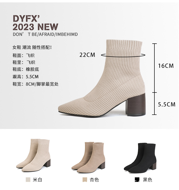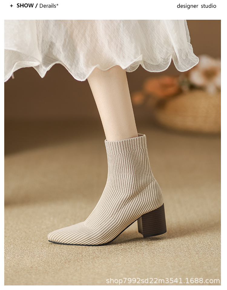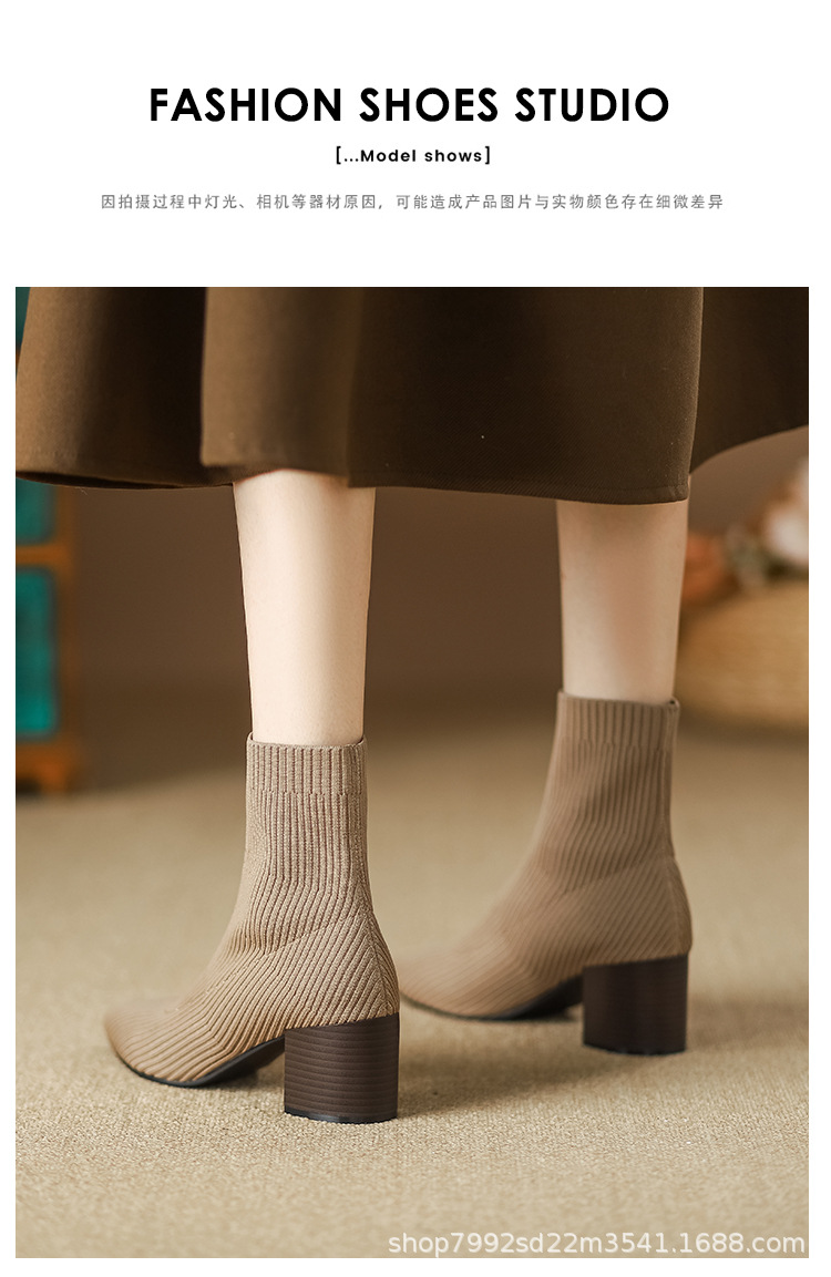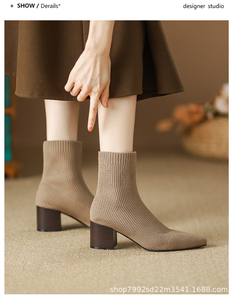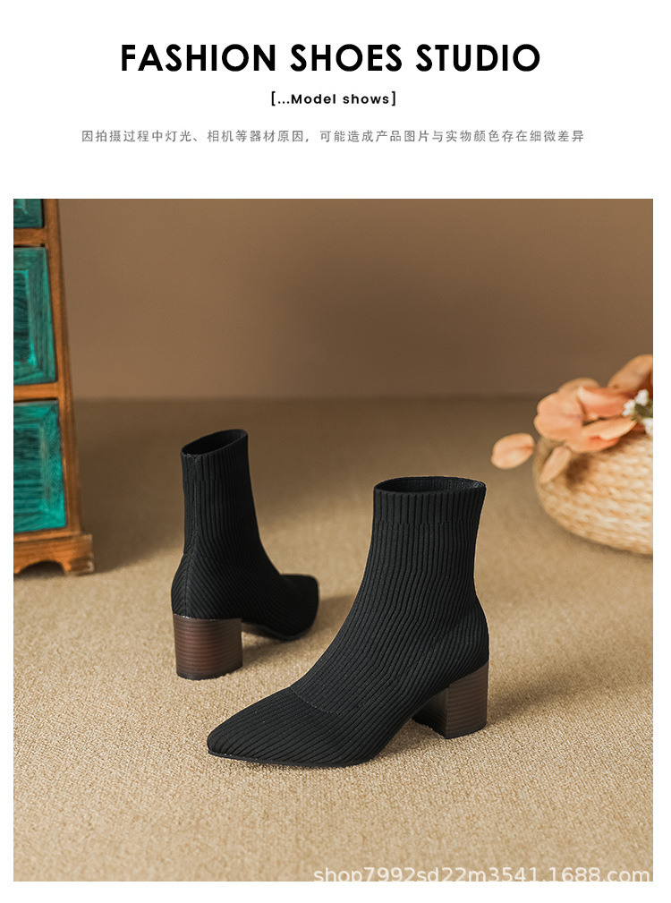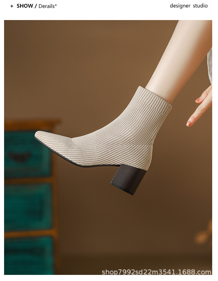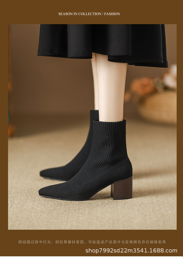 2024 가을 및 겨울 새 양말 부츠 포인팅 두꺼운 힐 플라잉 짠 부츠 얇은 부츠 플러스 사이즈 짠 부츠 여성용 중간 배럴 마틴 부츠스토어 가기