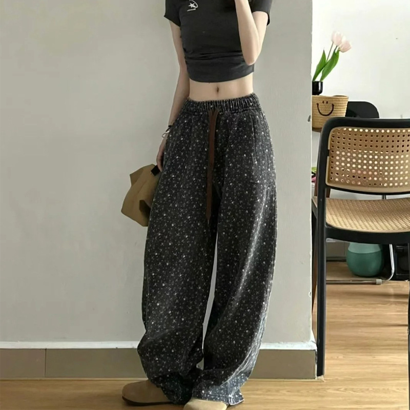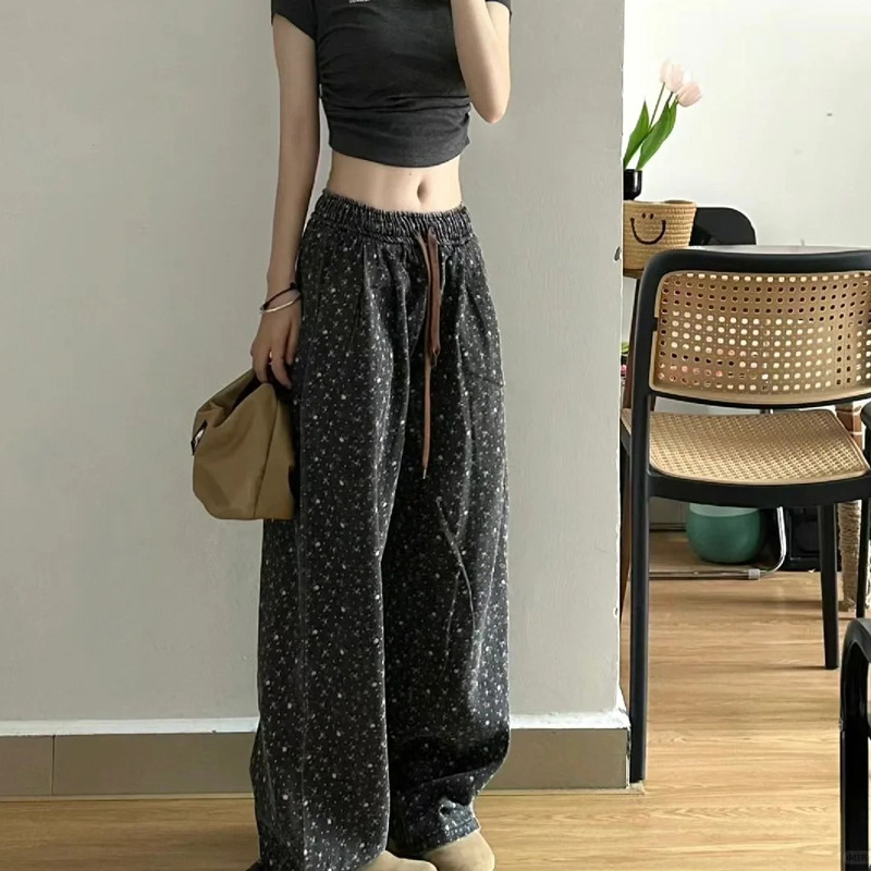 도매 가을 겨울 신상 한국 청바지, 복고풍 꽃무늬 루즈한 와이드 레그, 여성용 다용도 두꺼운 스트레이트 캐주얼 팬츠