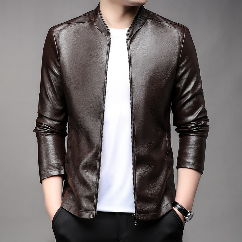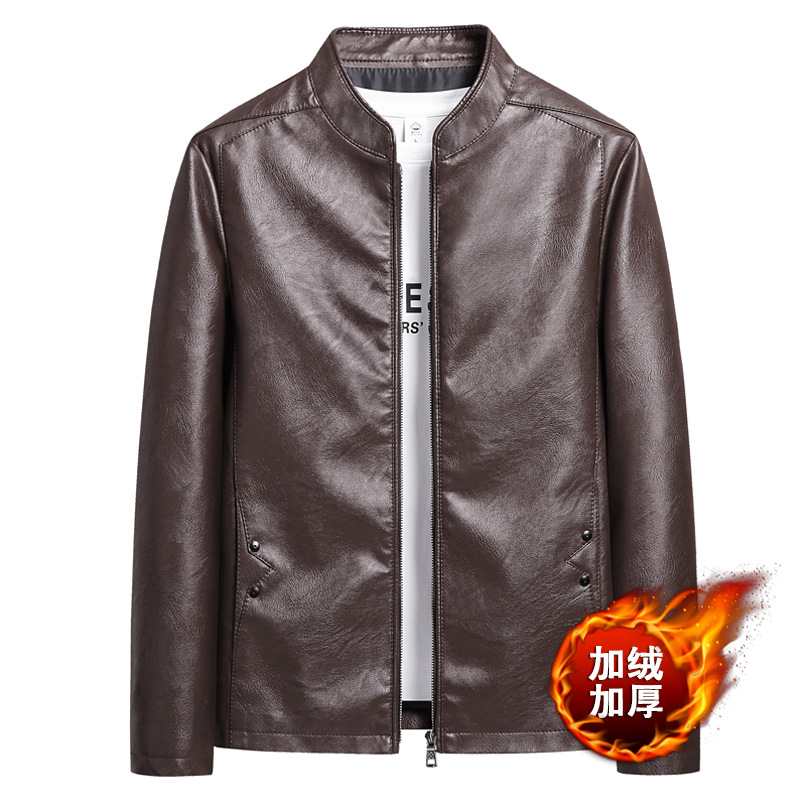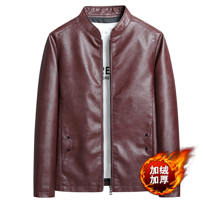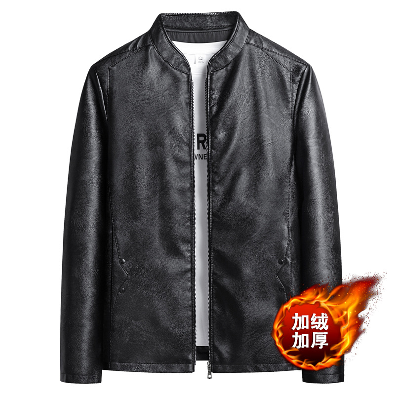 크로스보더 가을겨울 인기상품 PU 남성 가죽 자켓, 플리스 안감, 큰 사이즈, 솔리드 컬러, 스탠드 칼라, 슬림핏, 멋스러운 남성용 트렌디 바이커 자켓