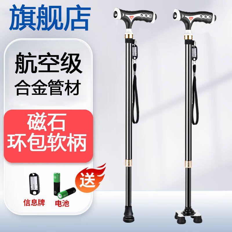 노인 알루미늄 합금 가벼운 미끄럼 방지 텔레스코픽 워킹 스틱 라이트를위한 노인 4 발 워킹 스틱을위한 자석 목발