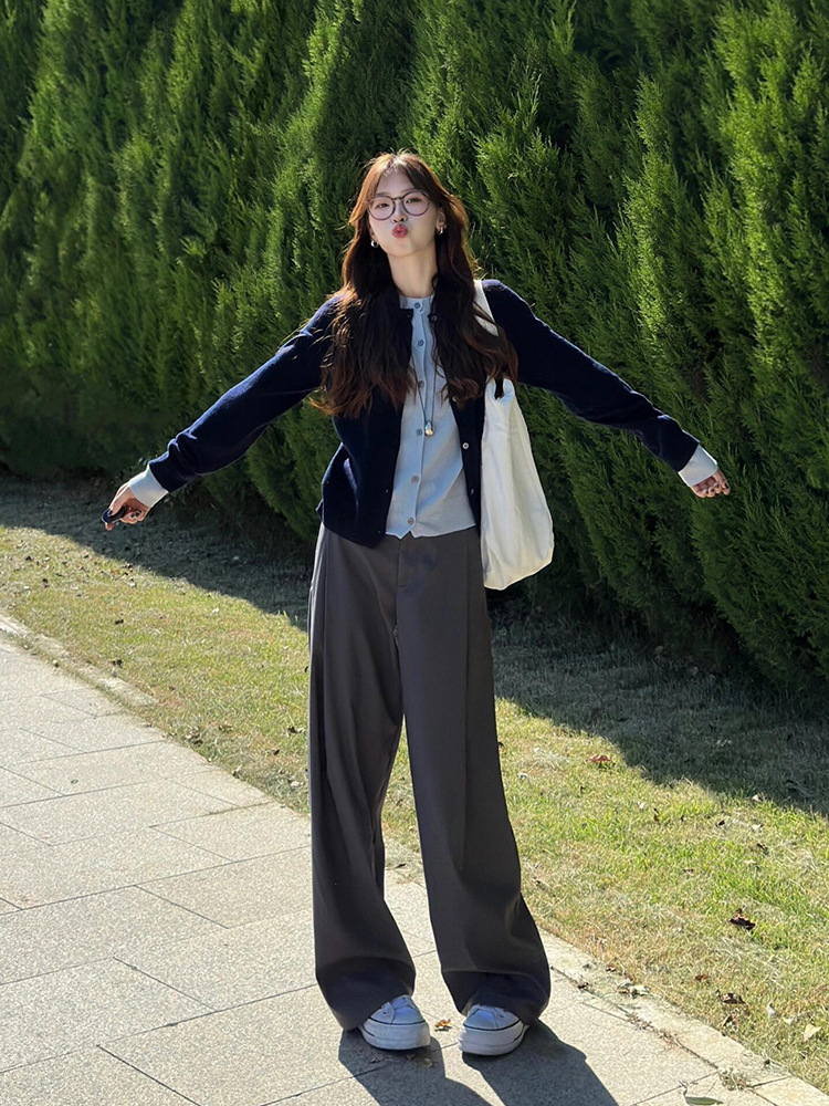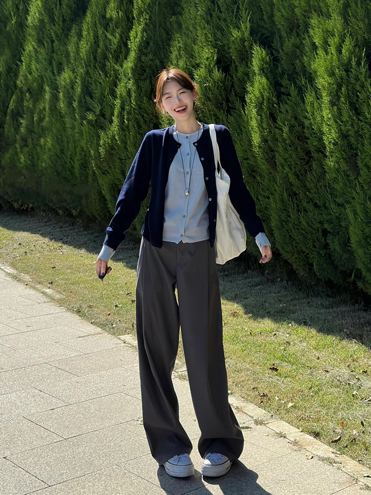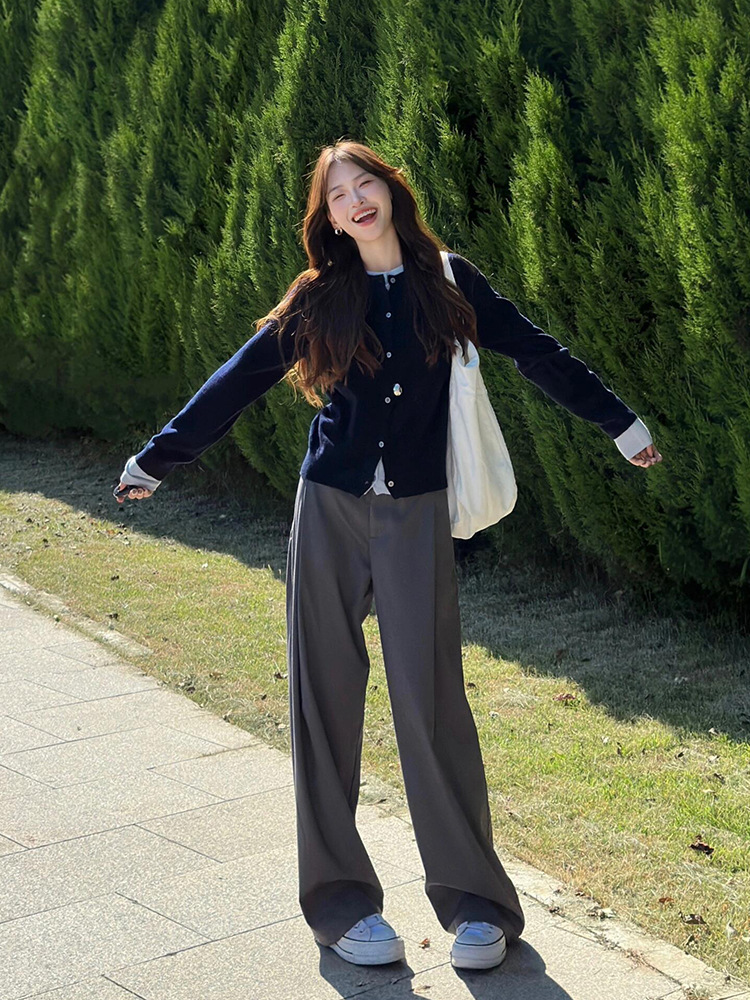 한국식 소프트 왁스 크루 넥 네이비 스웨터 코트 여성용 2024 가을 슬림핏 짧은 니트 카디건 탑