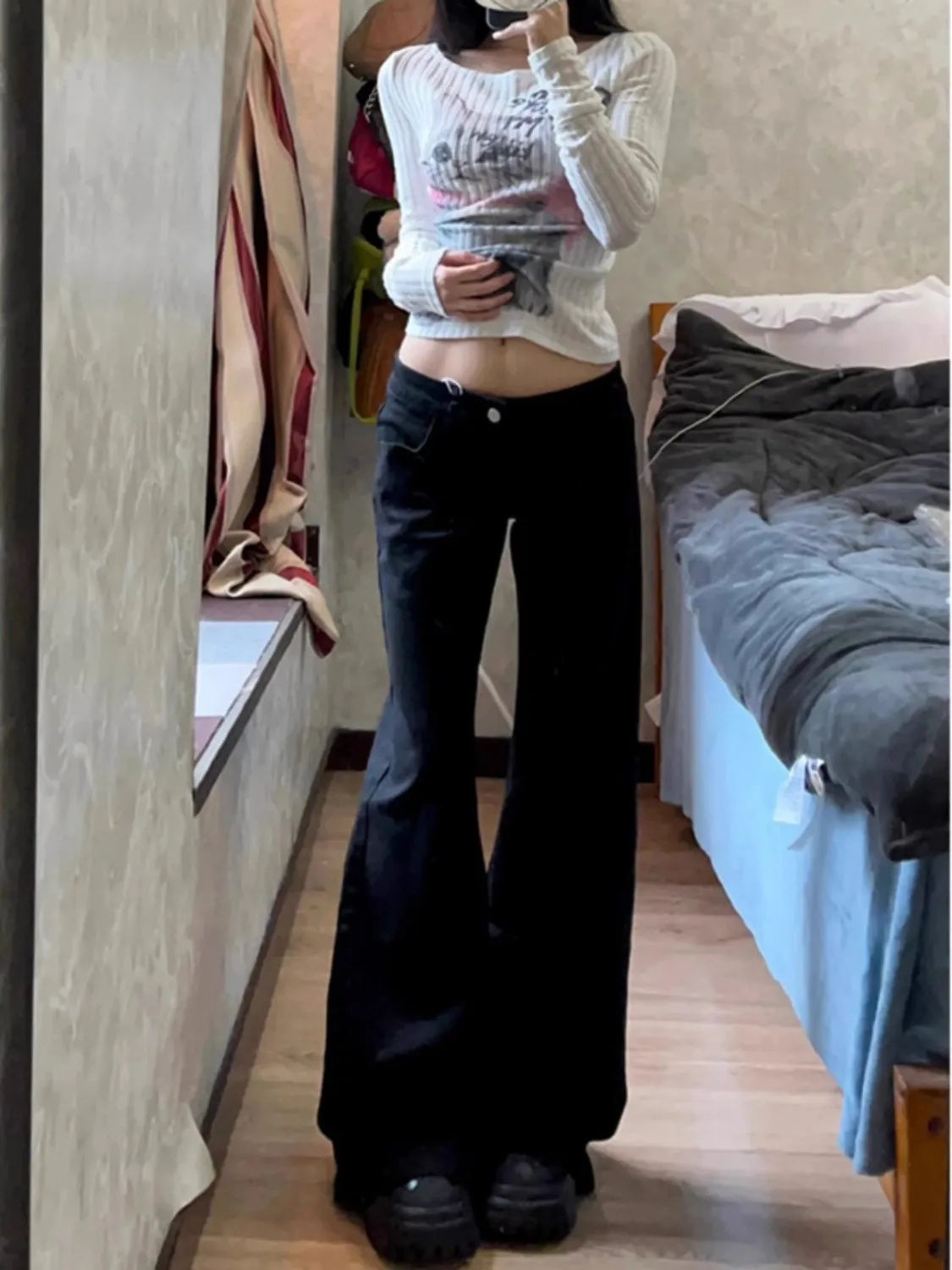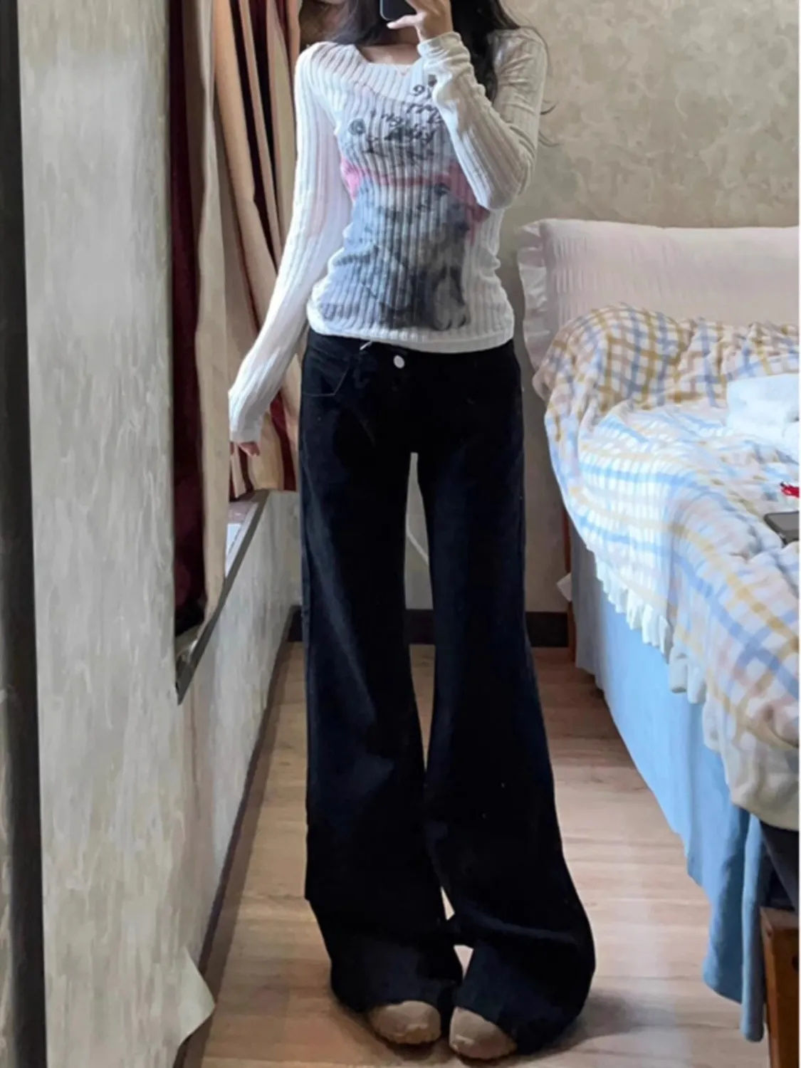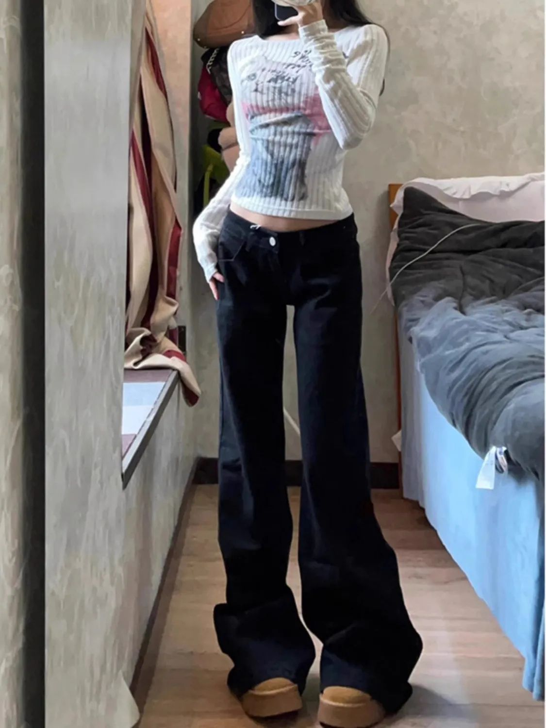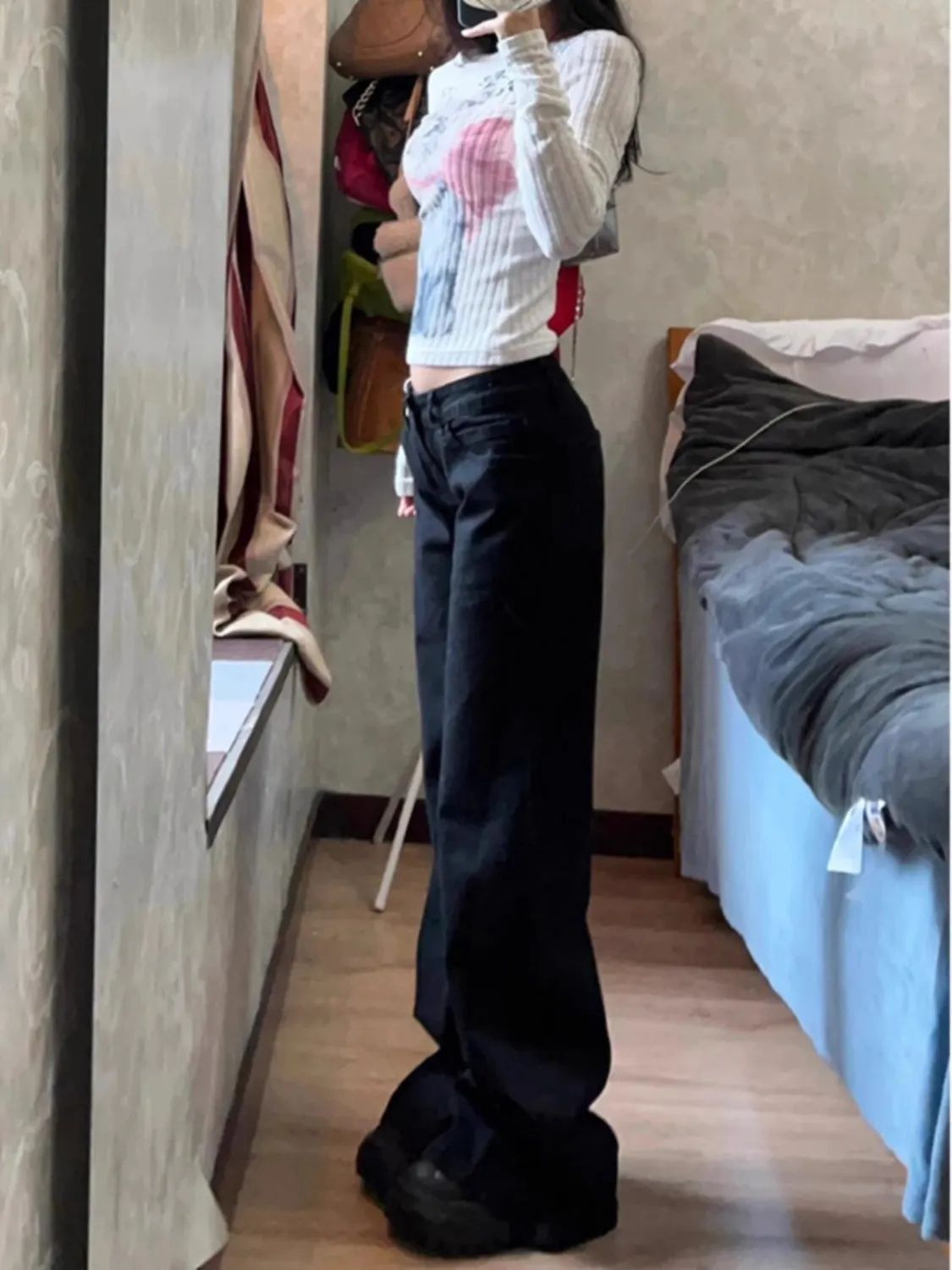 검은 뜨거운 소녀 낮은 허리 넓은 다리 뿔 청바지 여성의 가을 새로운 느슨한 슬리밍 스트레이트 올 매치 와이드 다리 바지스토어 가기