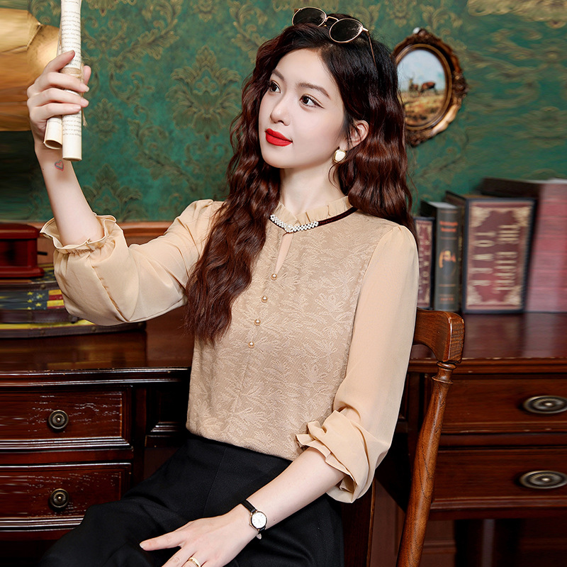유럽 레이스 구슬 스웨터 바닥 셔츠 여성의 2024 가을 새로운 스티칭 진주 원사 긴 소매 재킷 도매