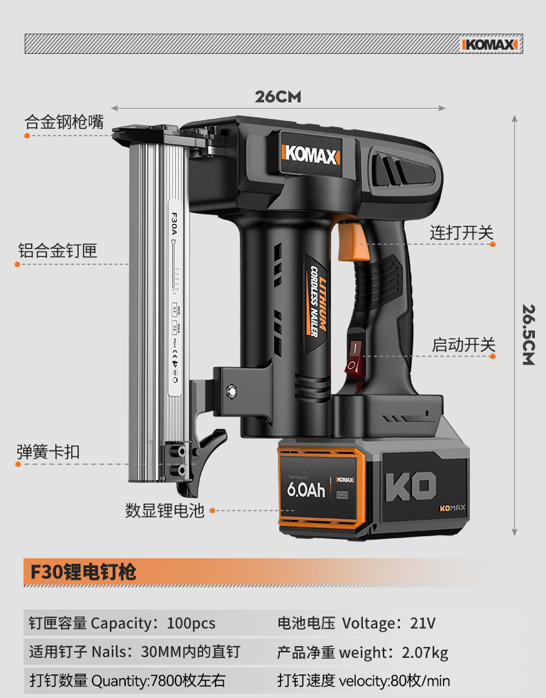 • F30 리튬 배터리 네일건 [KO 디지털 디스플레이 6.0Ah] 배터리 1개, 충전 1개 + 무료 직선 못 1000개