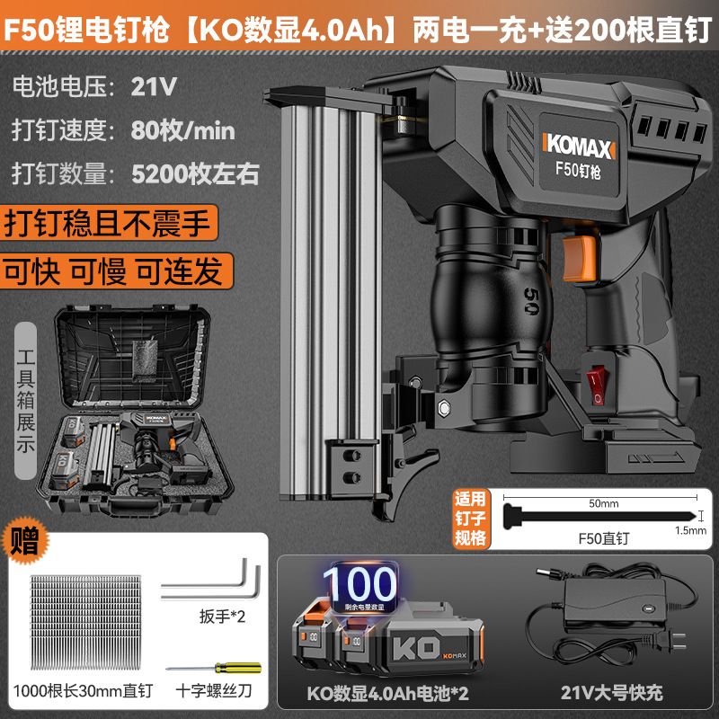 • F50 리튬 배터리 네일건 [KO 디지털 디스플레이 4.0Ah] 배터리 2개 및 충전기 1개 + 무료 직선 손톱 200개