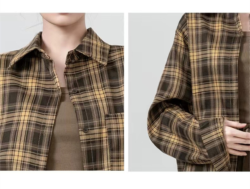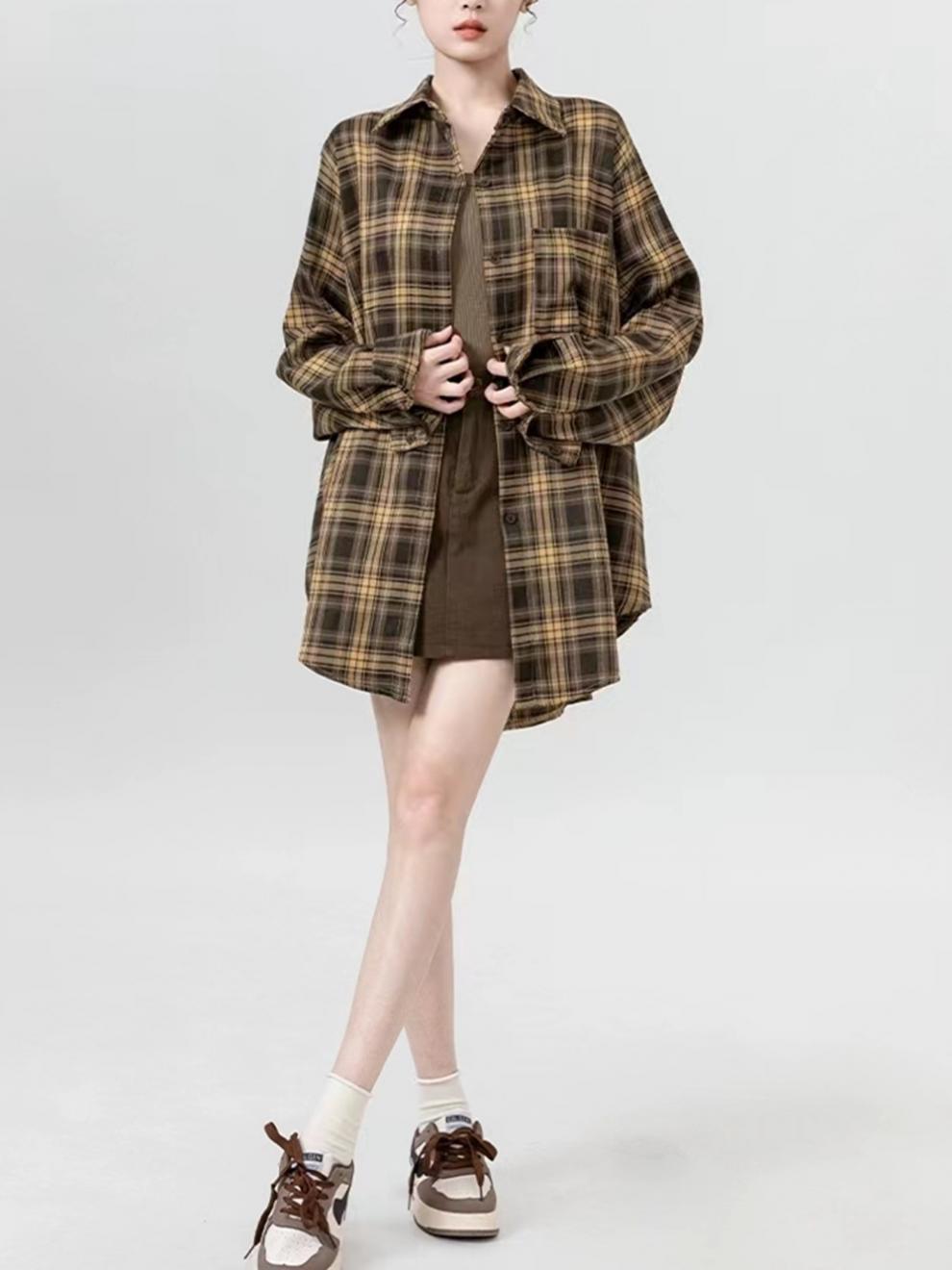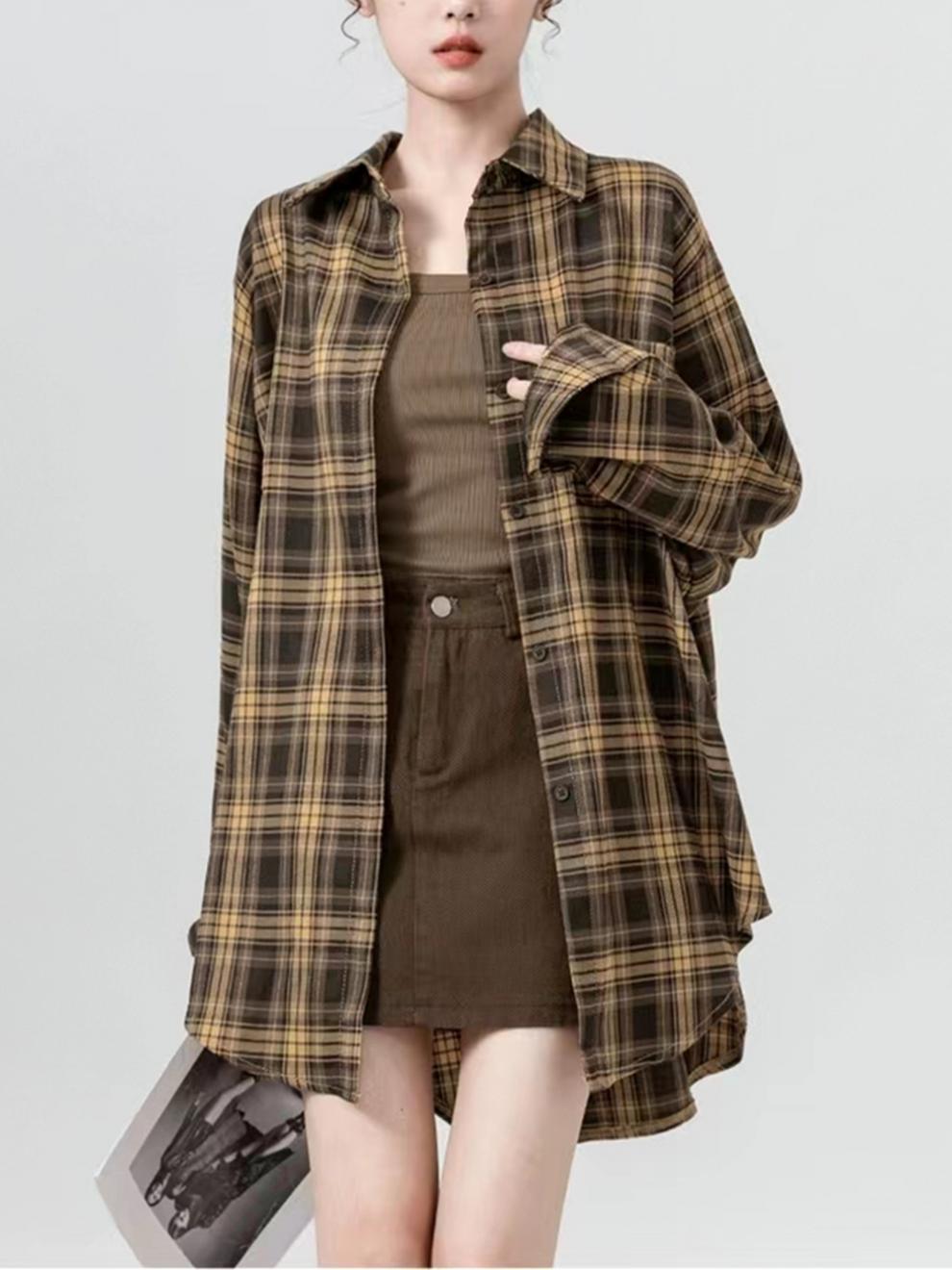 여성을위한 레트로 폴로 칼라 격자 무늬 긴팔 셔츠 재킷 2024 가을 새로운 Maillard 중간 길이 캐주얼 셔츠