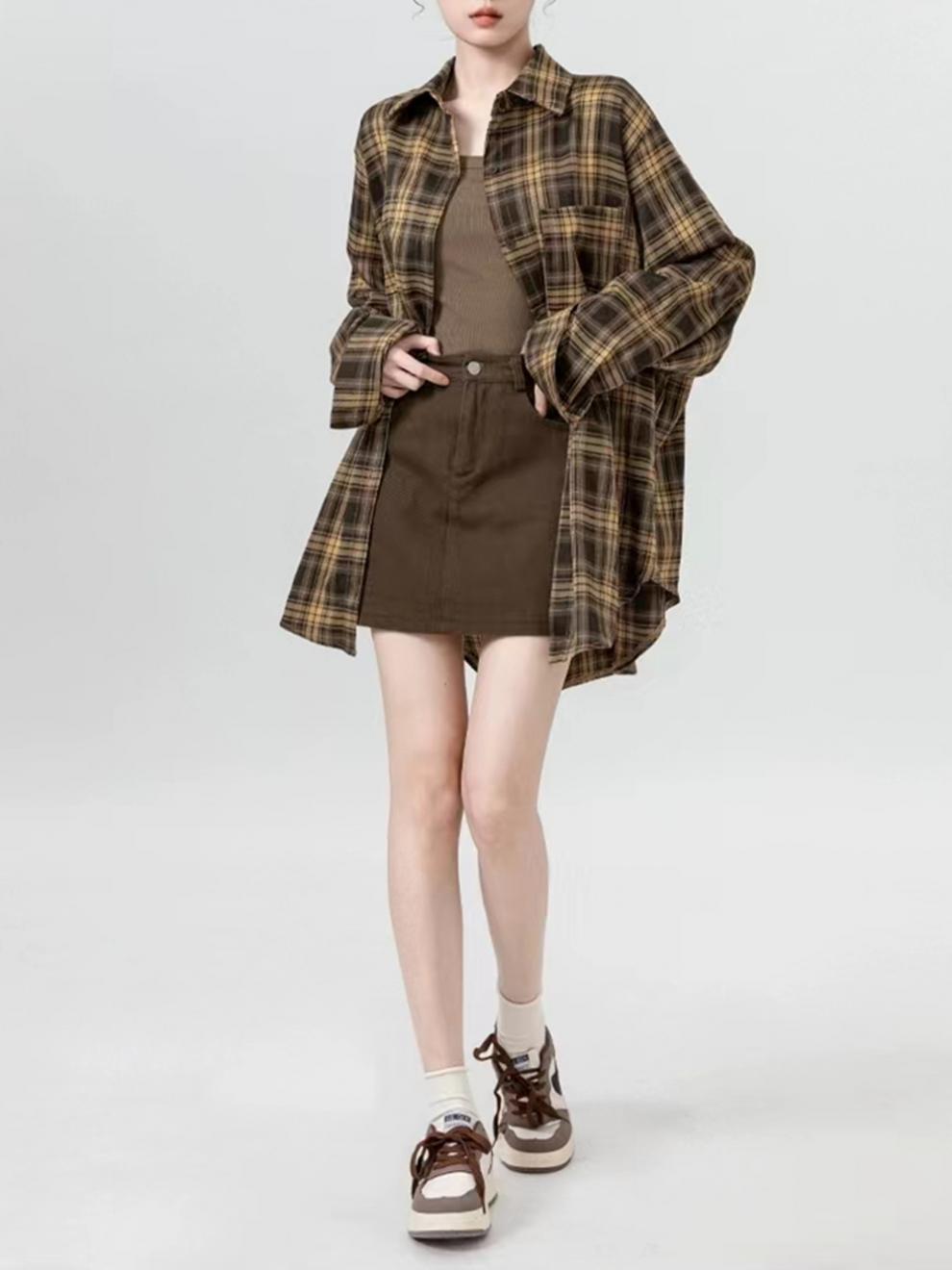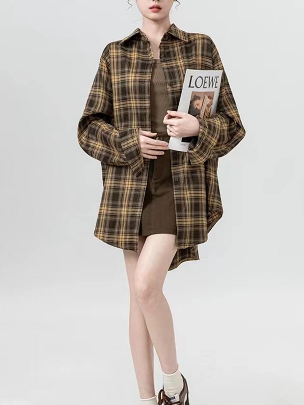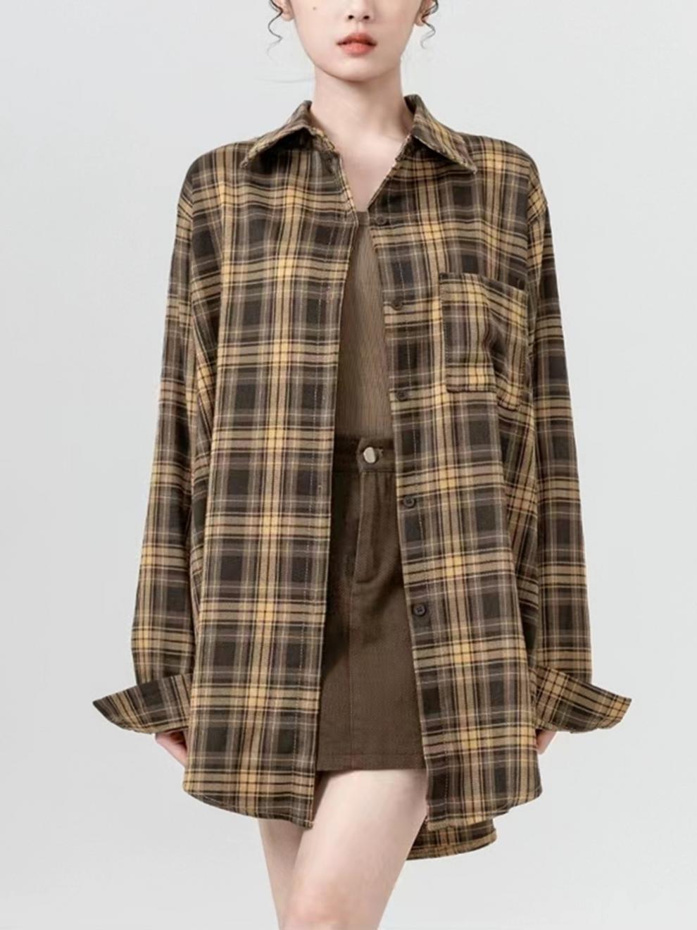 여성을위한 레트로 폴로 칼라 격자 무늬 긴팔 셔츠 재킷 2024 가을 새로운 Maillard 중간 길이 캐주얼 셔츠