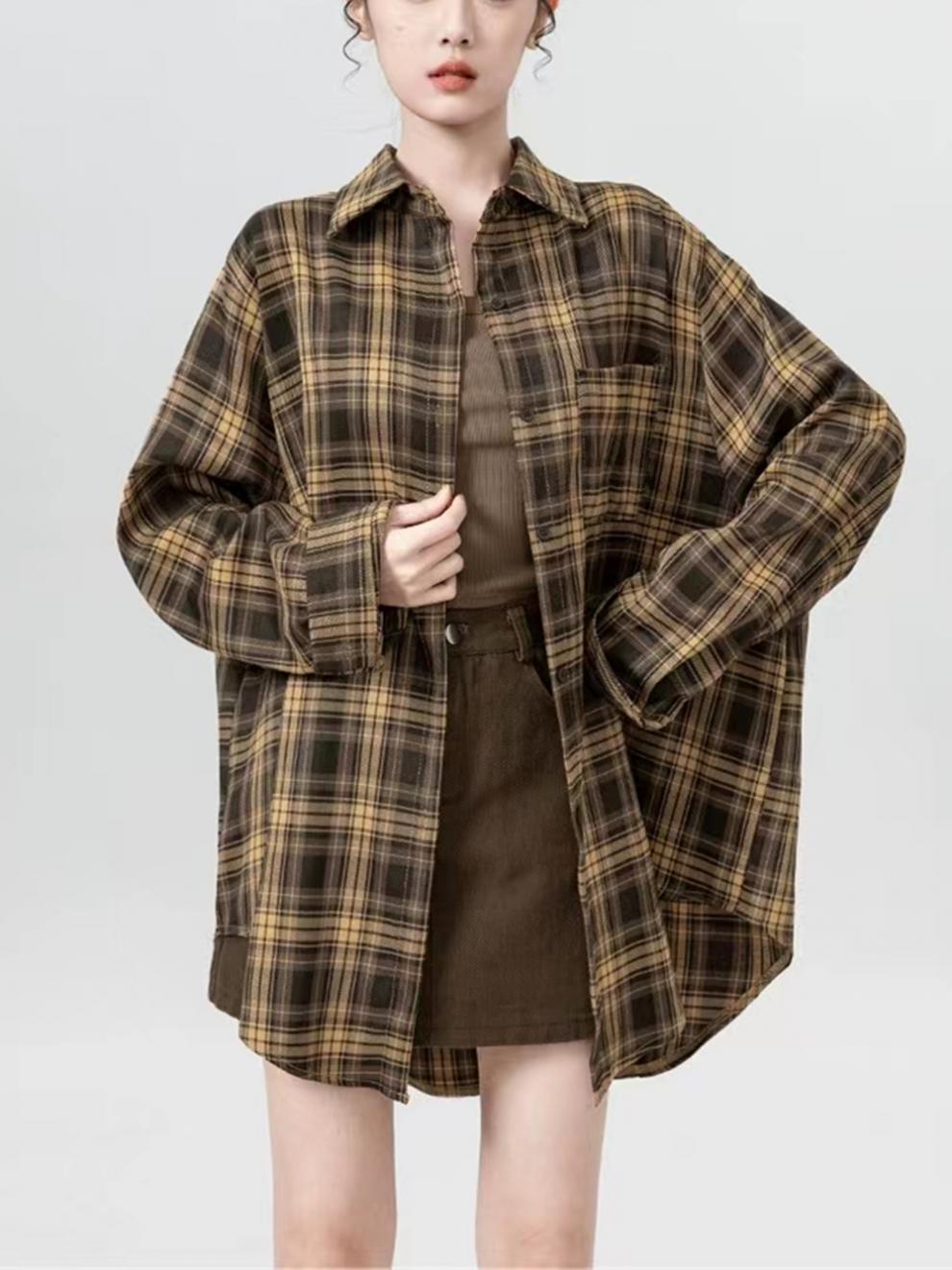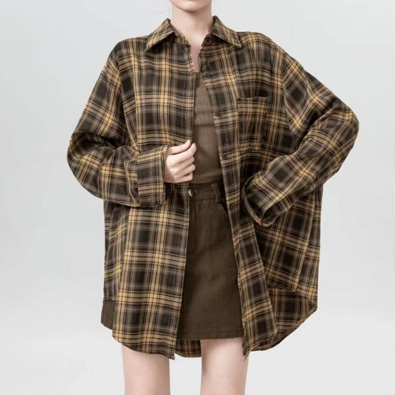 여성을위한 레트로 폴로 칼라 격자 무늬 긴팔 셔츠 재킷 2024 가을 새로운 Maillard 중간 길이 캐주얼 셔츠스토어 가기