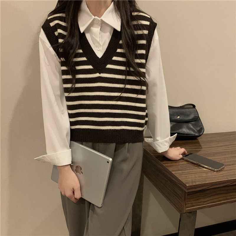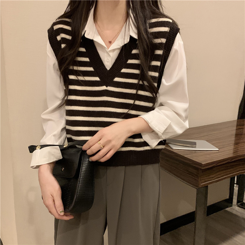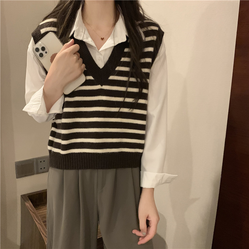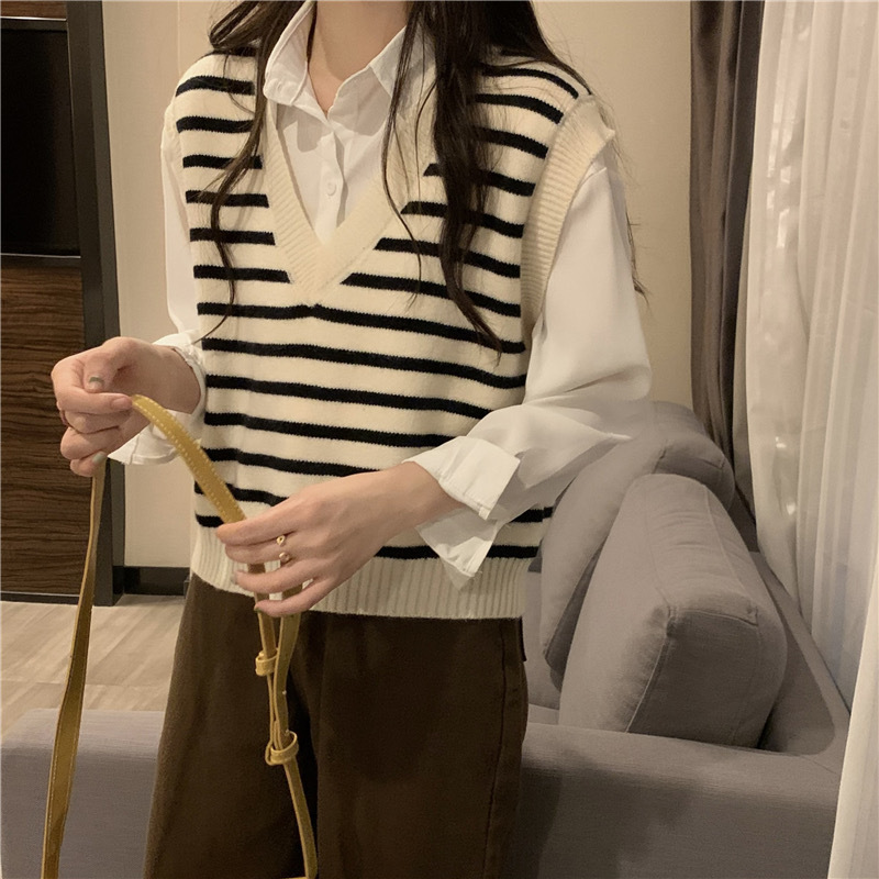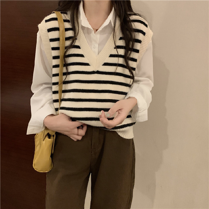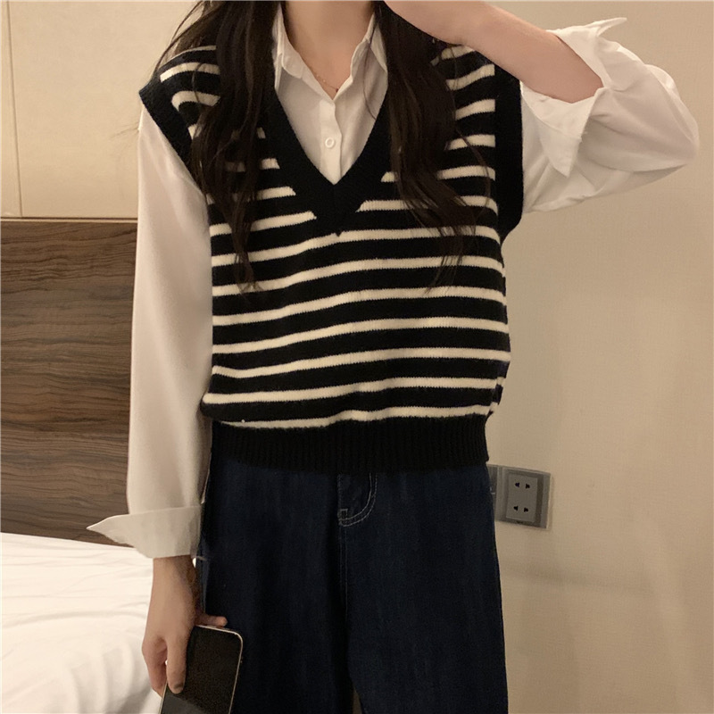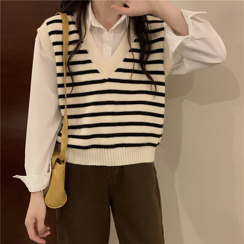 흑백 스트라이프 브이넥 조끼 레이어드 니트 여성 초가을 2025년 신상 루즈핏 상의