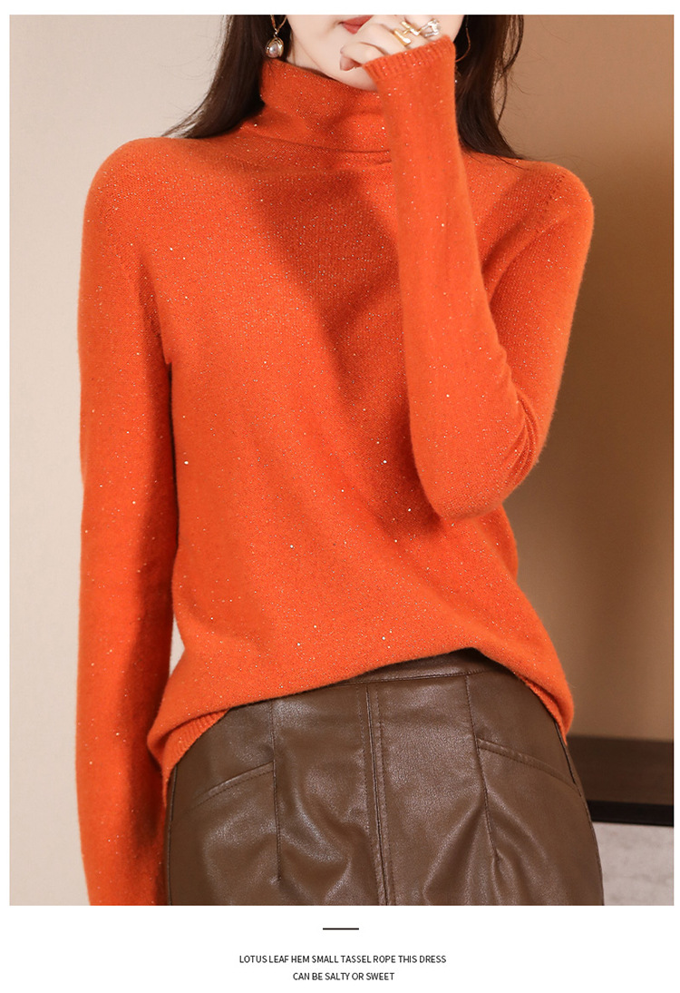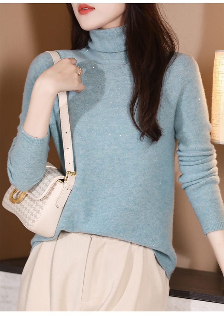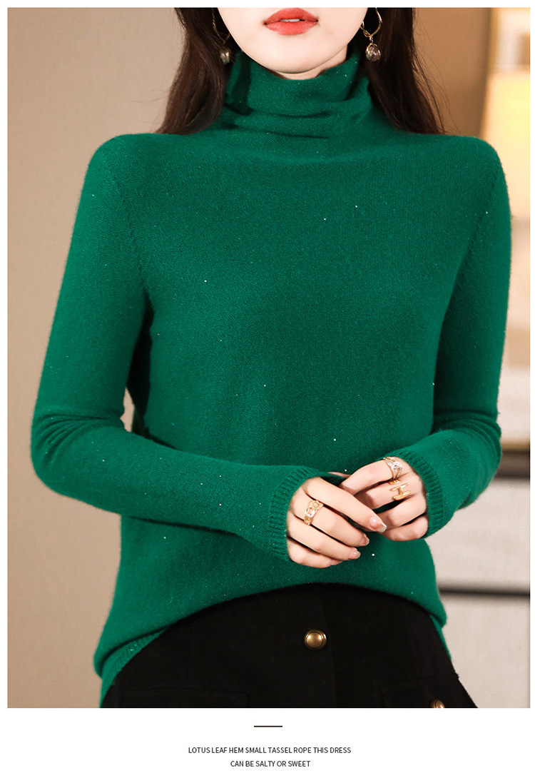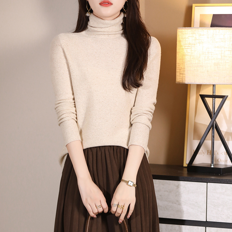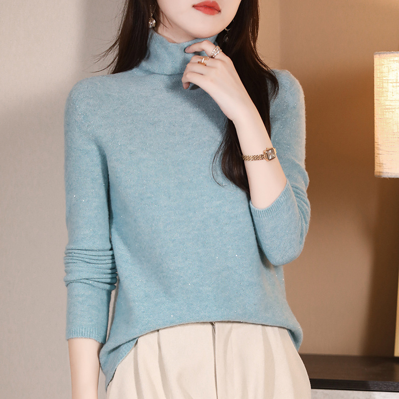 빛나는 밝은 더미 칼라 풀 울 스웨터 여성용 터틀넥 스웨터 세련된 내부 니트베이스 셔츠 기본