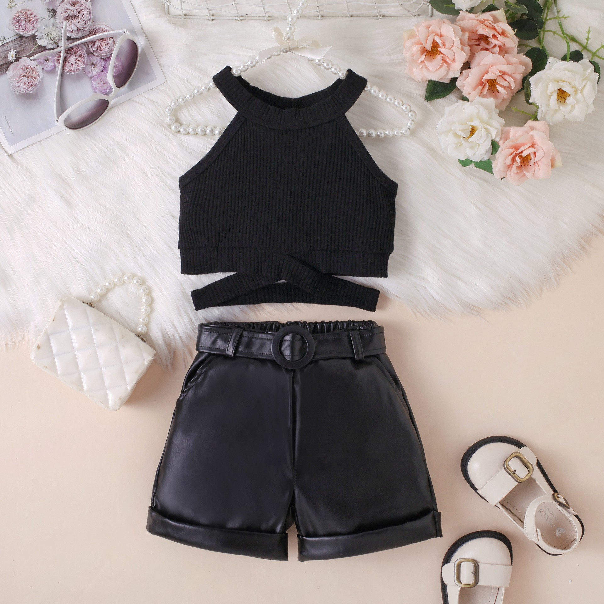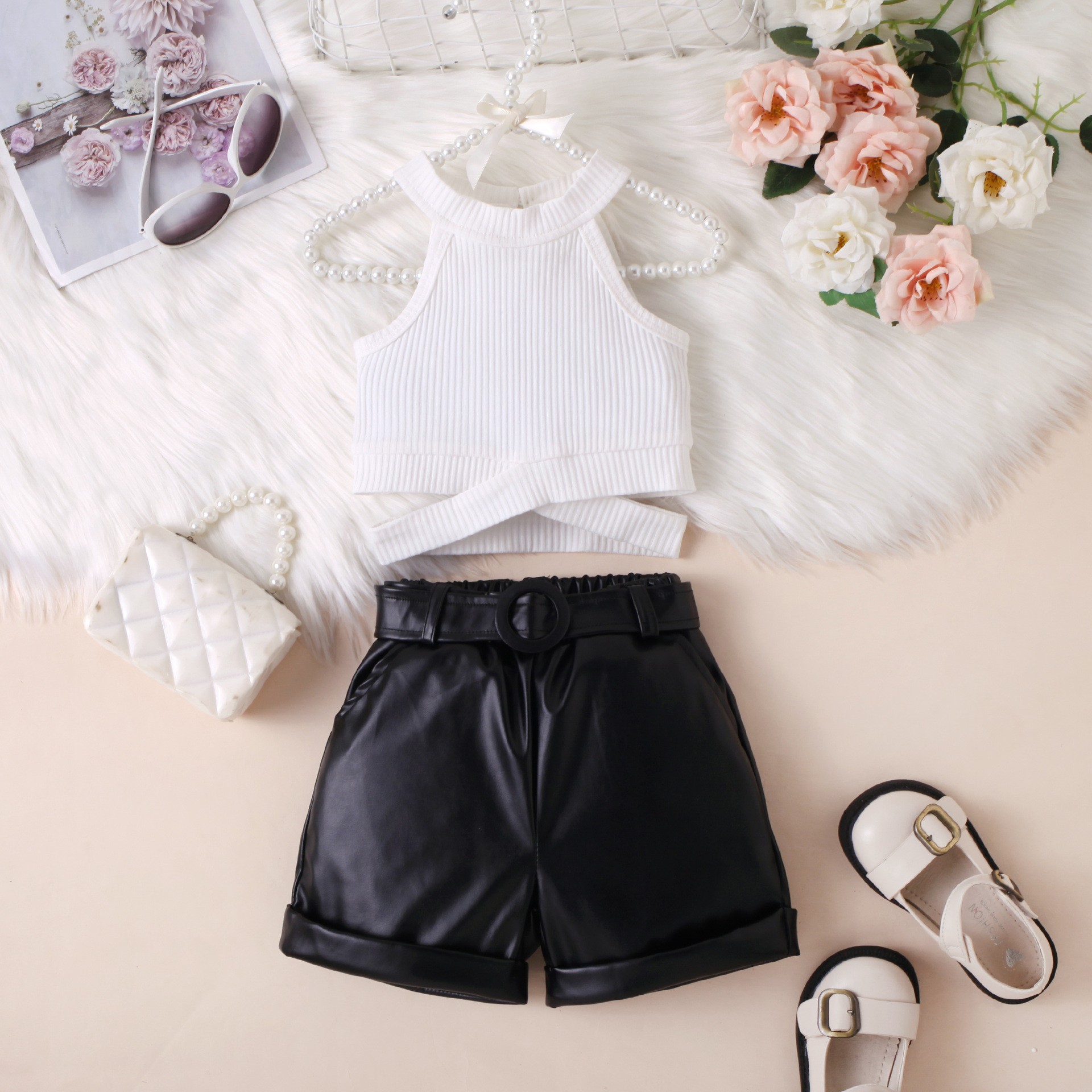 2025 새로운 여름 유럽과 미국 어린이의 단색 유행 팬 목 민소매 탑 PU 가죽 반바지 벨트 3 피스 세트