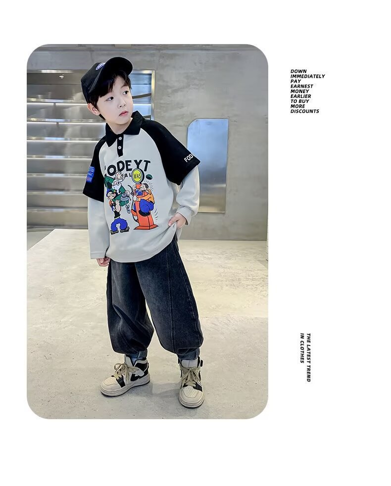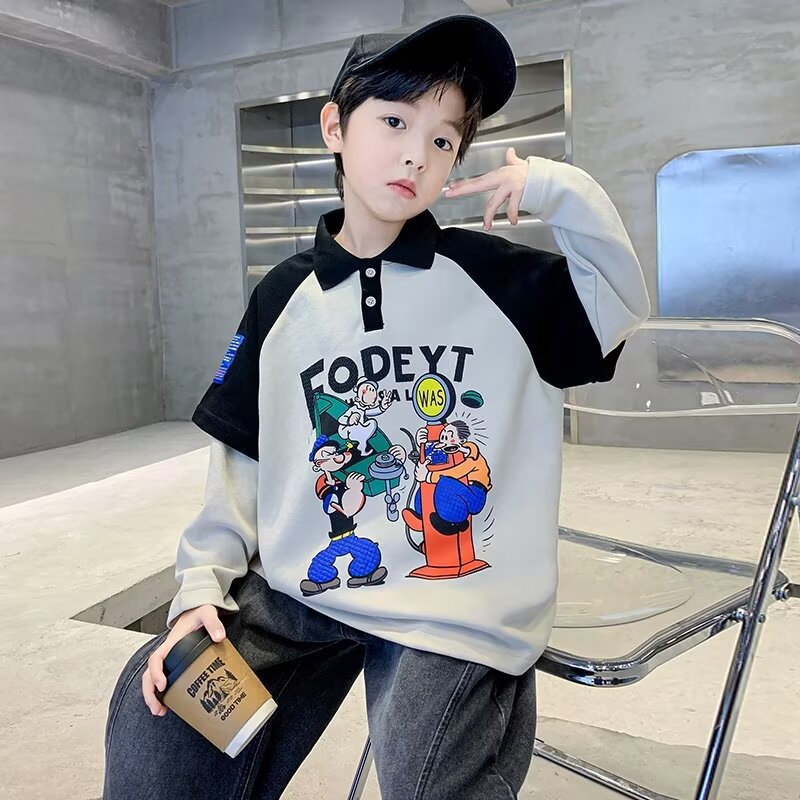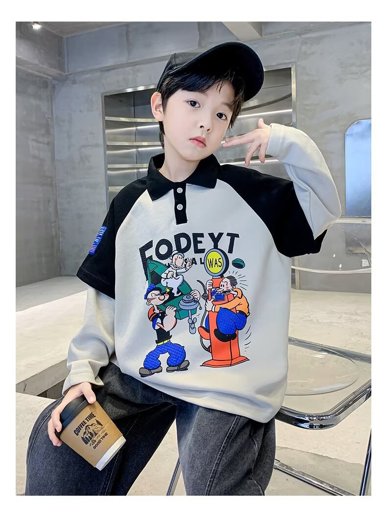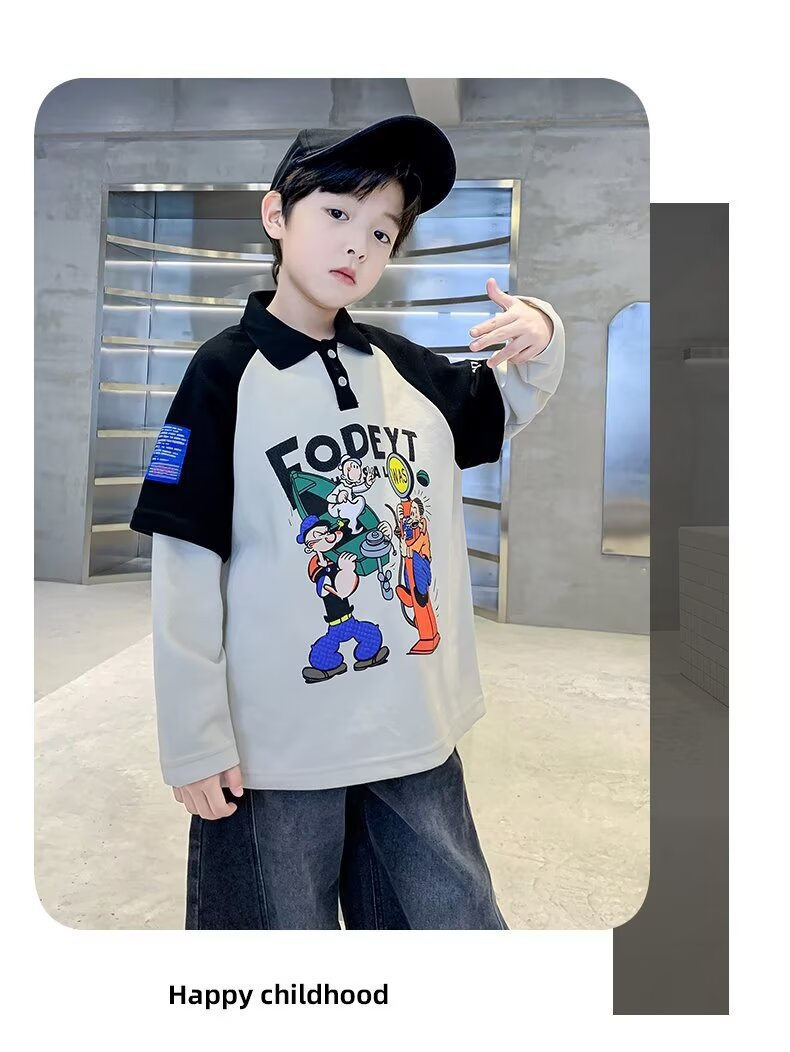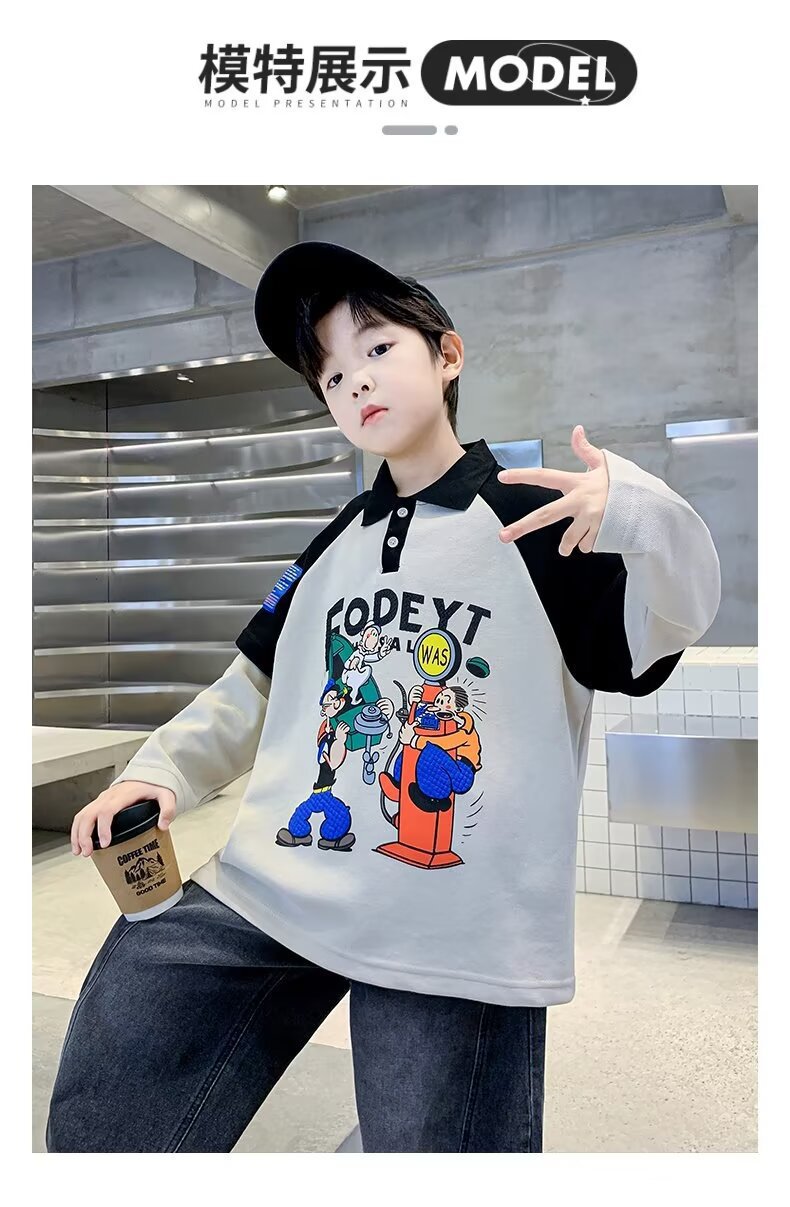 소년의 가짜 투피스 스웨터 봄과 가을 2024 새로운 아동복 큰 소년 가을 폴로 셔츠 긴 소매 티셔츠 조수스토어 가기