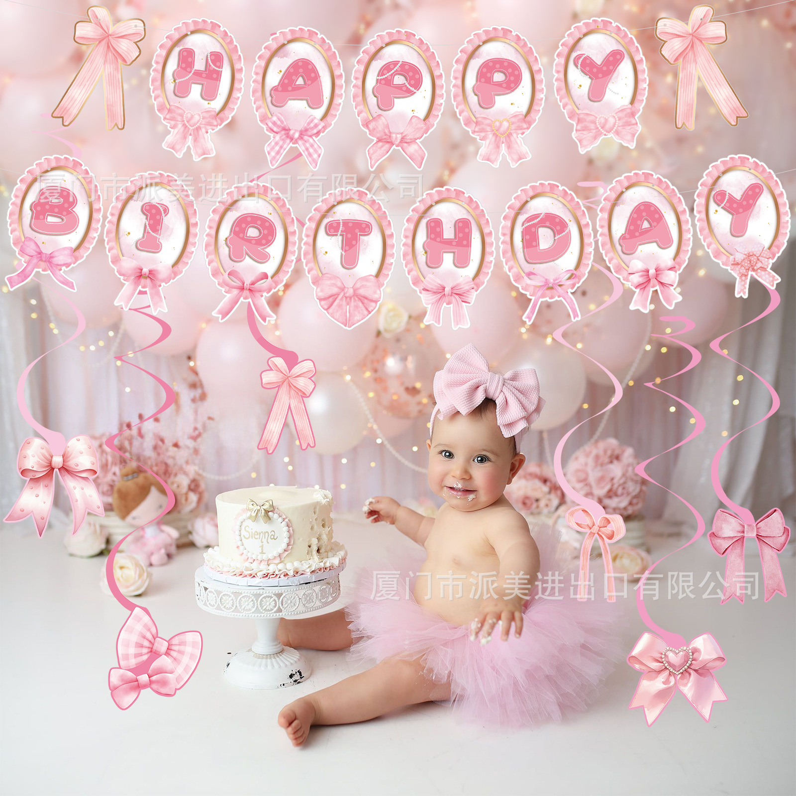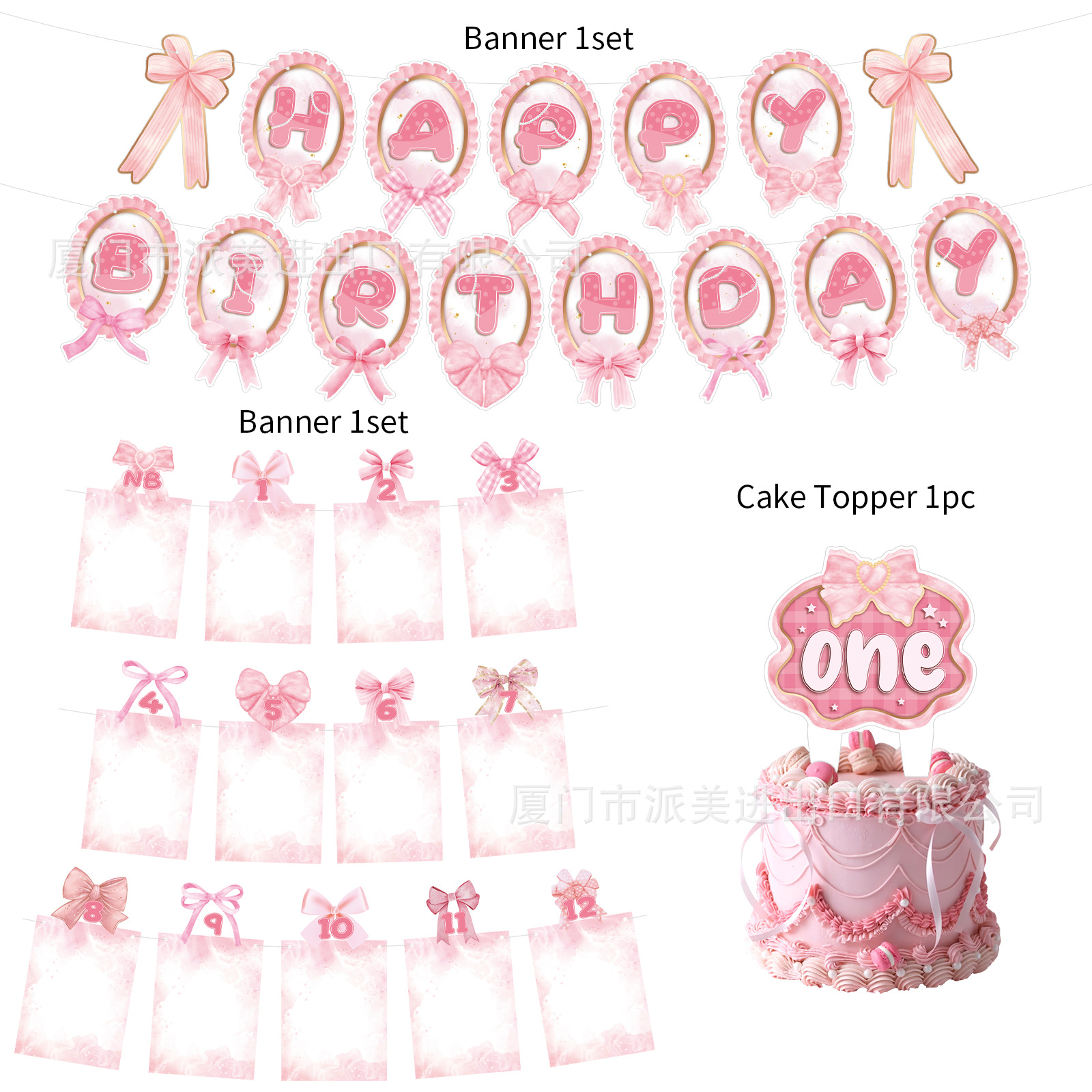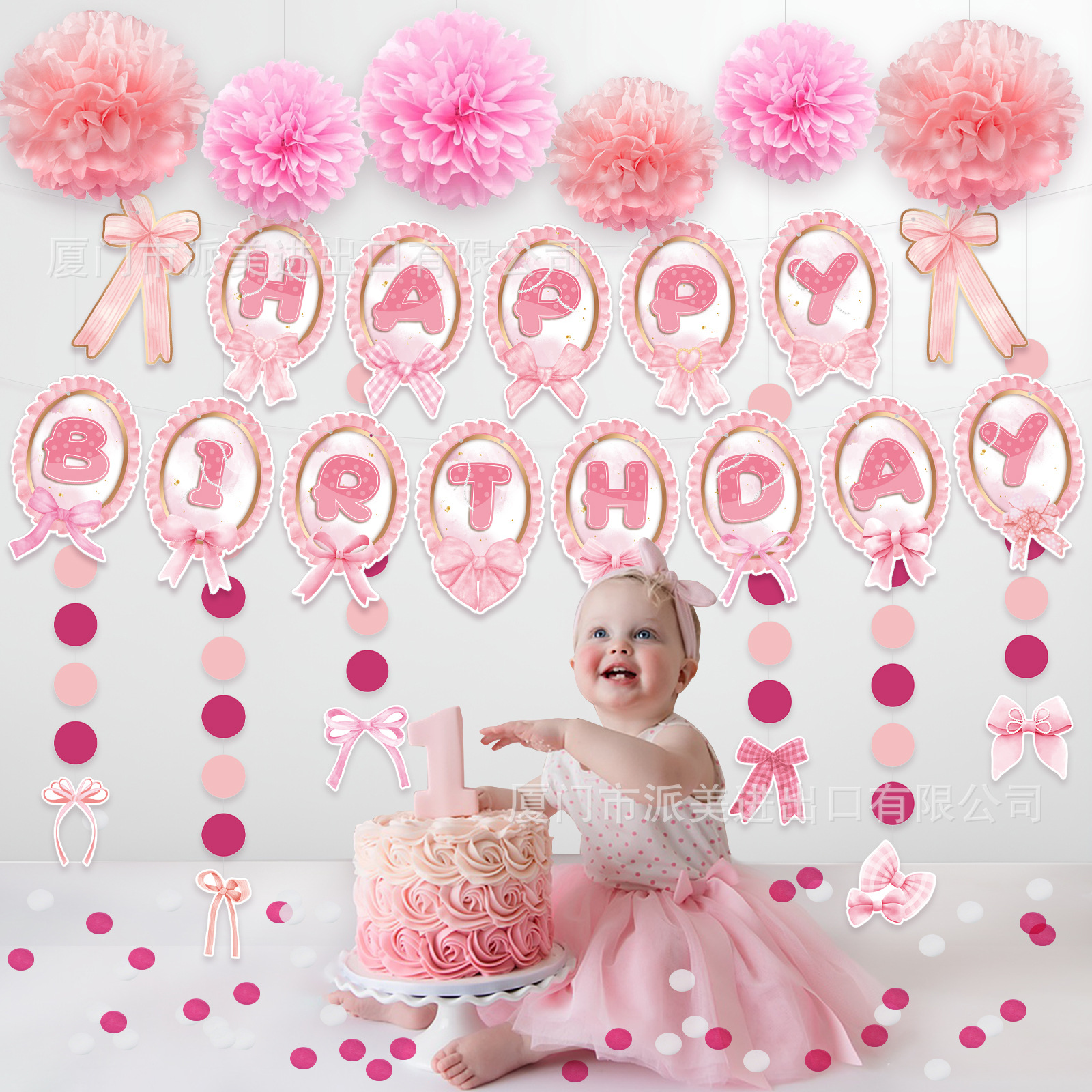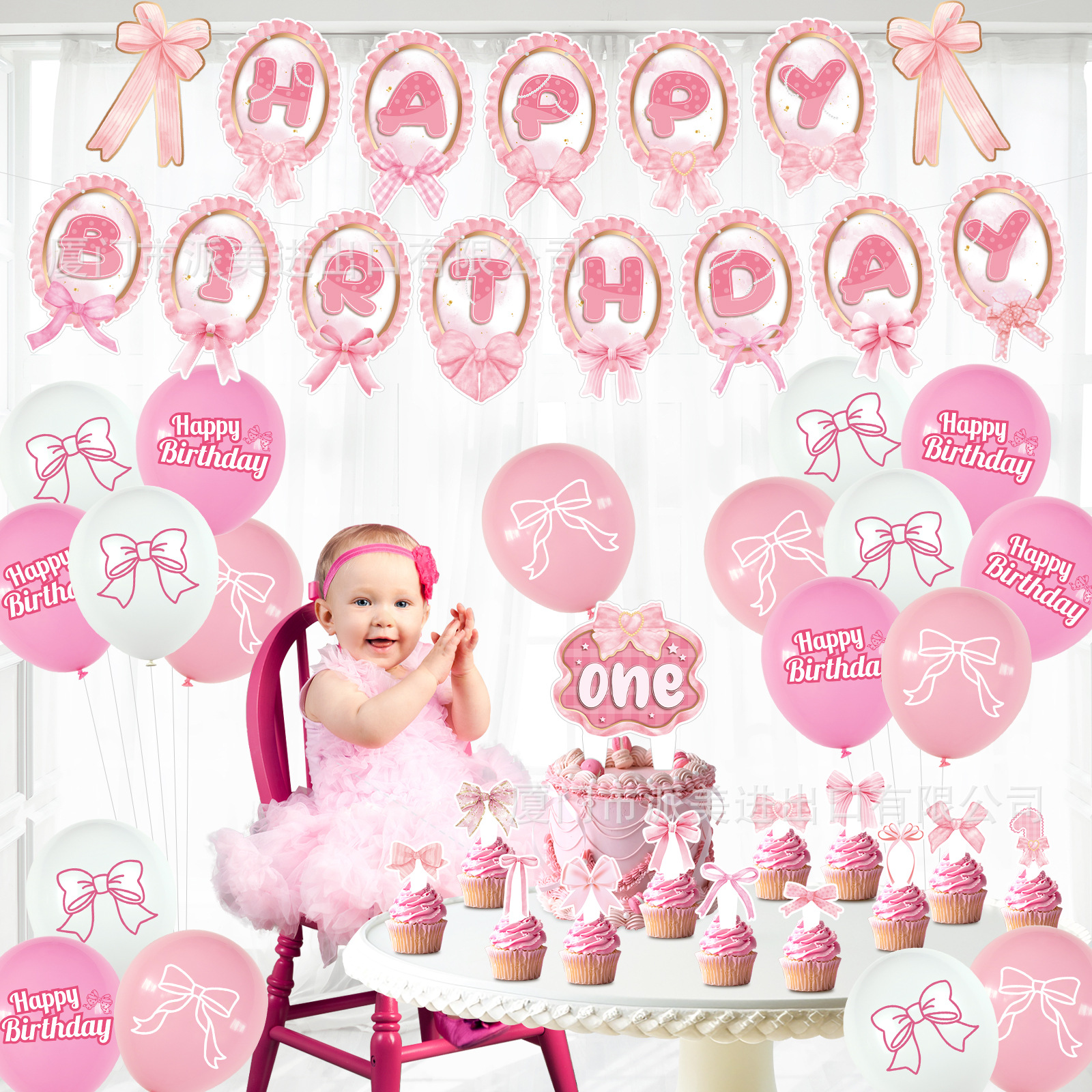1 년 된 핑크 활 테마 파티 장식 핑크 공주 장면 레이아웃 선물 가방 풀 플래그 크기 삽입