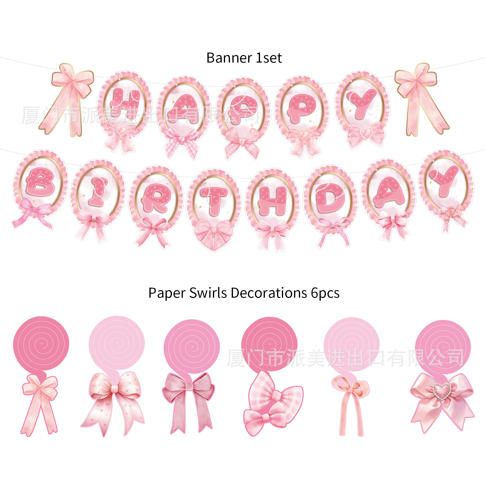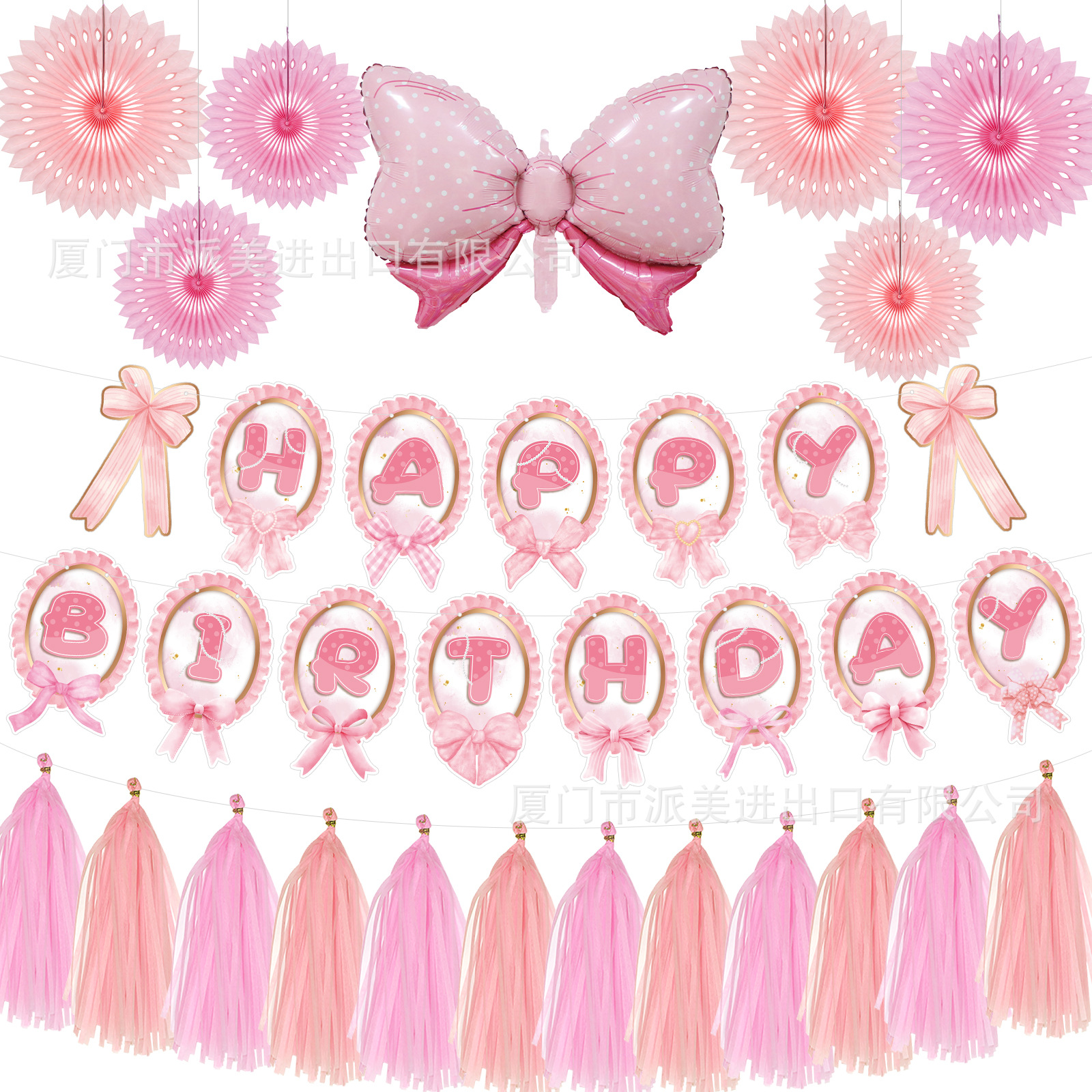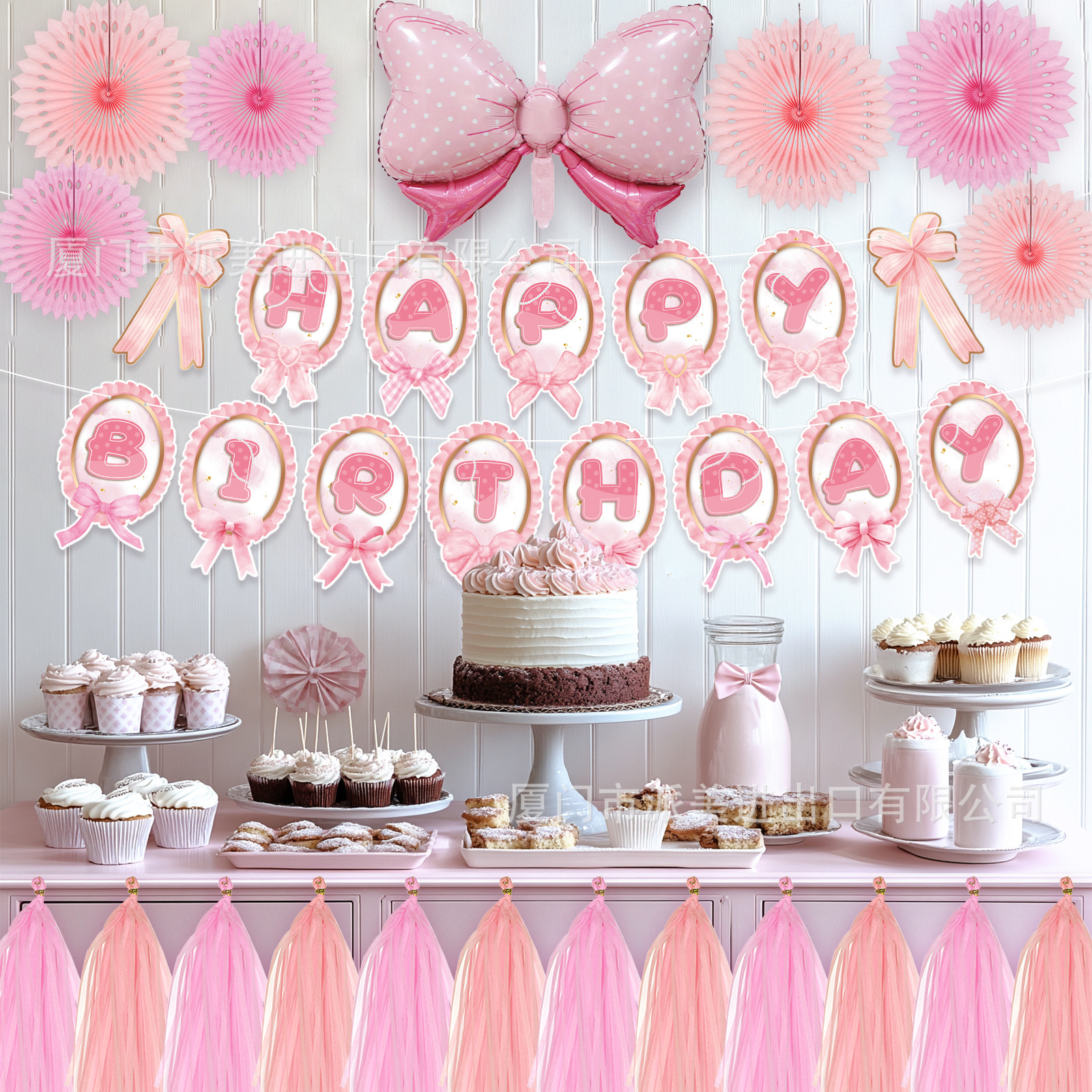 1 년 된 핑크 활 테마 파티 장식 핑크 공주 장면 레이아웃 선물 가방 풀 플래그 크기 삽입