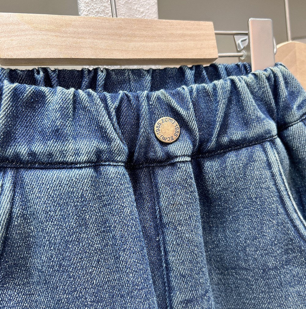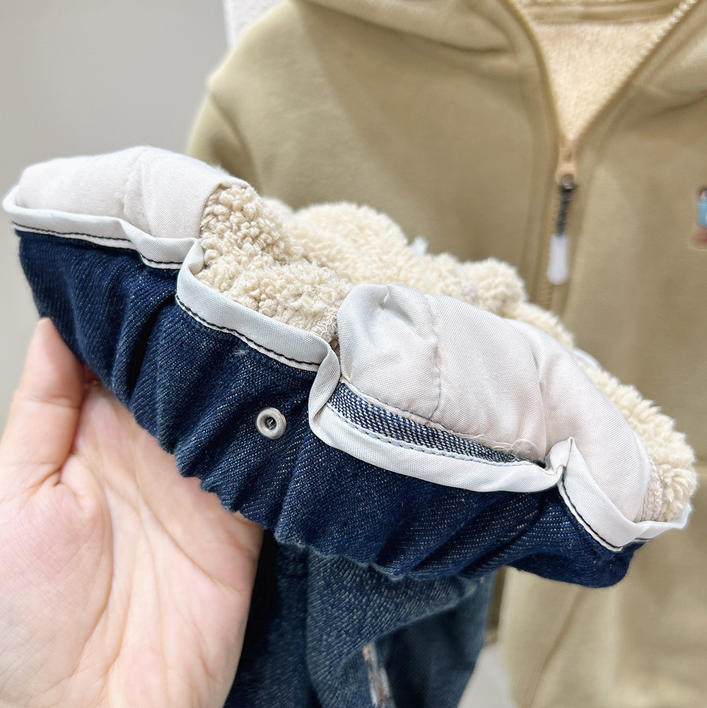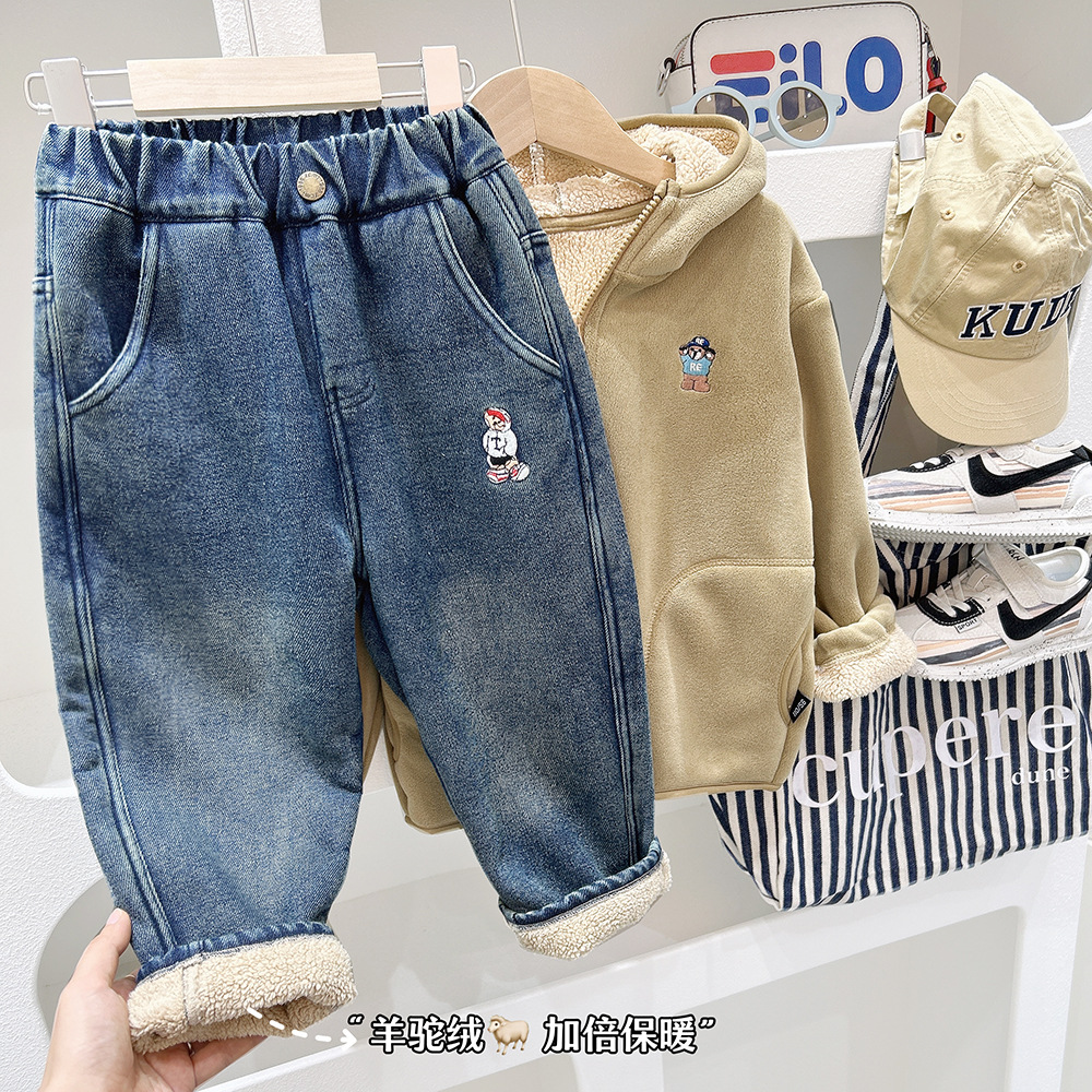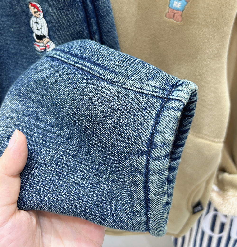 어린이 기모 청바지 2024 가을과 겨울 새로운 소년 두꺼운 따뜻한 바지 아기 만화 자수 바지 조수스토어 가기