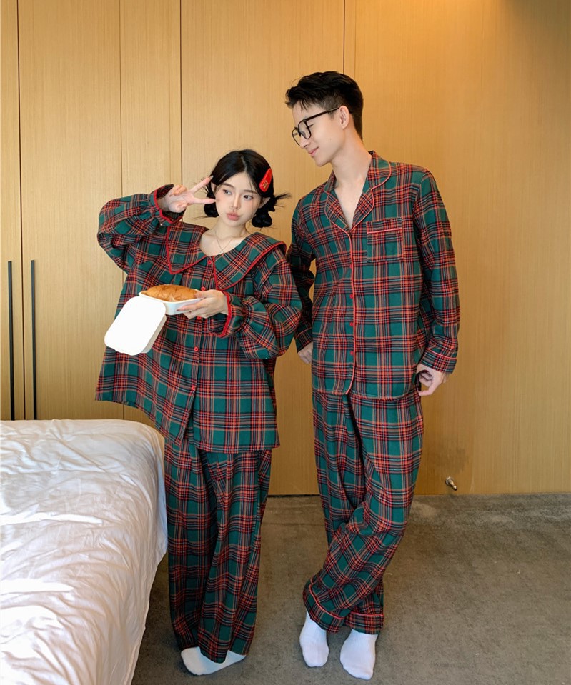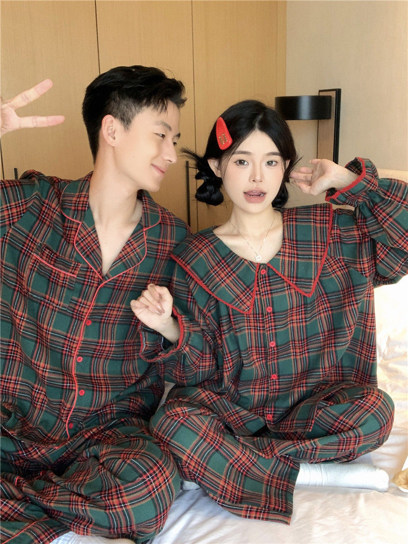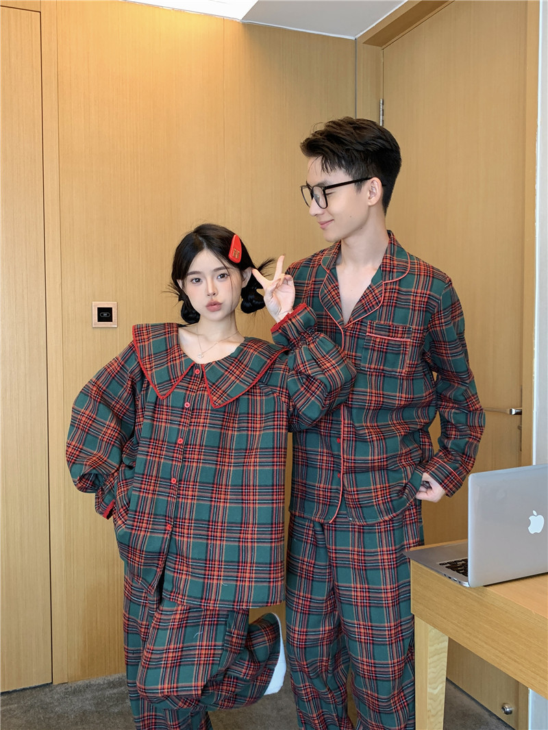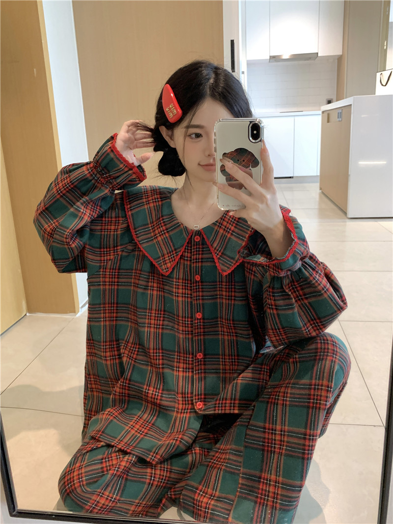 한국 가을 새 커플 크리스마스 체크 무늬 홈 옷 귀여운 큰 옷깃 긴 소매 느슨한 파자마 세트