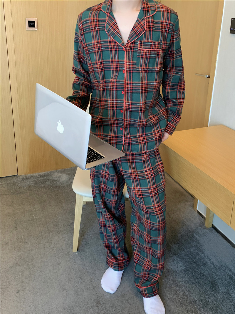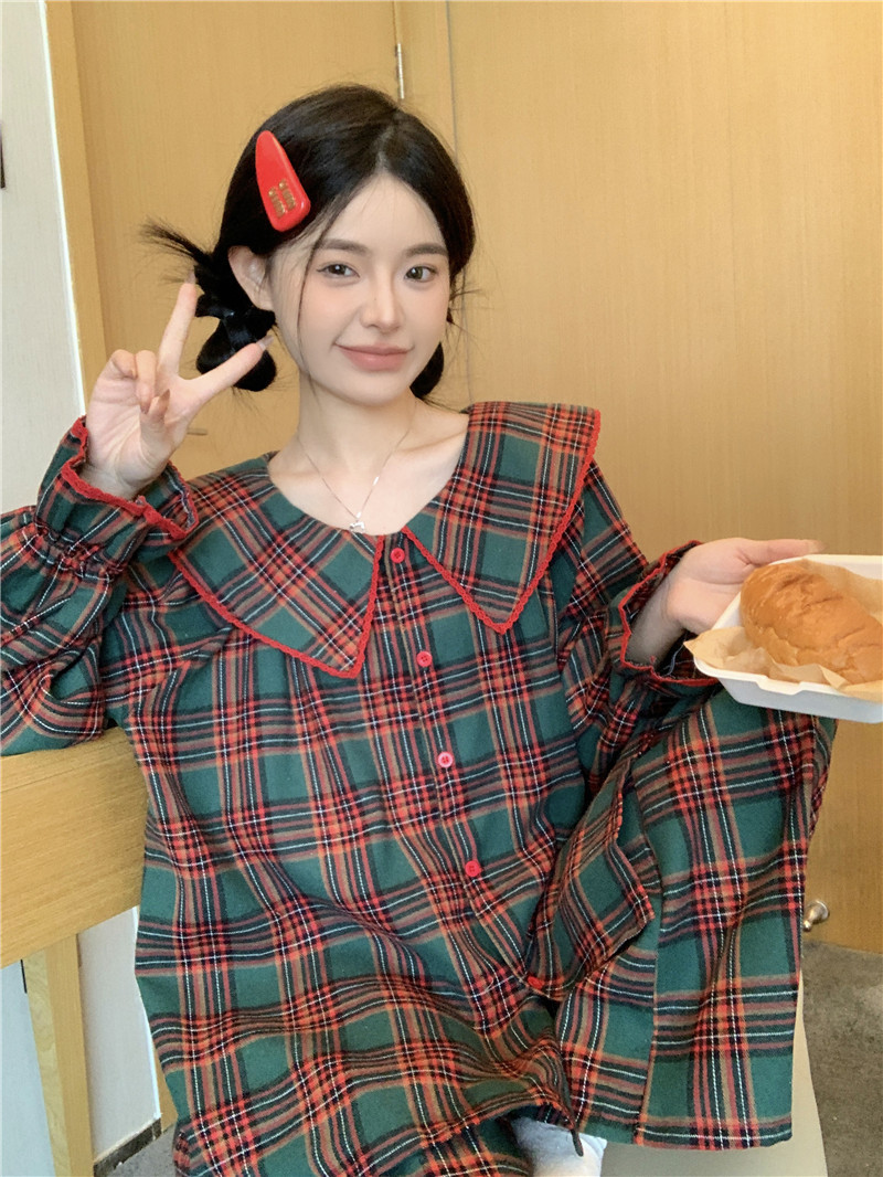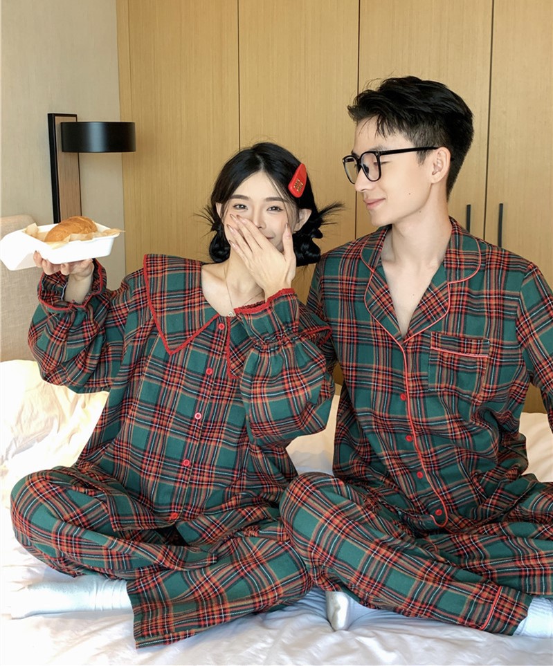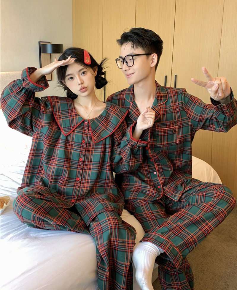 한국 가을 새 커플 크리스마스 체크 무늬 홈 옷 귀여운 큰 옷깃 긴 소매 느슨한 파자마 세트