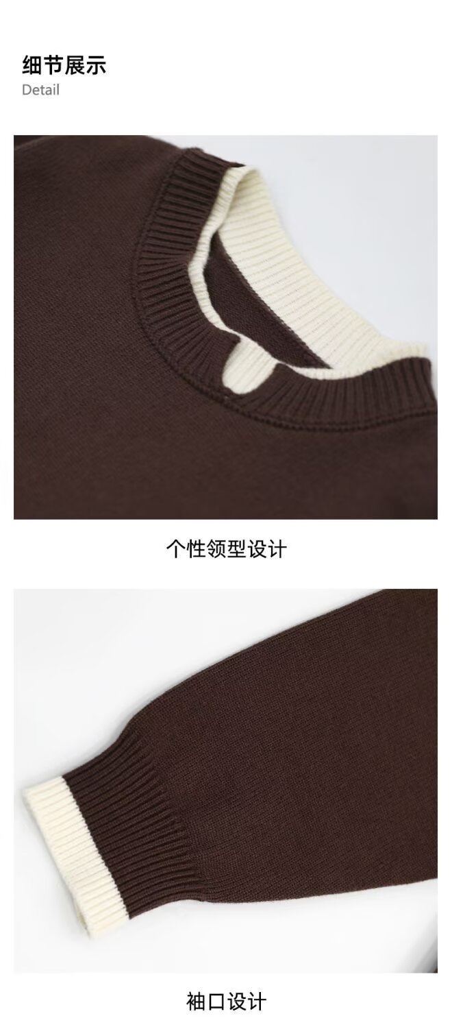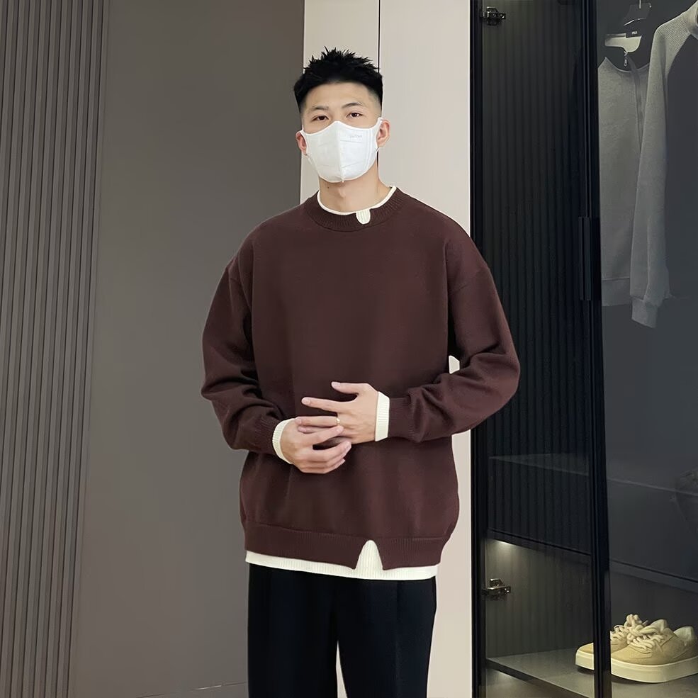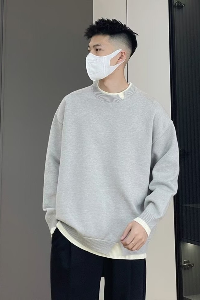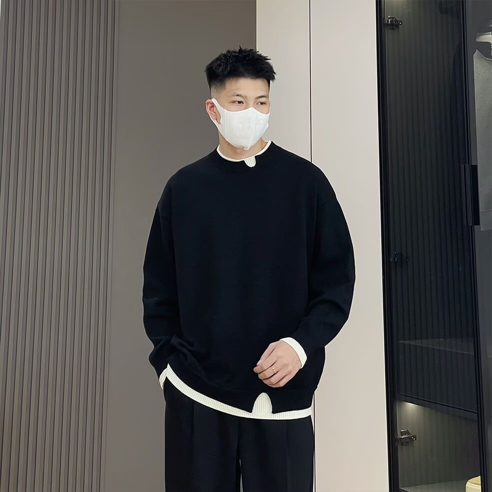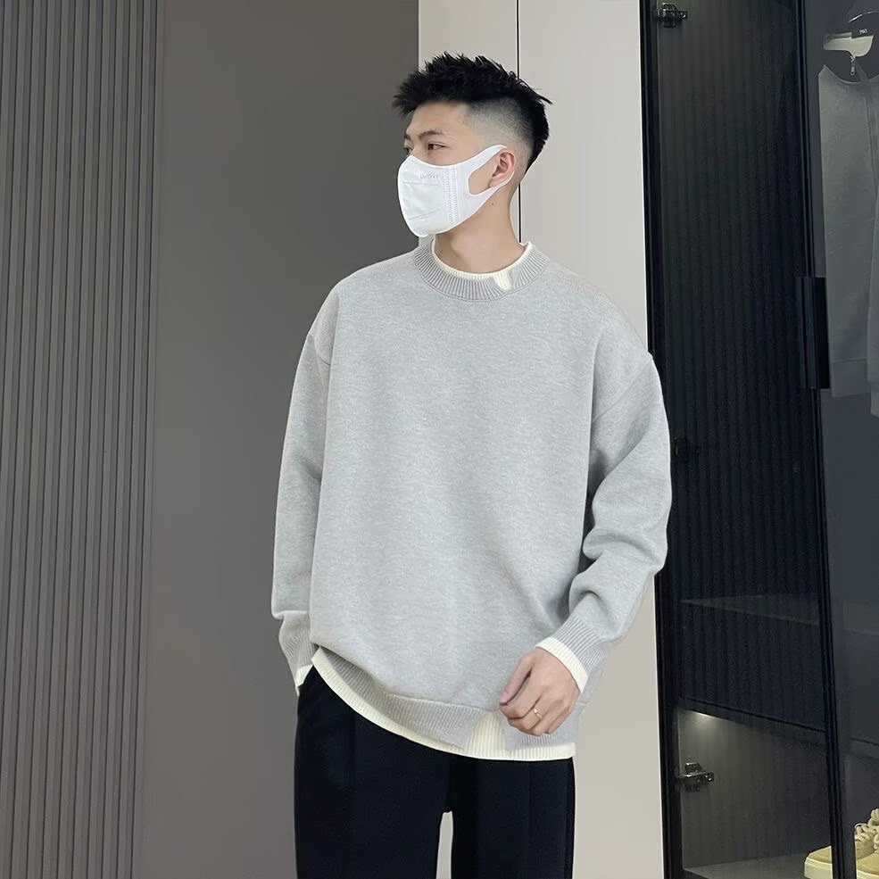 가을과 겨울 가짜 2 피스 스티칭 크루 넥 스웨터 느슨한 유행 단색 고급 간단한 캐주얼 니트 스웨터