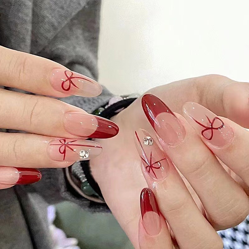 인터넷 연예인 폭발적인 붉은 프랑스 활 네일 아트 스티커 버건디 선물 상자 리본 부드러운 새해 결혼식 네일 스티커스토어 가기