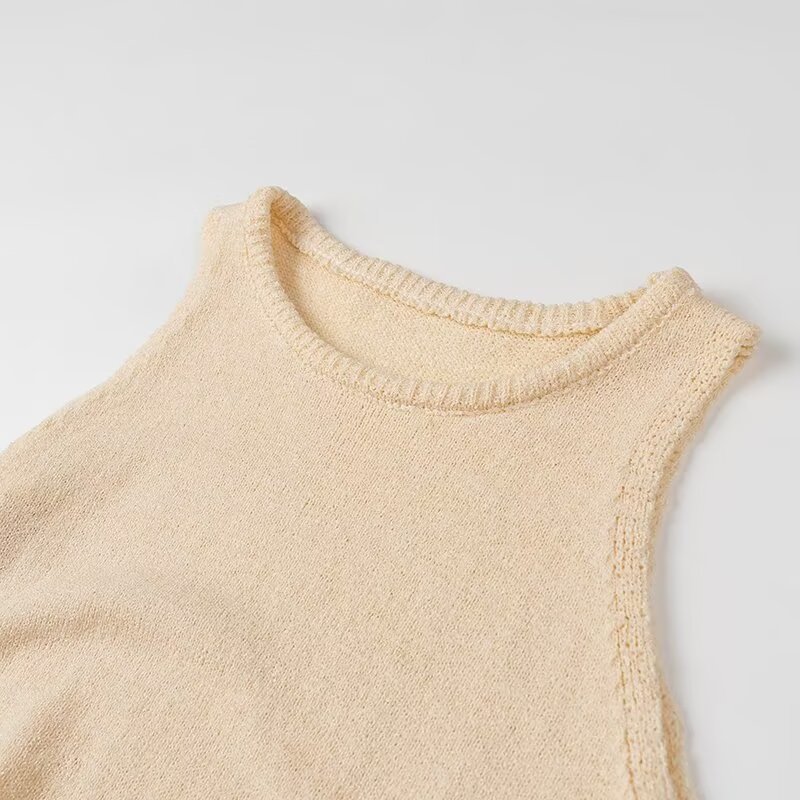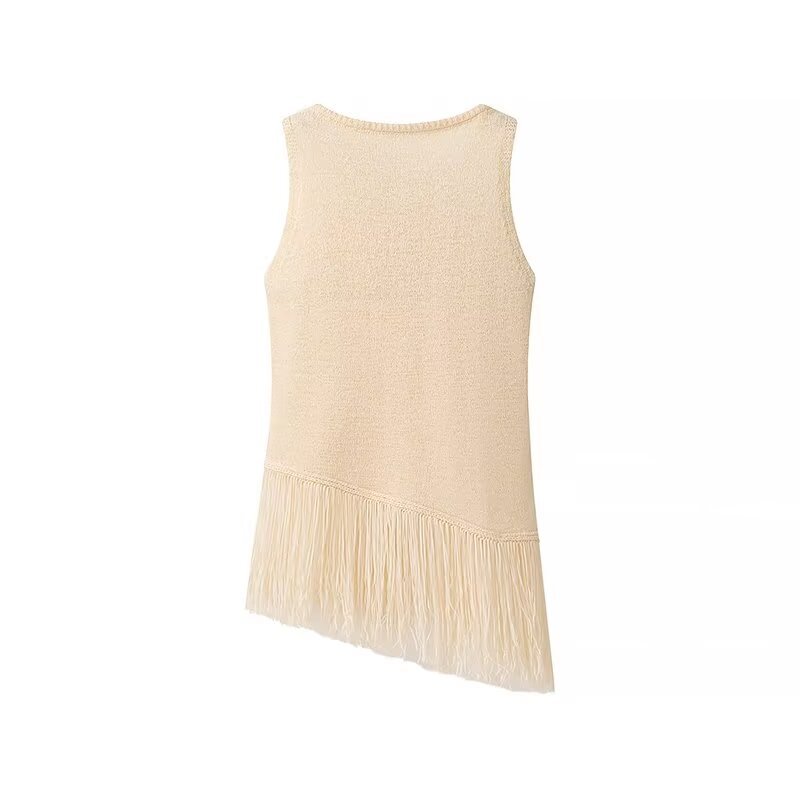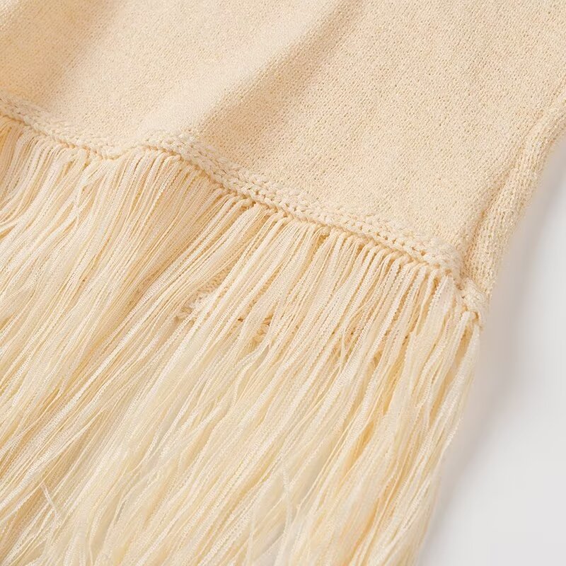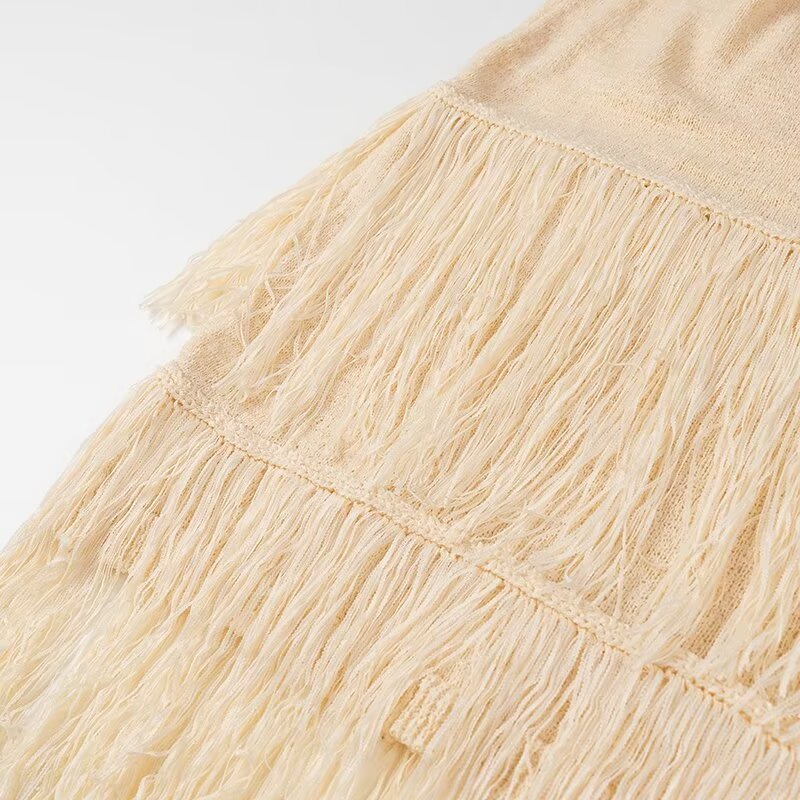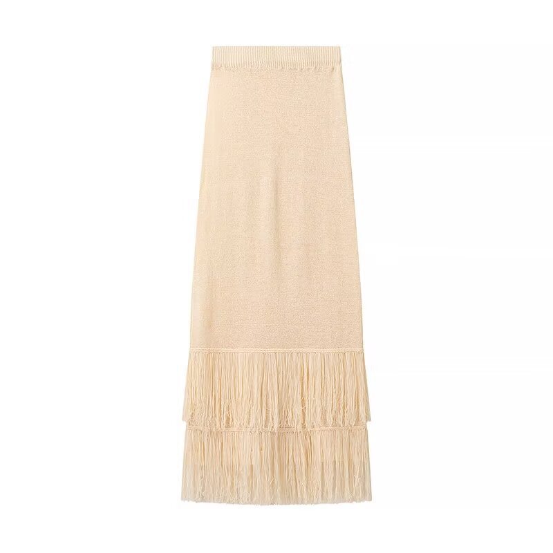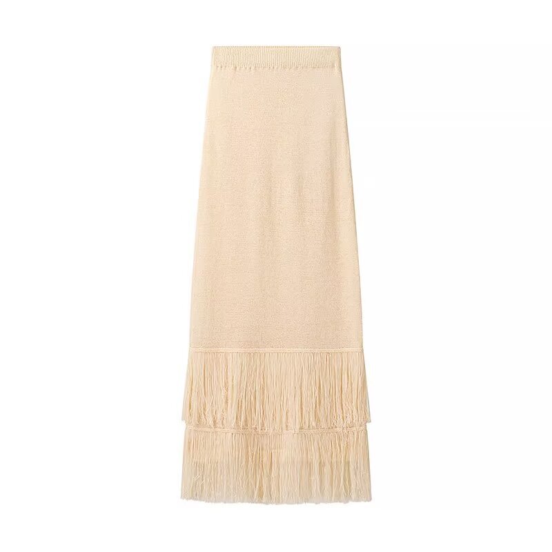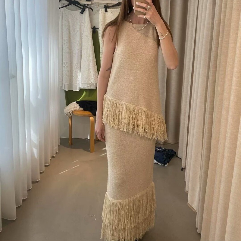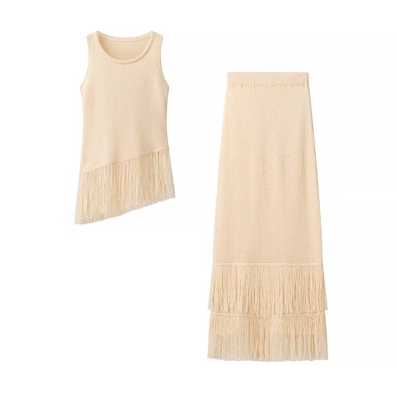 ZA 국경 여성 의류 도매 프랑스 고급 니트 세트 둥근 목 민소매 술 스웨터 스커트스토어 가기