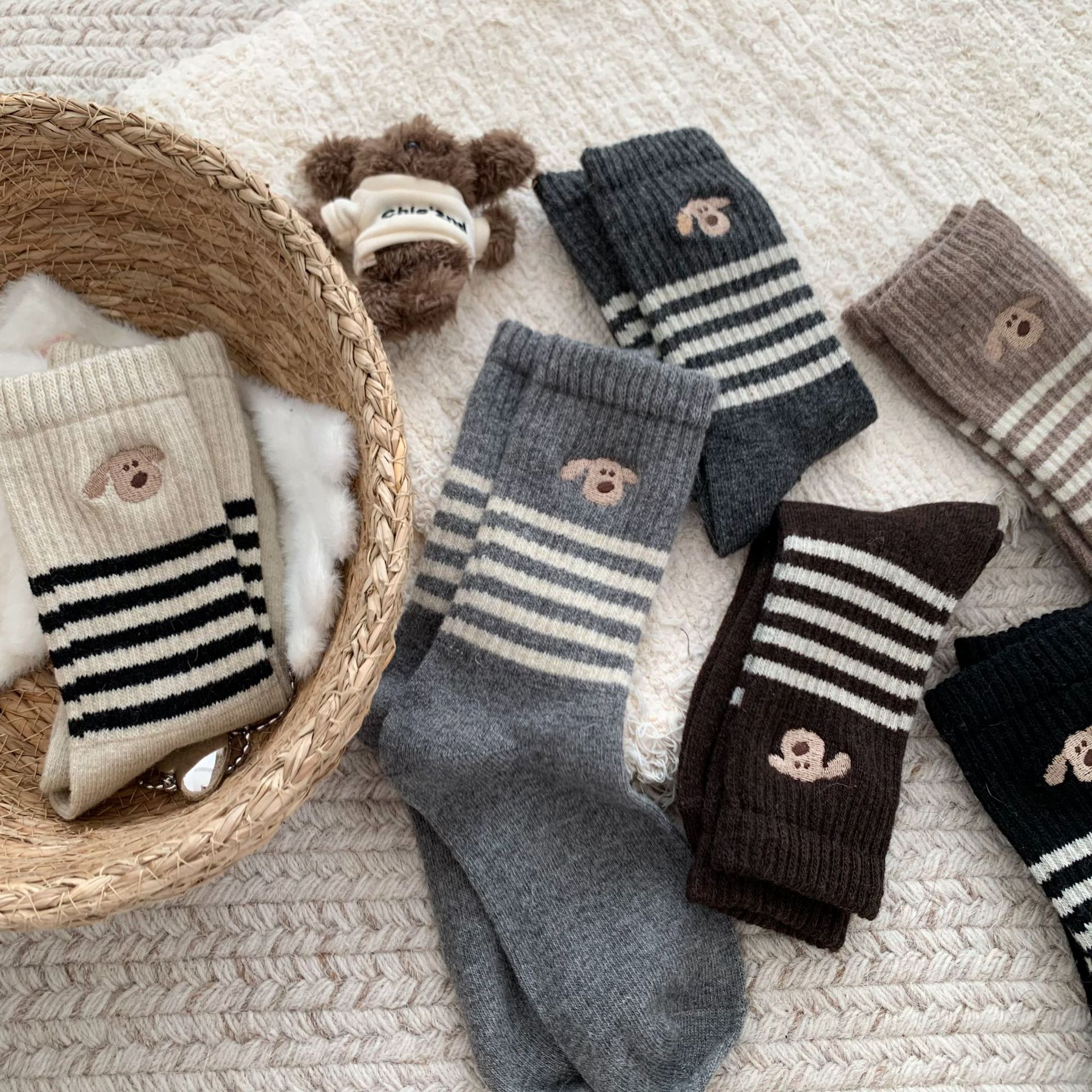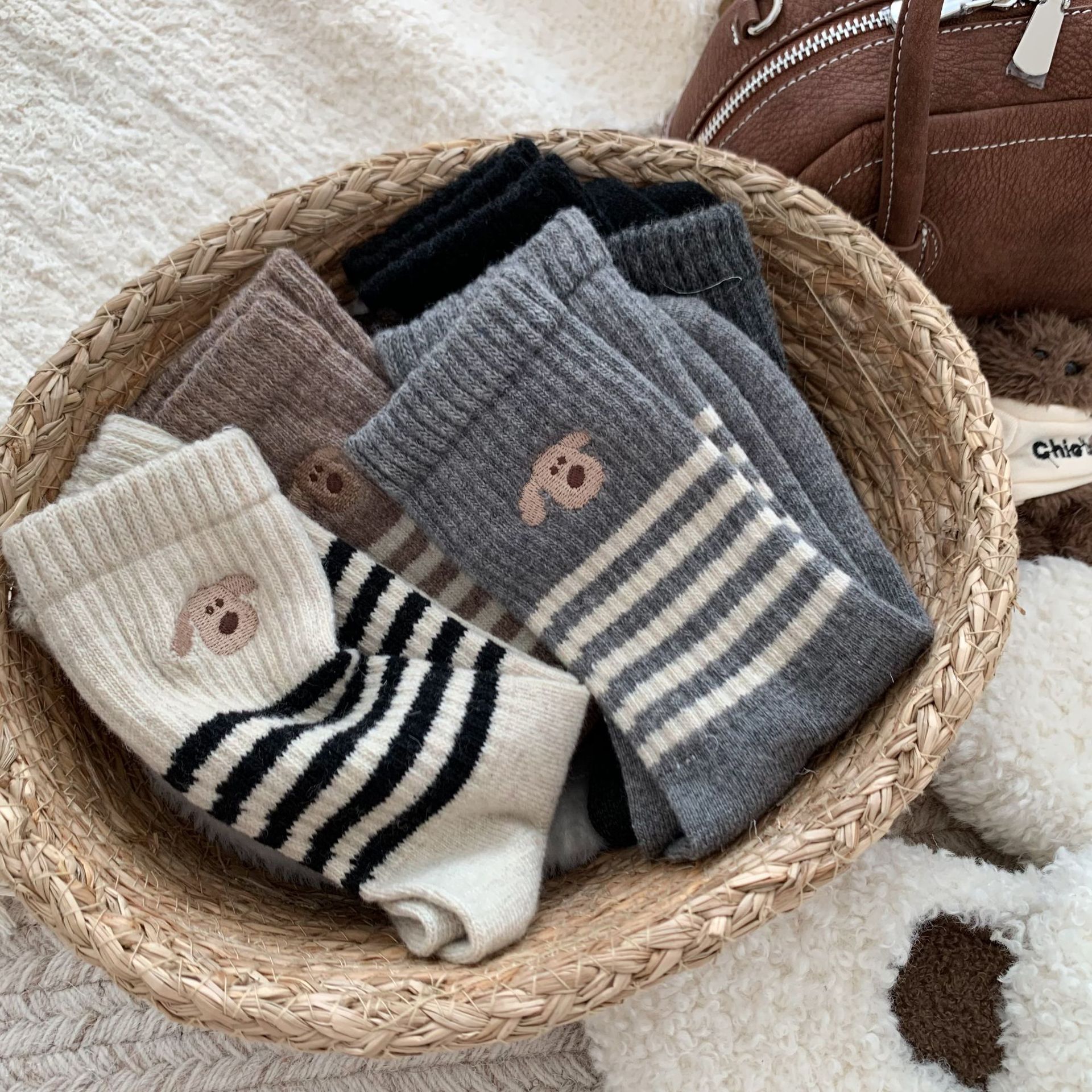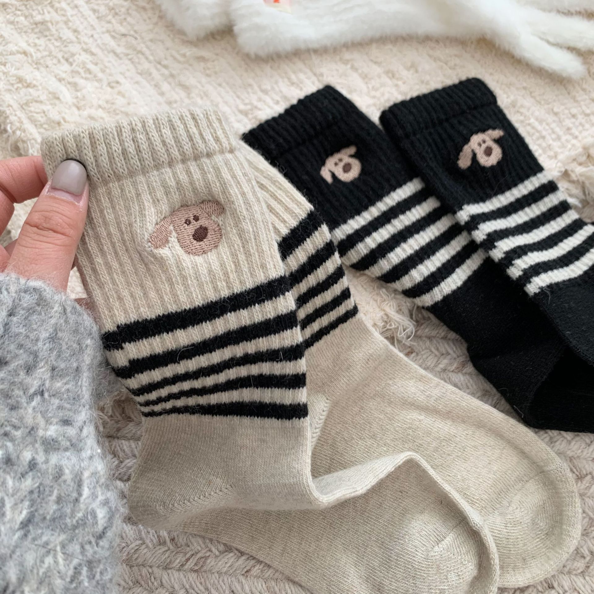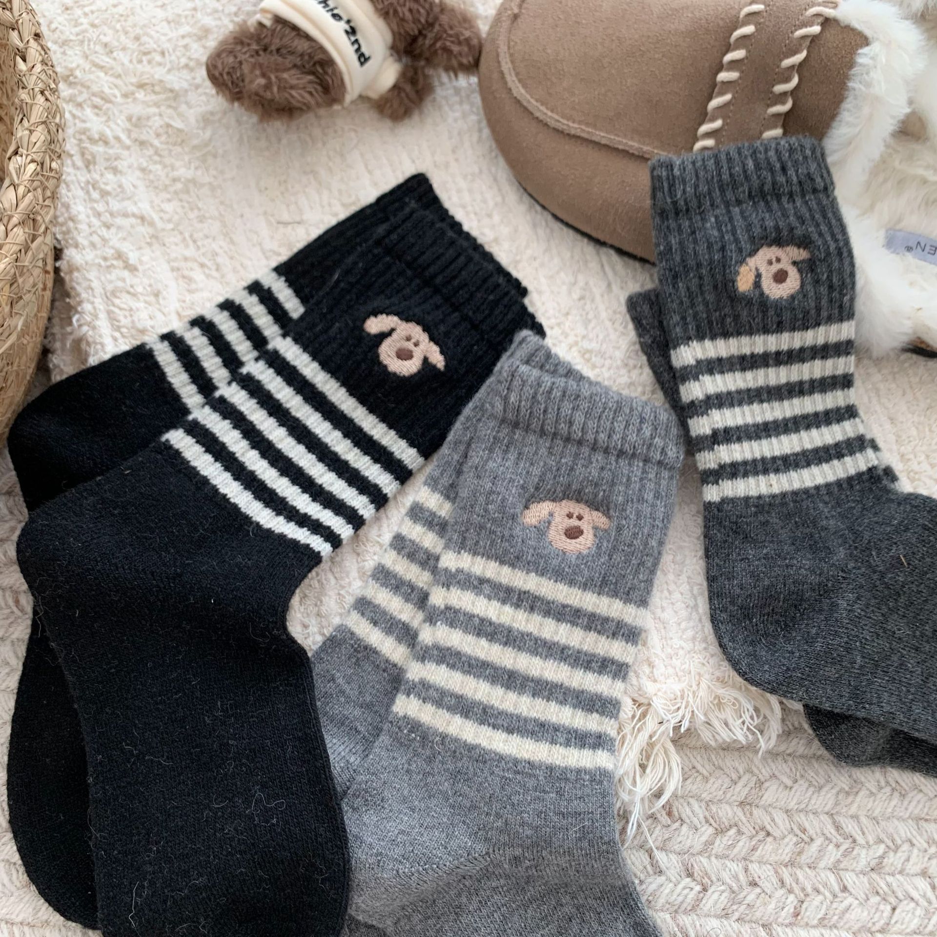 줄무늬 양모 양말 여성 회색 중간 길이 양말 가을과 겨울 두꺼운 따뜻한 빈티지 마일러 만화 강아지 스타킹