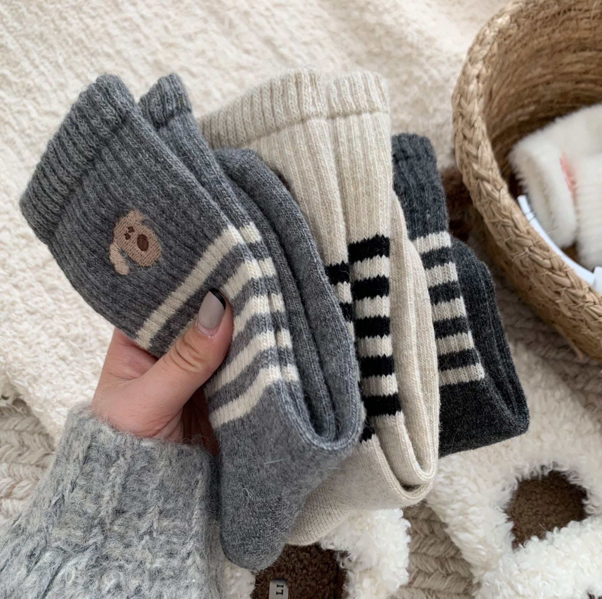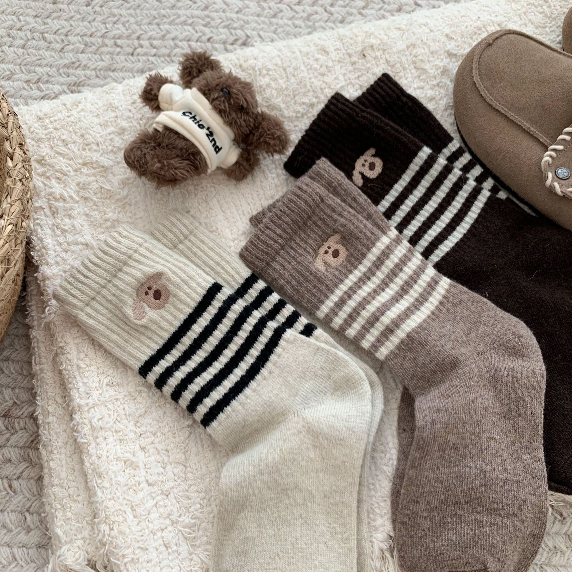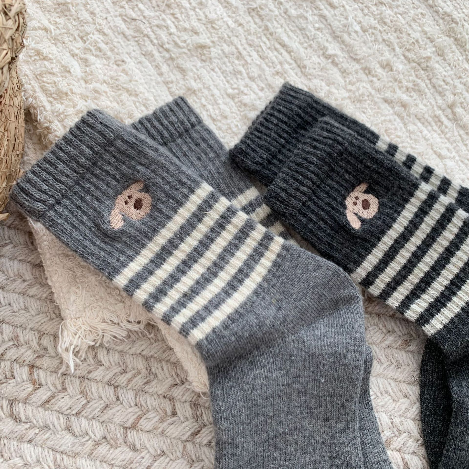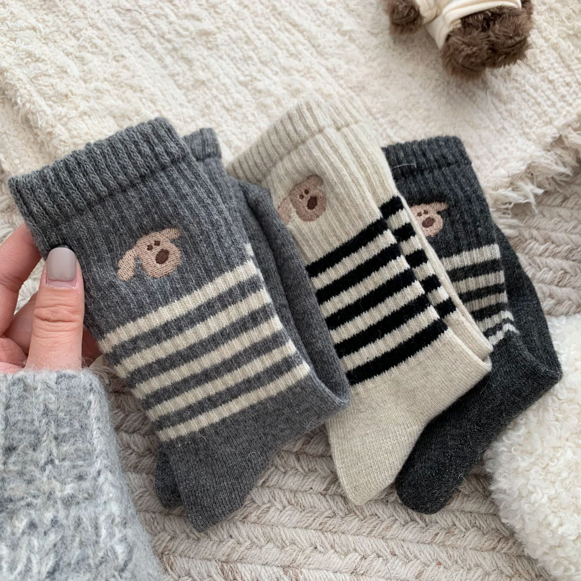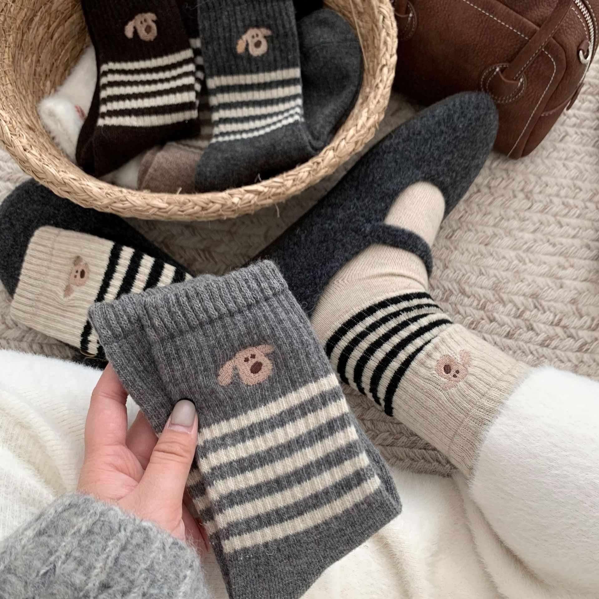 줄무늬 양모 양말 여성 회색 중간 길이 양말 가을과 겨울 두꺼운 따뜻한 빈티지 마일러 만화 강아지 스타킹