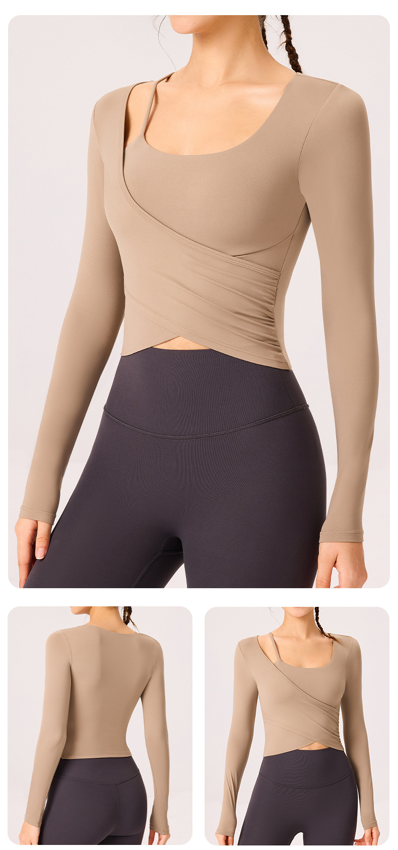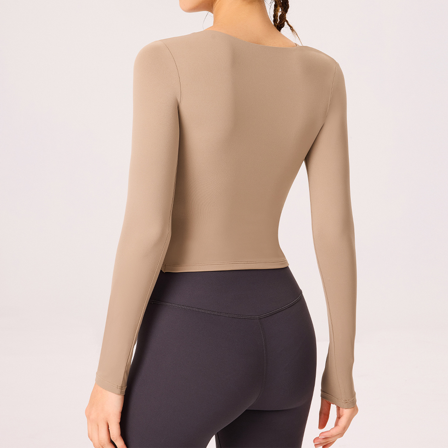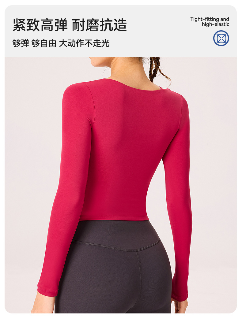 가을 겨울 신상품, 누드톤 요가복, 긴팔 통기성 슬림핏 고정컵 일체형 피트니스 러닝 탑 여성용