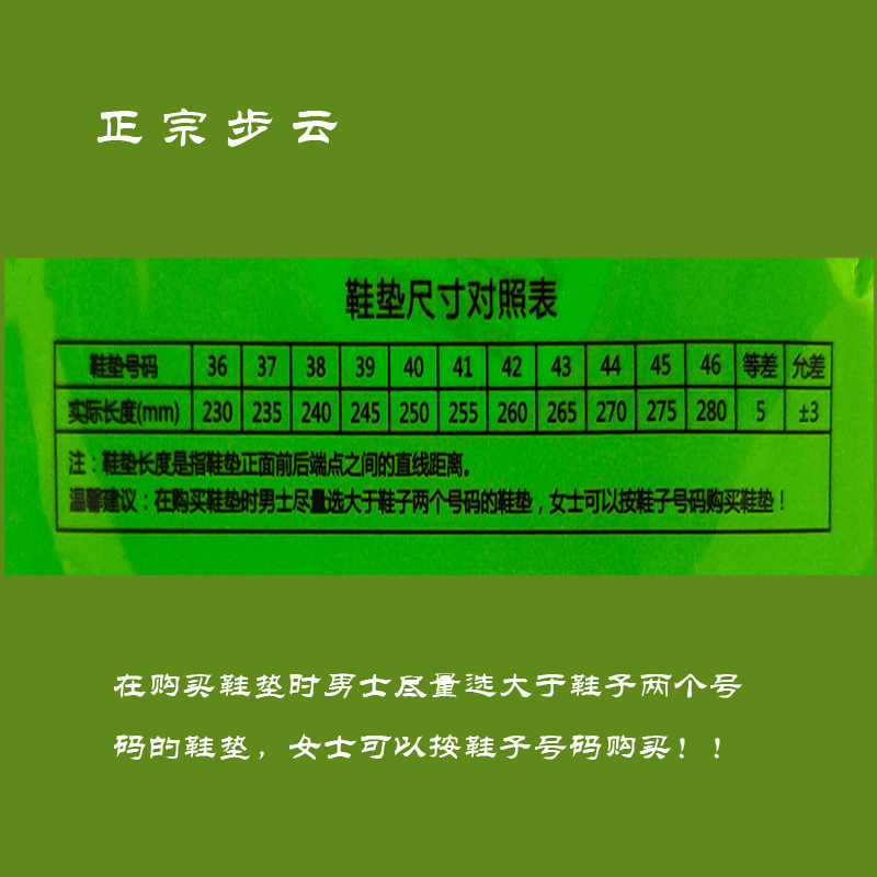 这款步云乳胶鞋垫,每双脚后跟反面,都有BUYUN的标识,另外,这款鞋垫有6个号码,35-36,37-38,39-40,41-42,43-44,45-46,鞋垫具有柔软舒适,厚薄适中,回弹不变形,经久耐用。