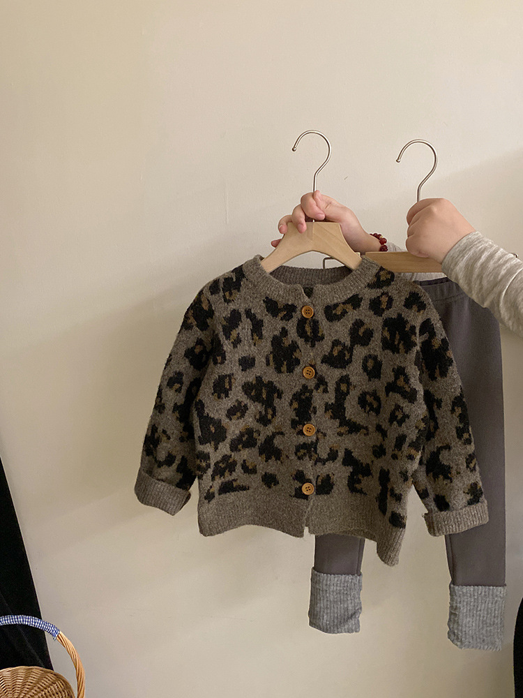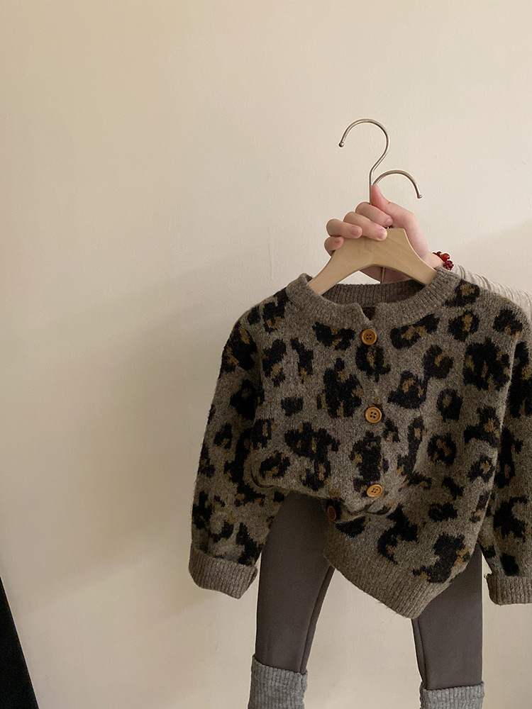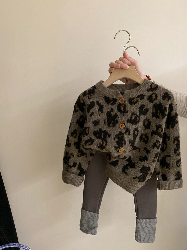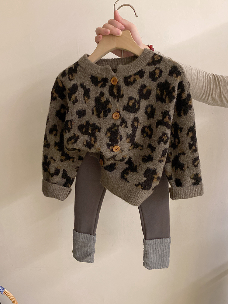 소녀 한국 세트 2024 가을/겨울 새로운 패션 레오파드 니트 카디건 스웨터 바느질 기모 레깅스 트렌디스토어 가기