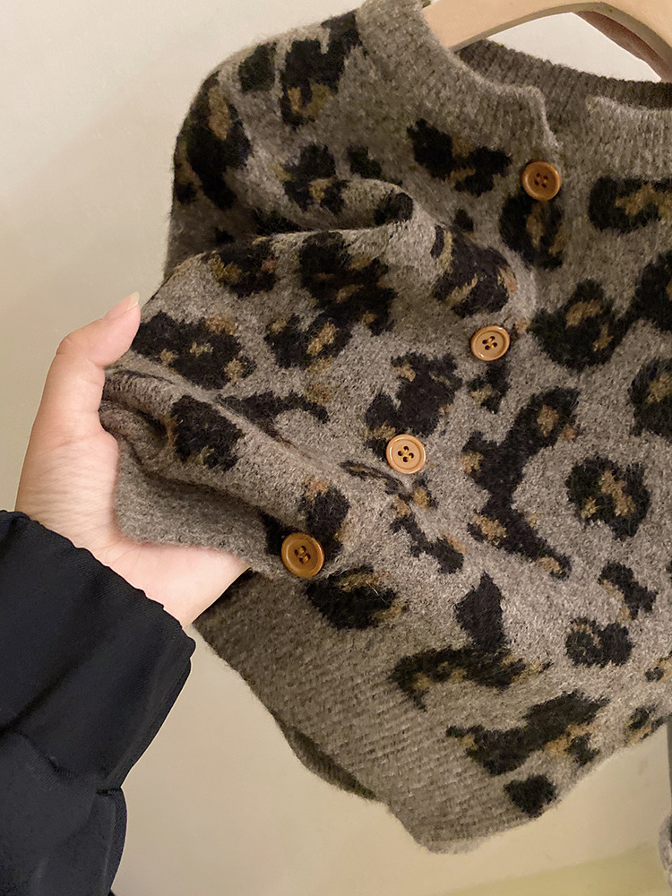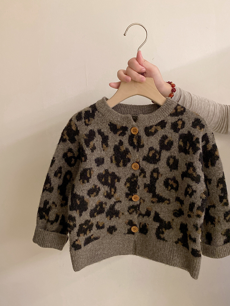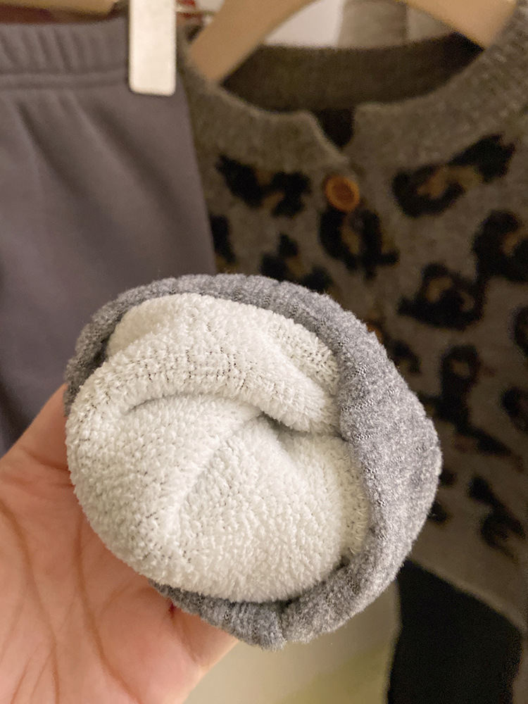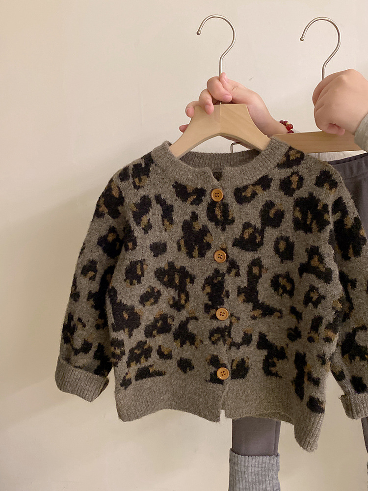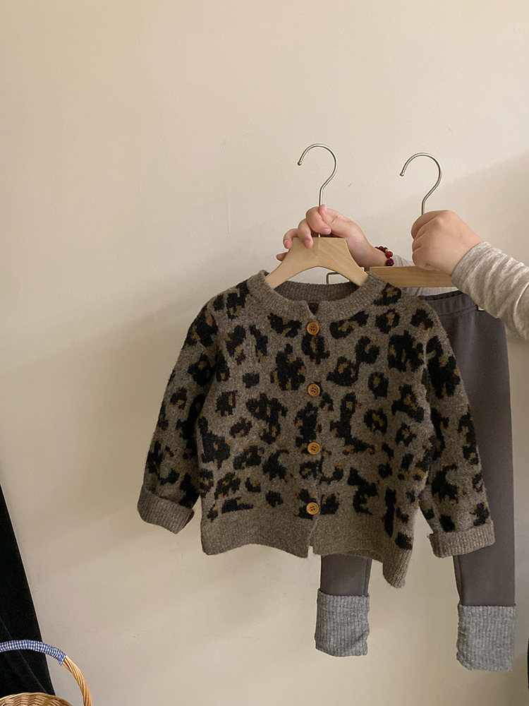 소녀 한국 세트 2024 가을/겨울 새로운 패션 레오파드 니트 카디건 스웨터 바느질 기모 레깅스 트렌디스토어 가기