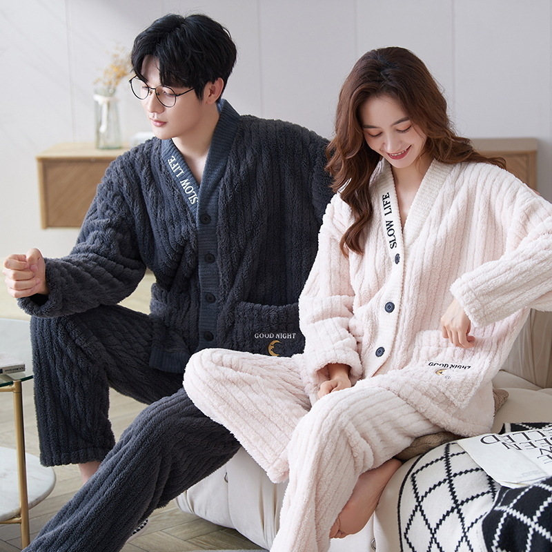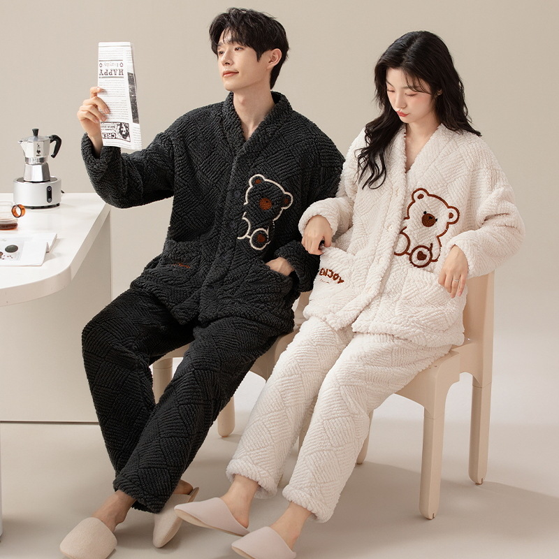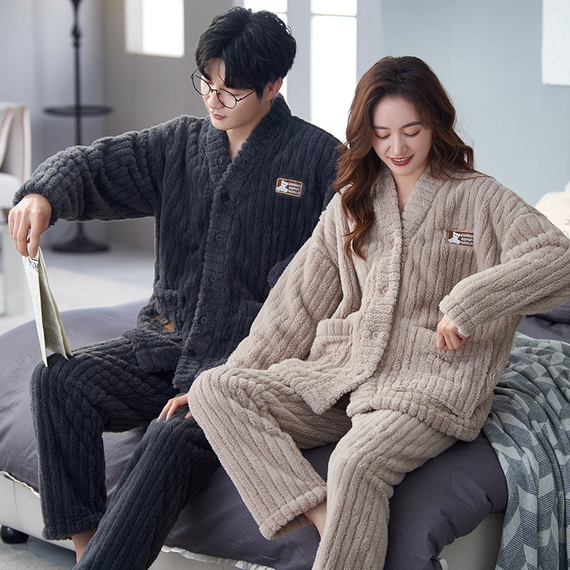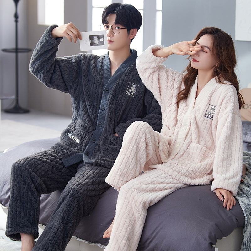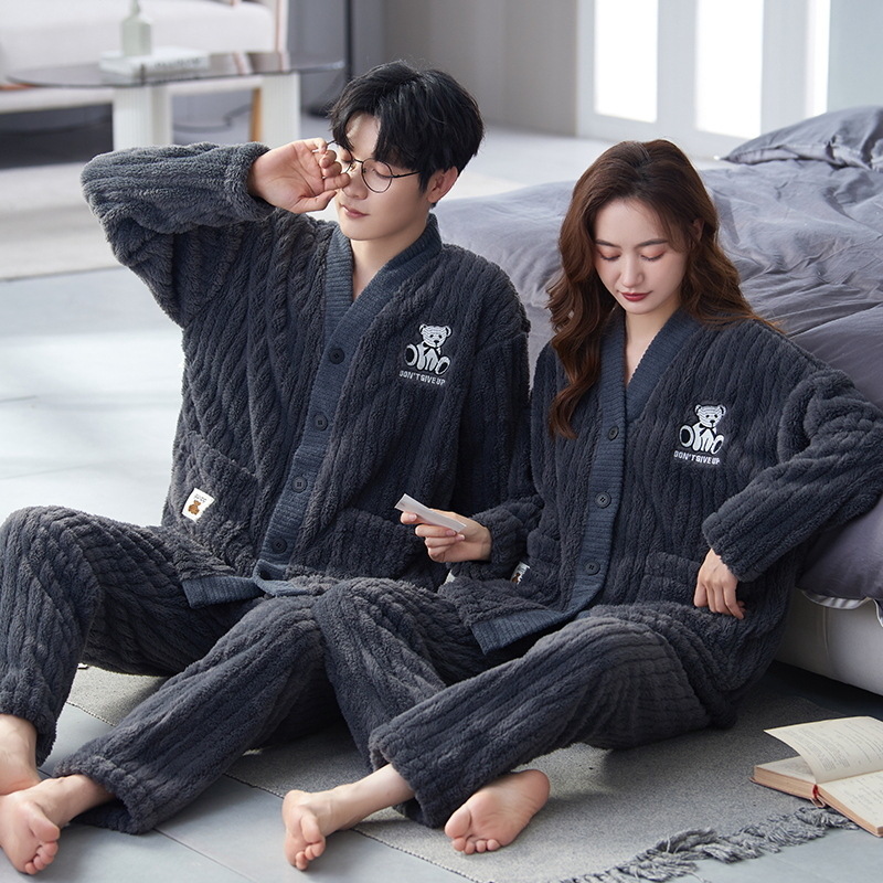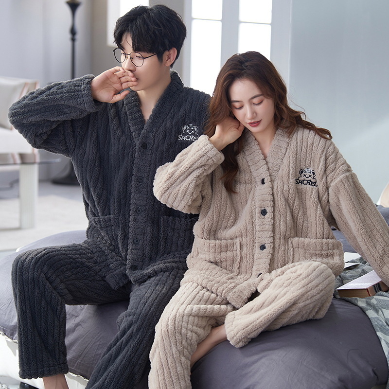 여자 남자 플란넬 카디건 파자마 겨울 기모 두꺼운 따뜻한 산호 양털 커플 홈 옷 가을과 겨울스토어 가기