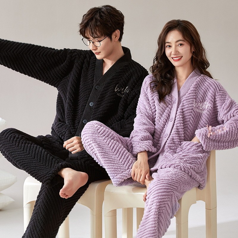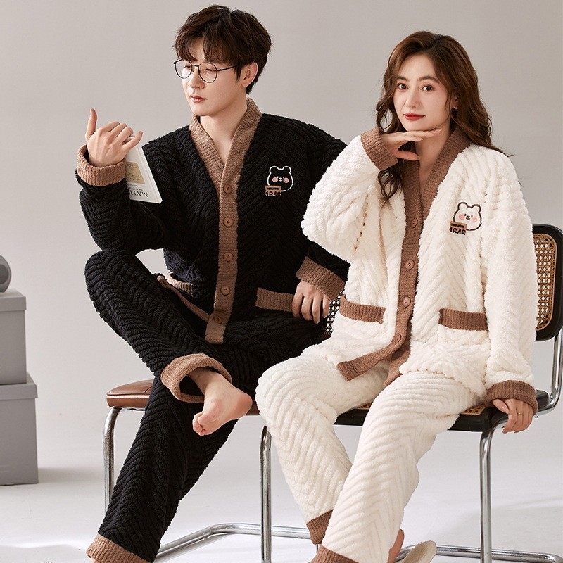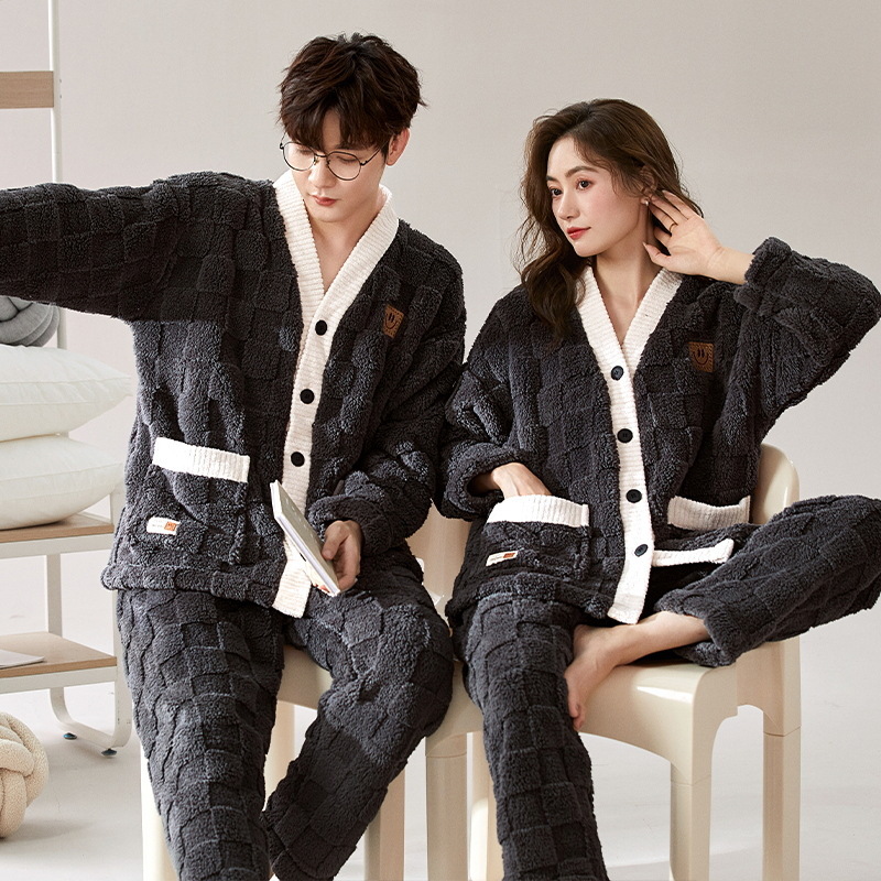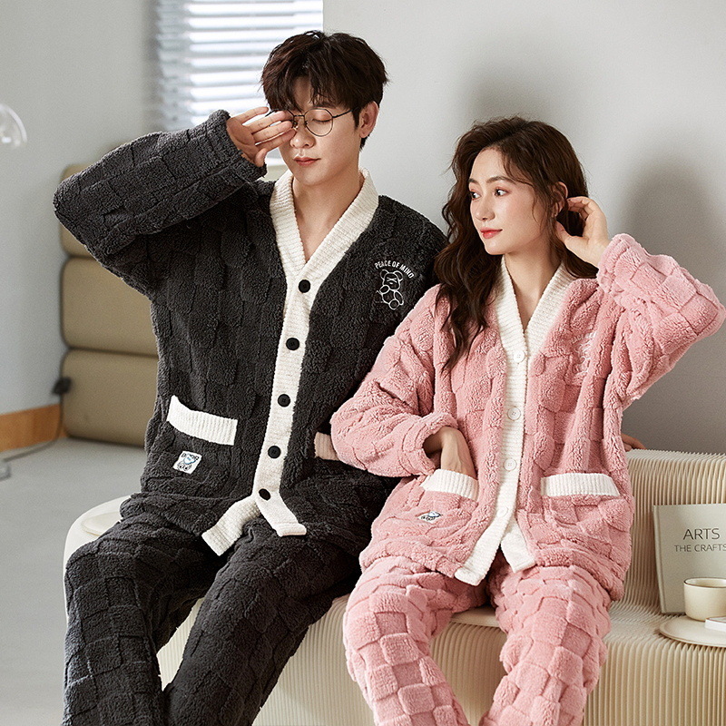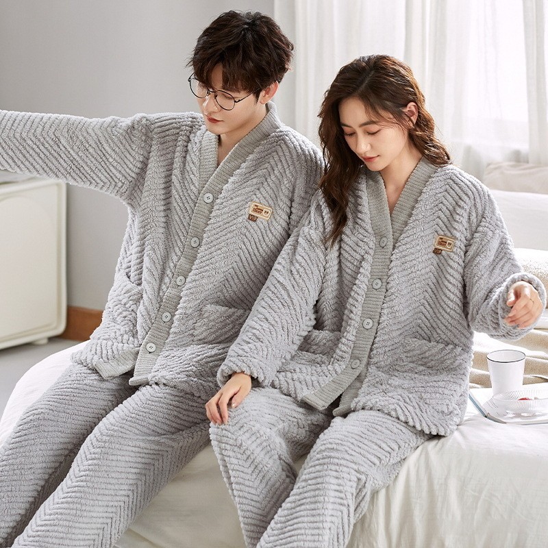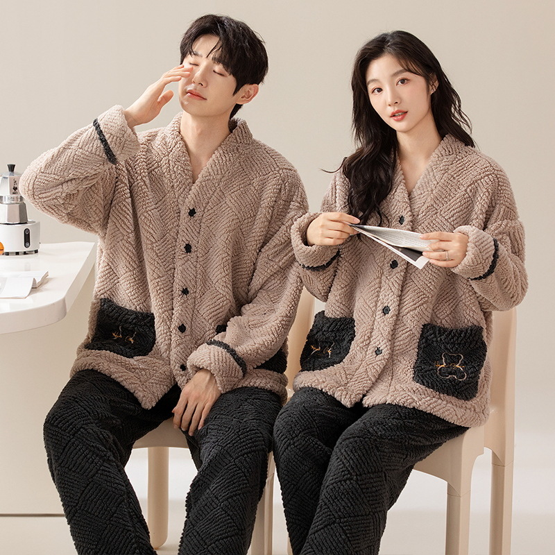 여자 남자 플란넬 카디건 파자마 겨울 기모 두꺼운 따뜻한 산호 양털 커플 홈 옷 가을과 겨울스토어 가기
