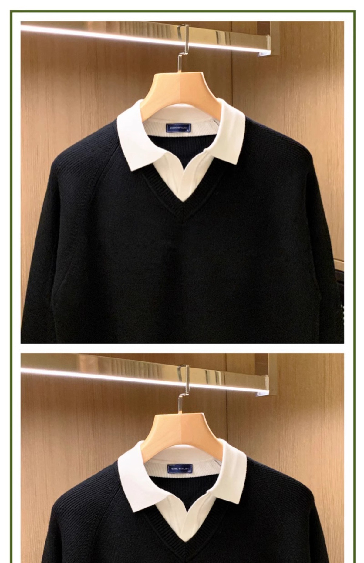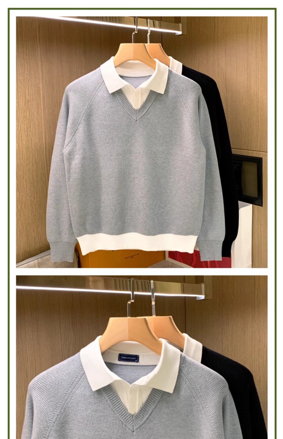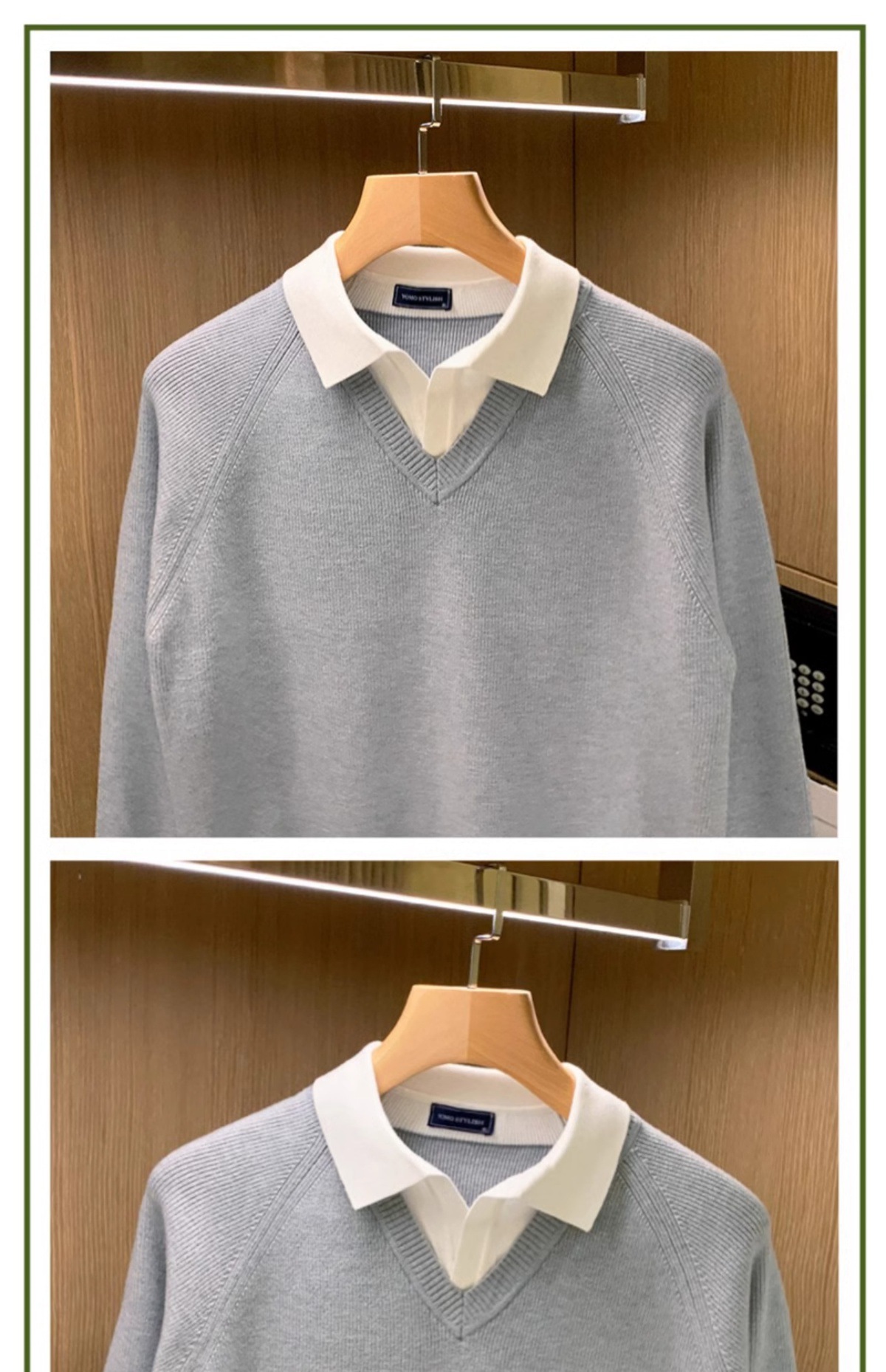 캐주얼 내부 니트 셔츠 남성 최고 긴팔 폴로 셔츠 남성용 하이 엔드 패션 스티칭 남성용 가짜 투피스 스웨터