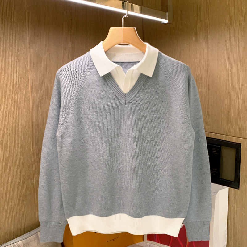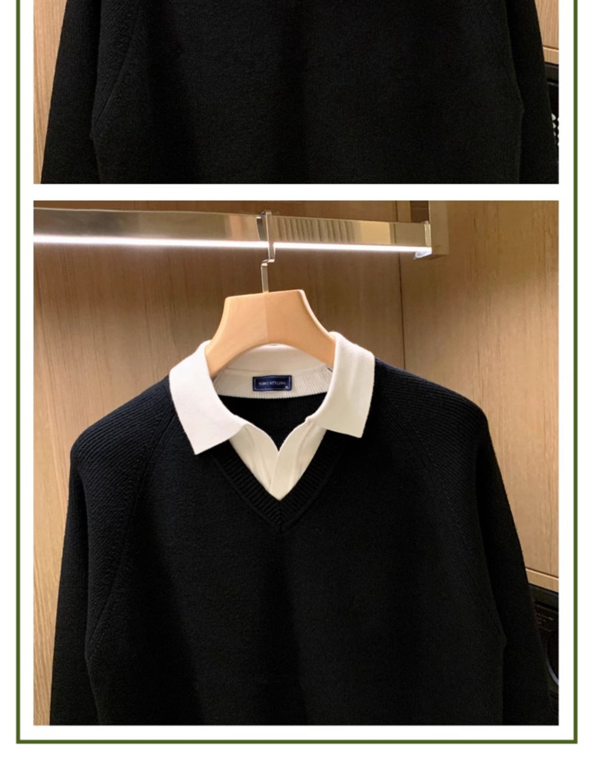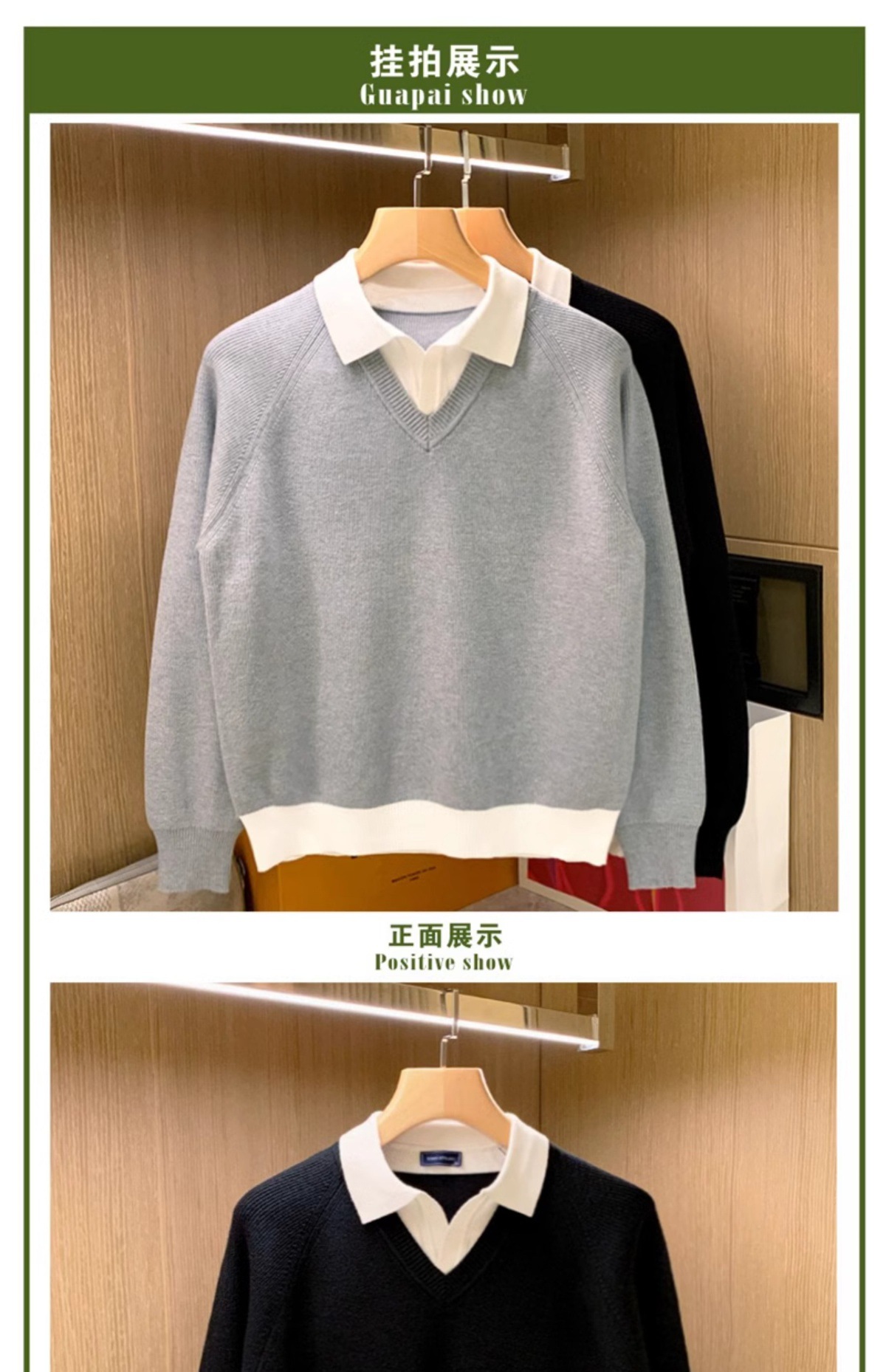 캐주얼 내부 니트 셔츠 남성 최고 긴팔 폴로 셔츠 남성용 하이 엔드 패션 스티칭 남성용 가짜 투피스 스웨터