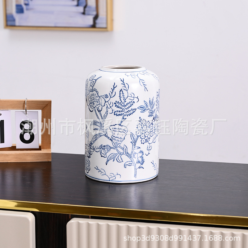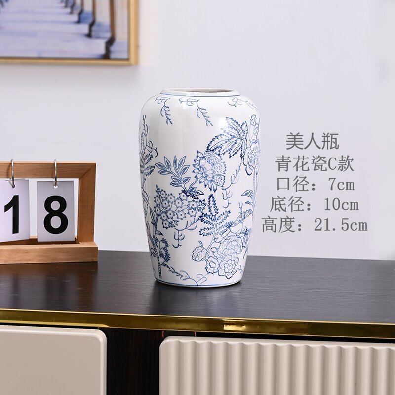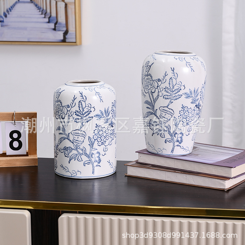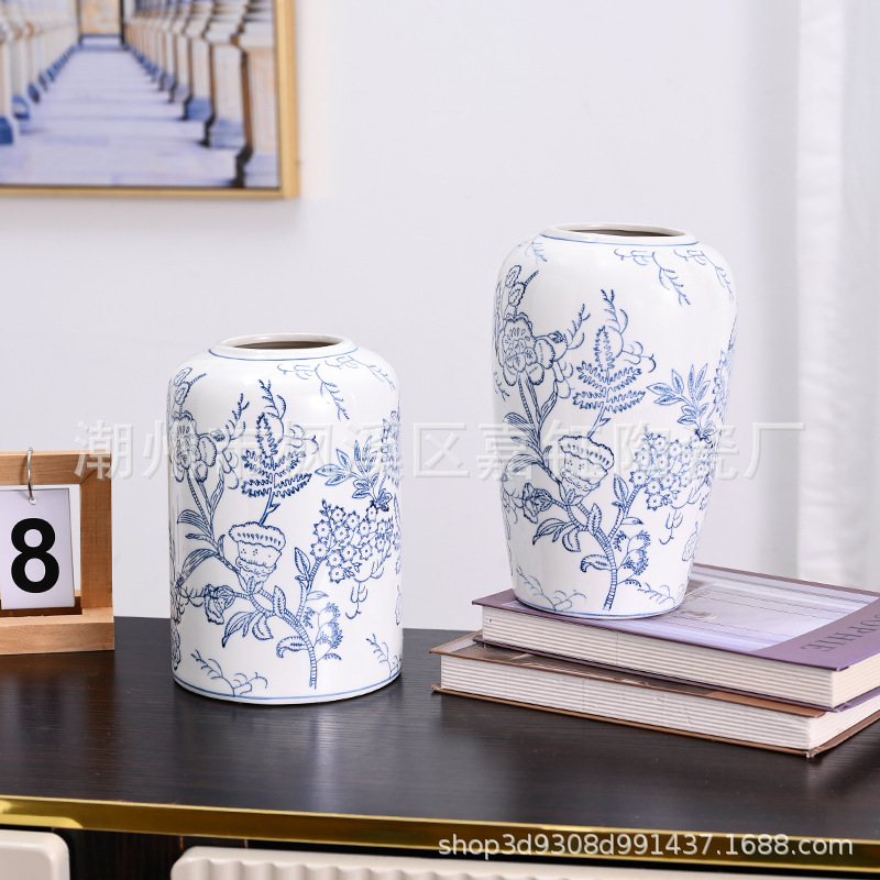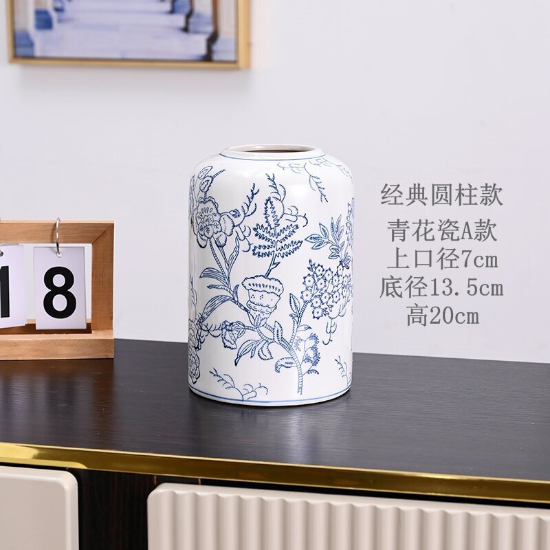 고급 중세 스타일 Jingdezhen 파란색과 흰색 도자기 손으로 그린 꽃병 색 물 높이 꽃 말린 꽃 거실 장식 장식품스토어 가기