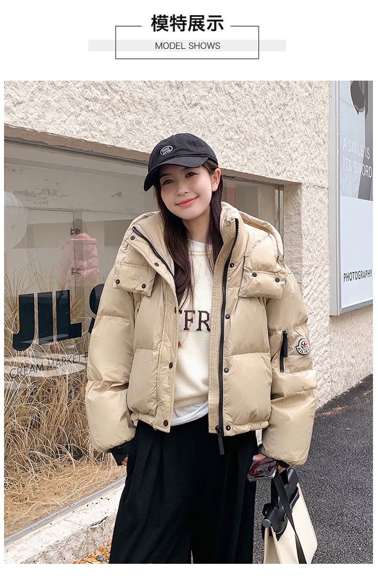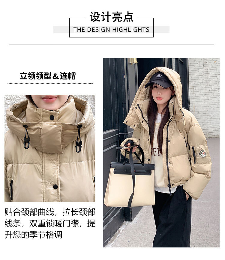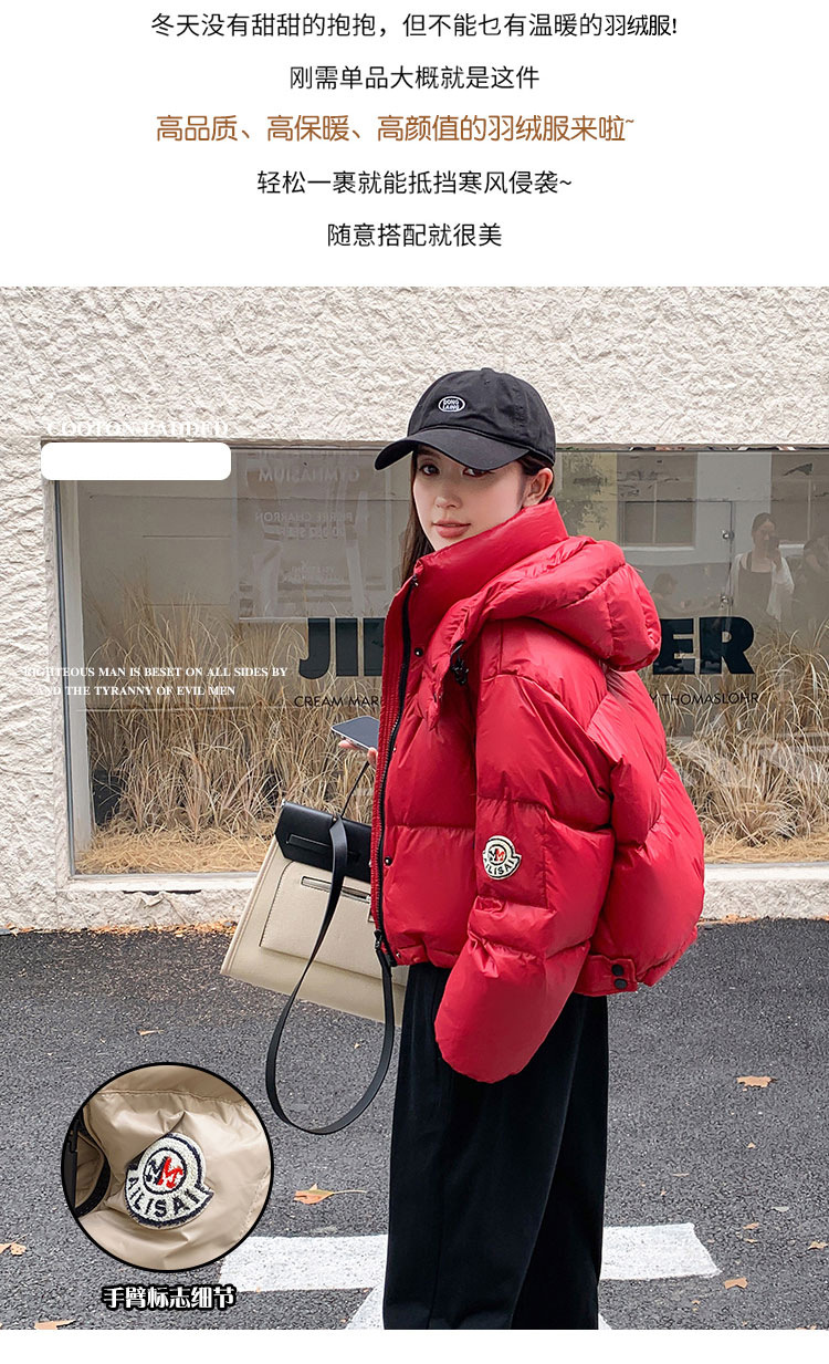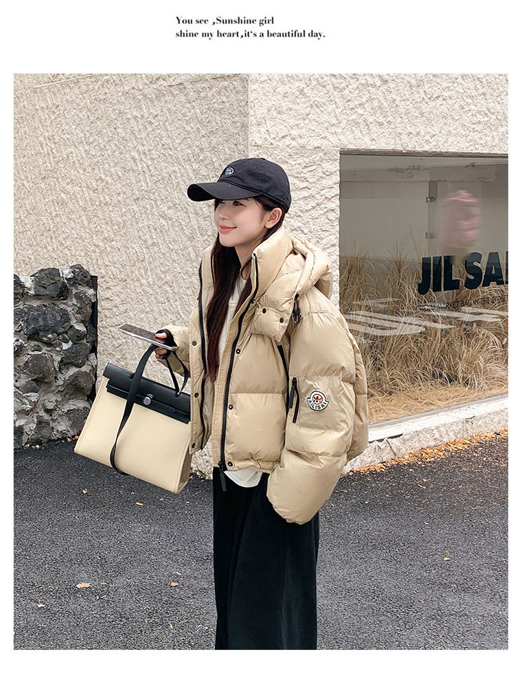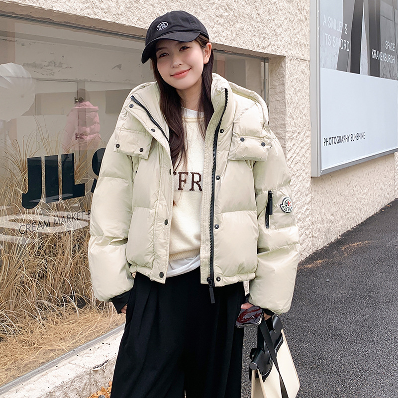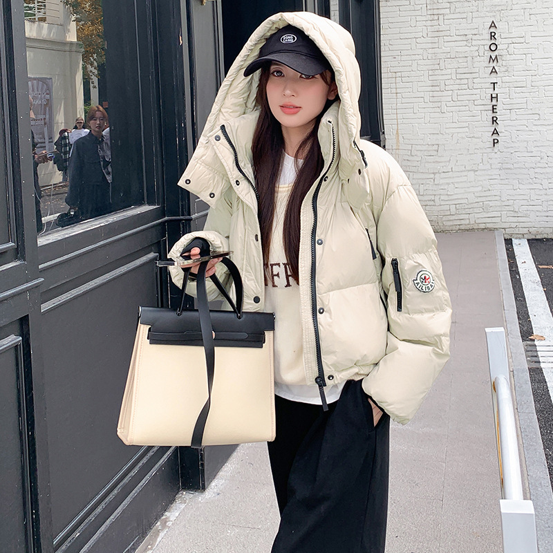 하이 엔드 브랜드 밝은 짧은 다운 재킷 여성의 2024 새로운 겨울 두꺼운 오리 후드 느슨한 빵 코트스토어 가기