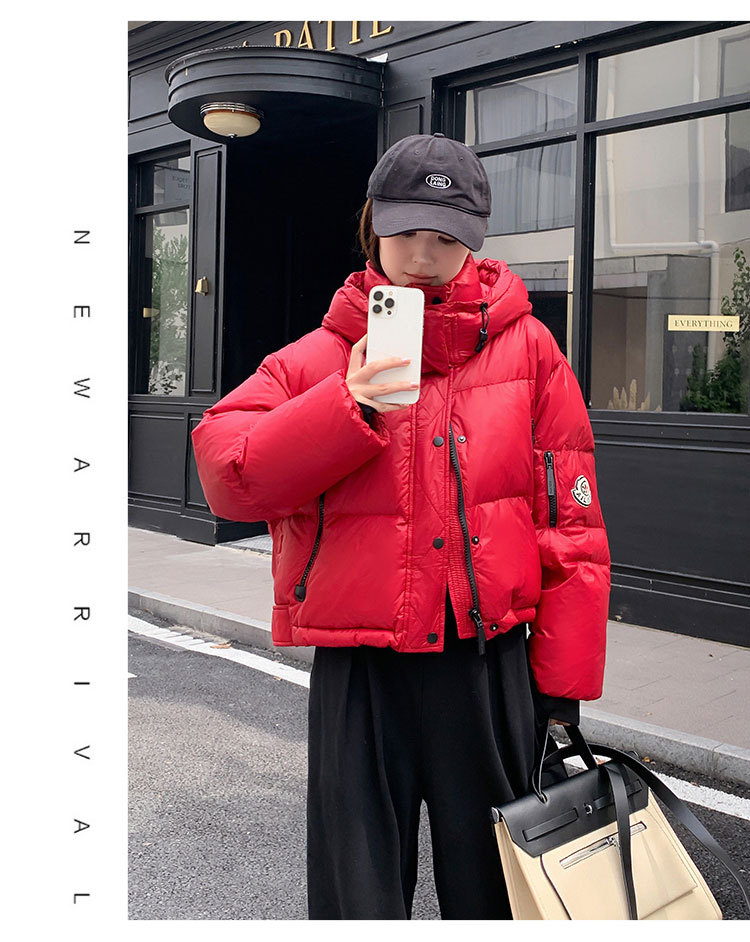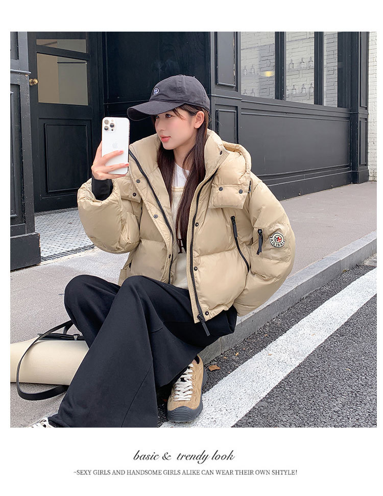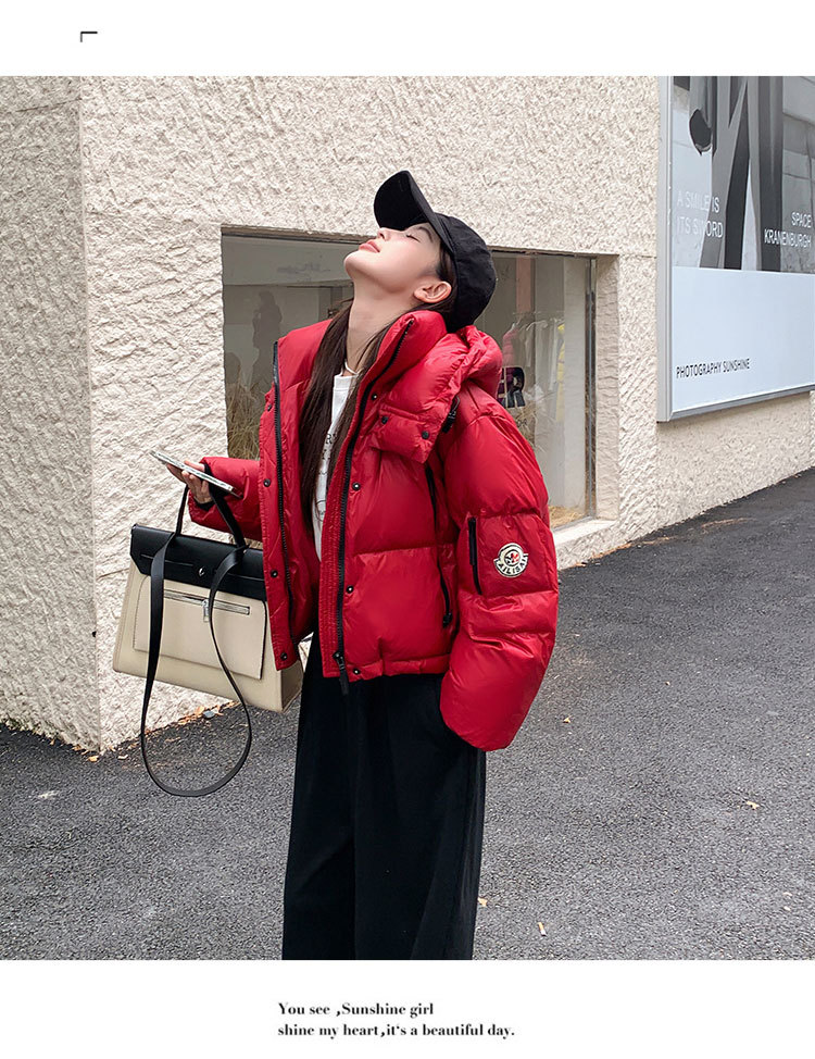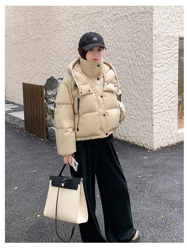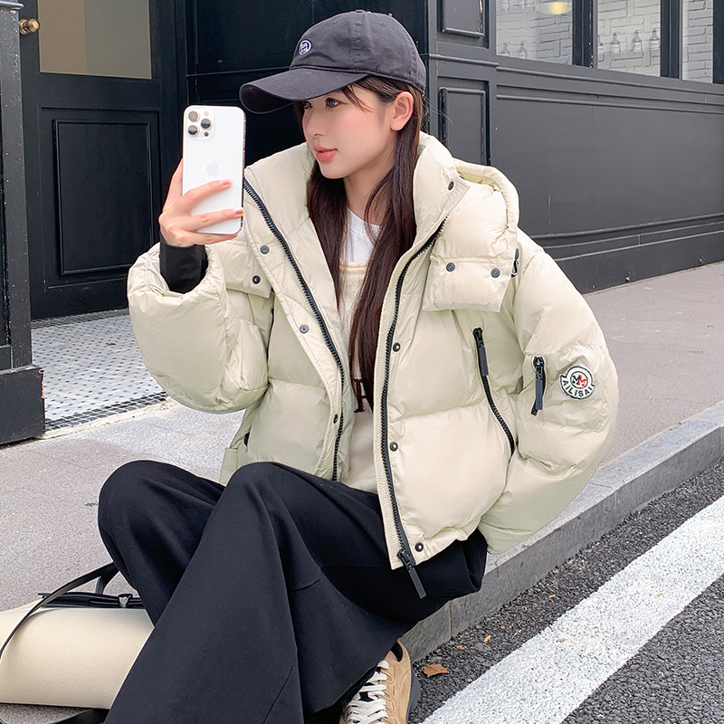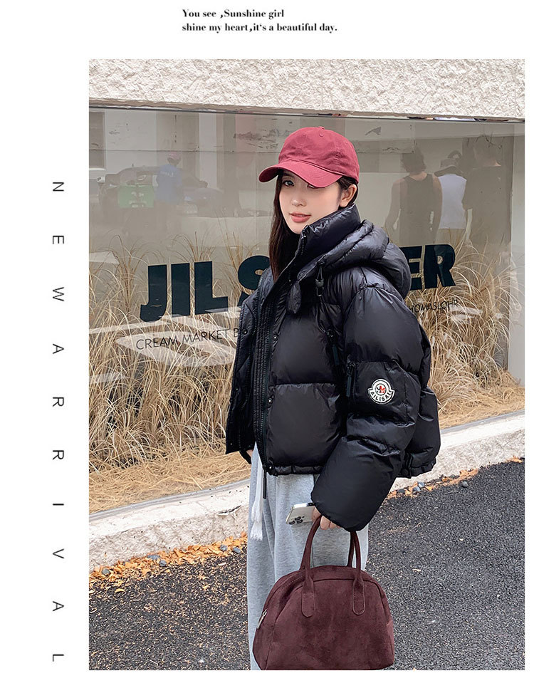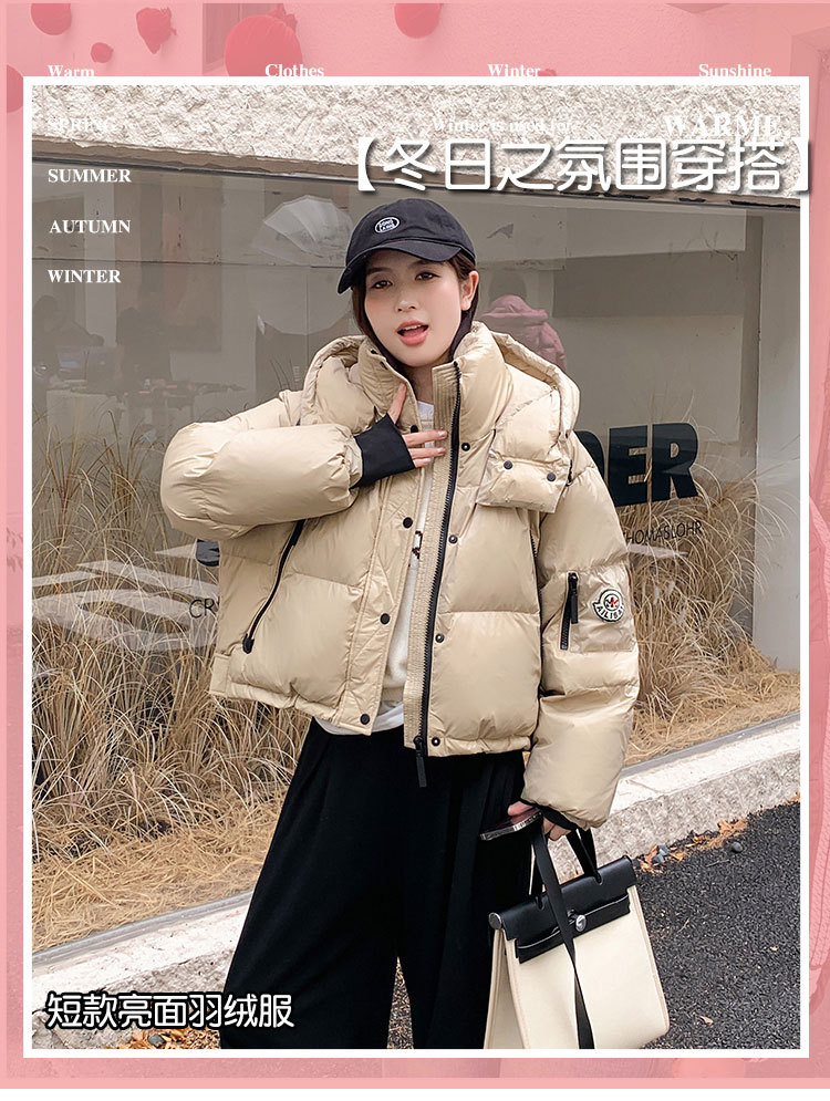 하이 엔드 브랜드 밝은 짧은 다운 재킷 여성의 2024 새로운 겨울 두꺼운 오리 후드 느슨한 빵 코트스토어 가기