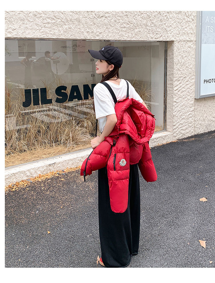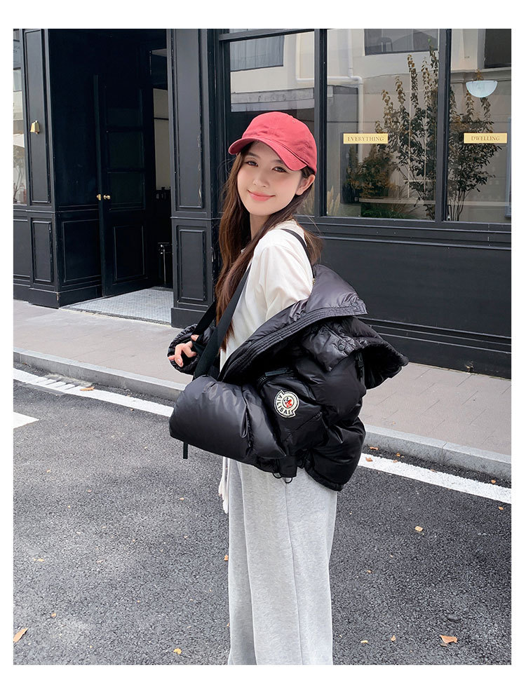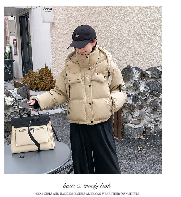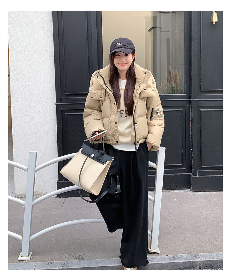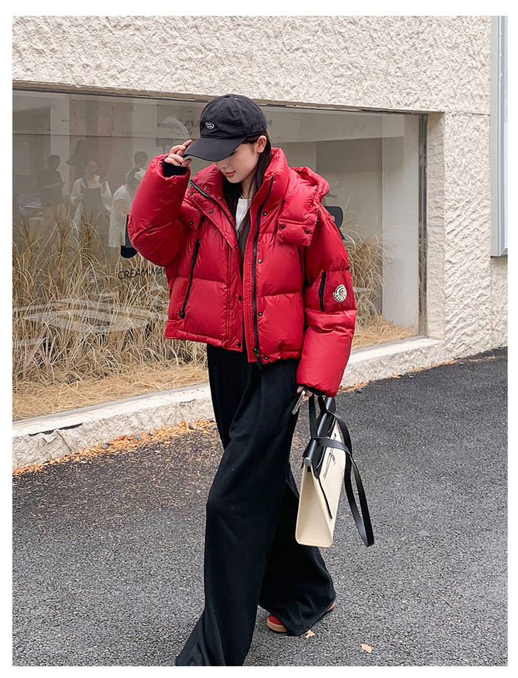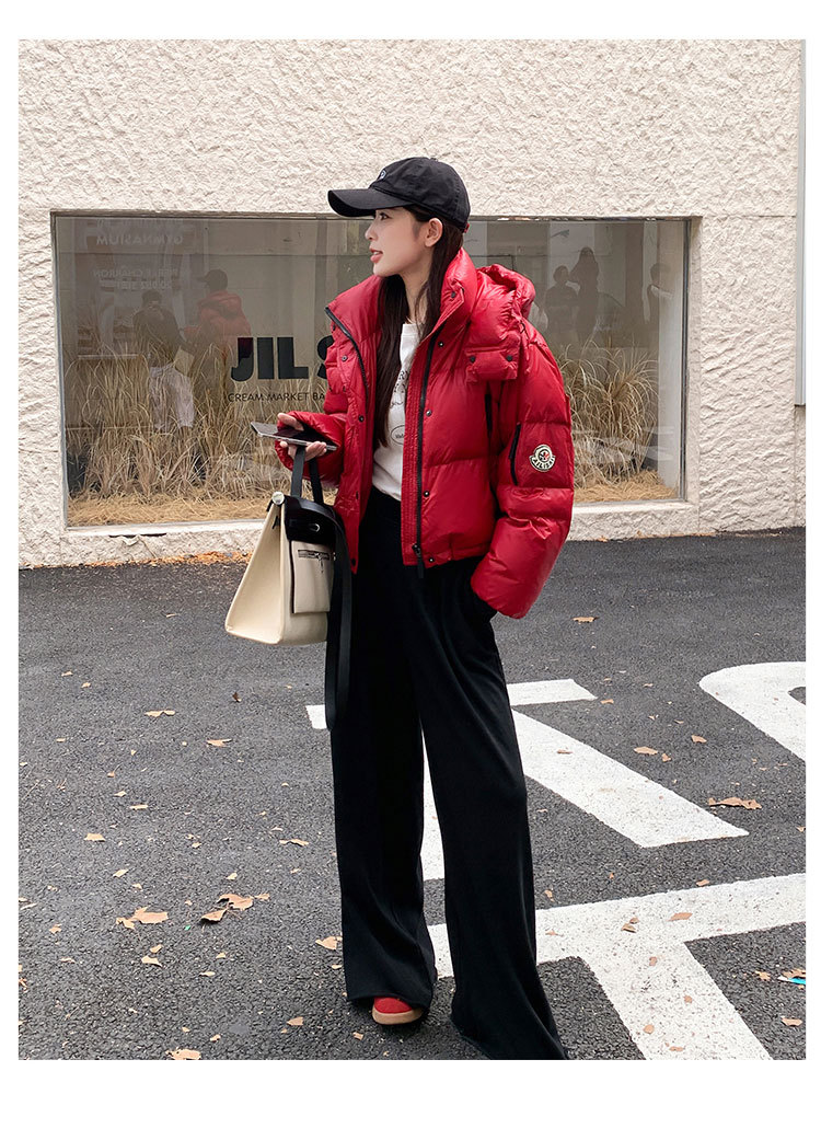 하이 엔드 브랜드 밝은 짧은 다운 재킷 여성의 2024 새로운 겨울 두꺼운 오리 후드 느슨한 빵 코트스토어 가기