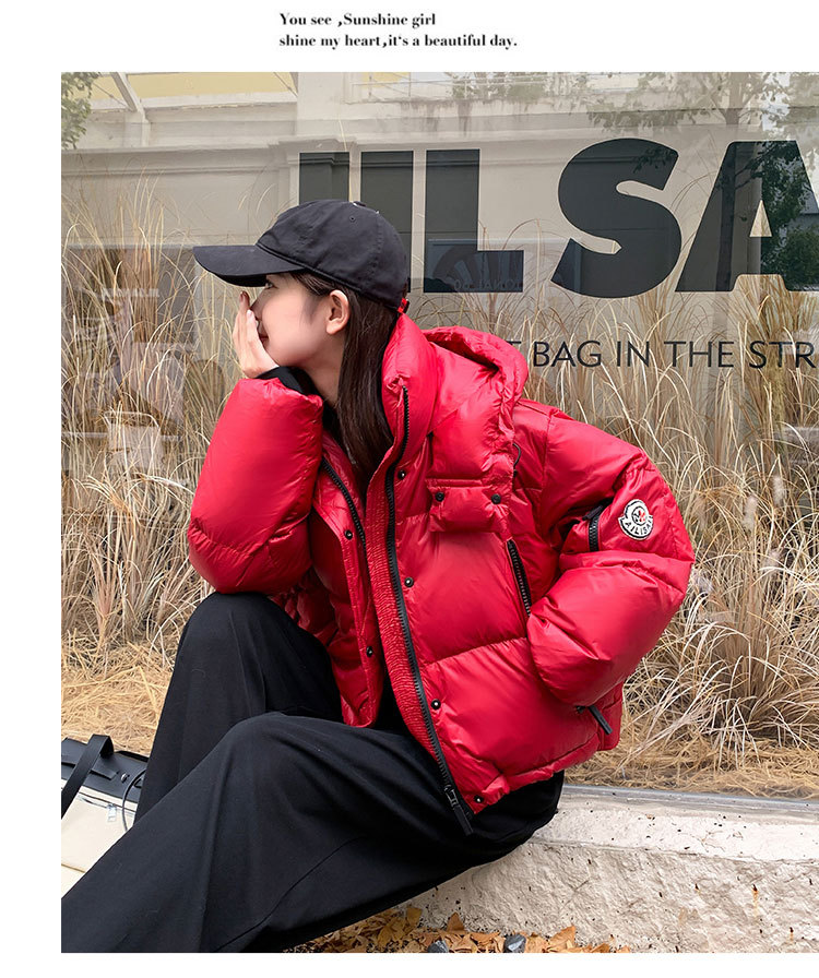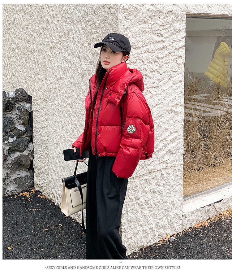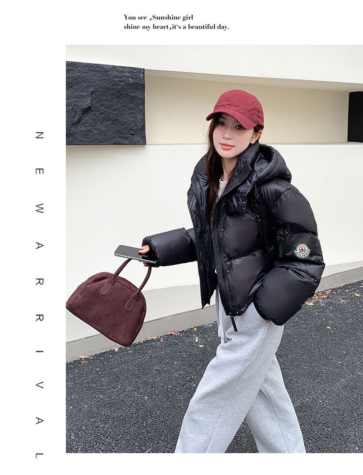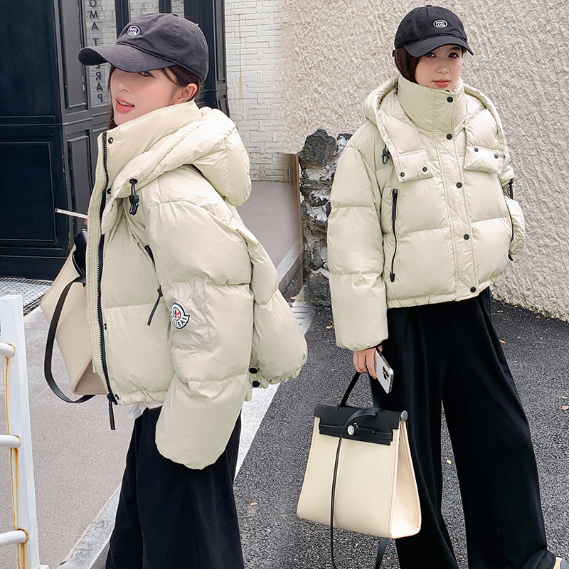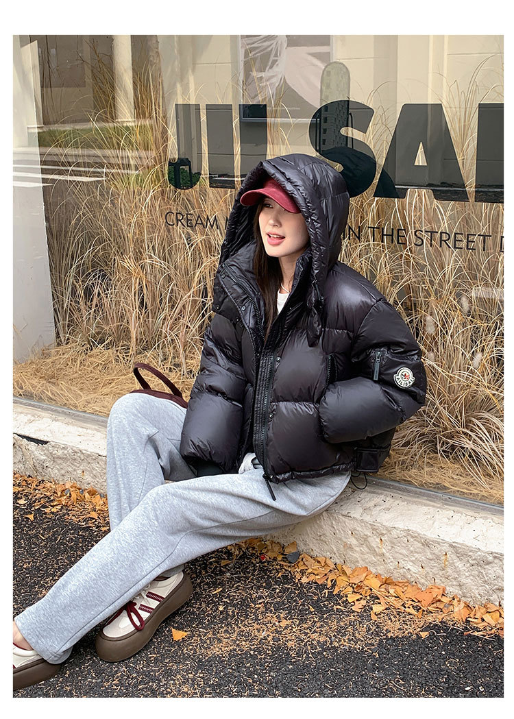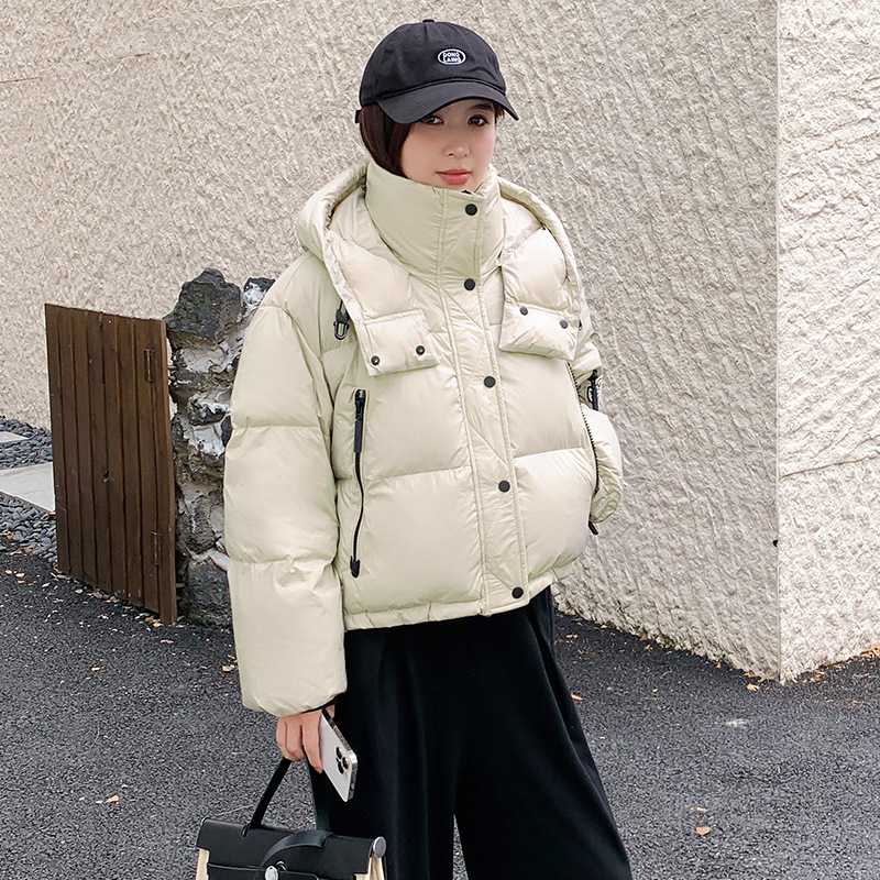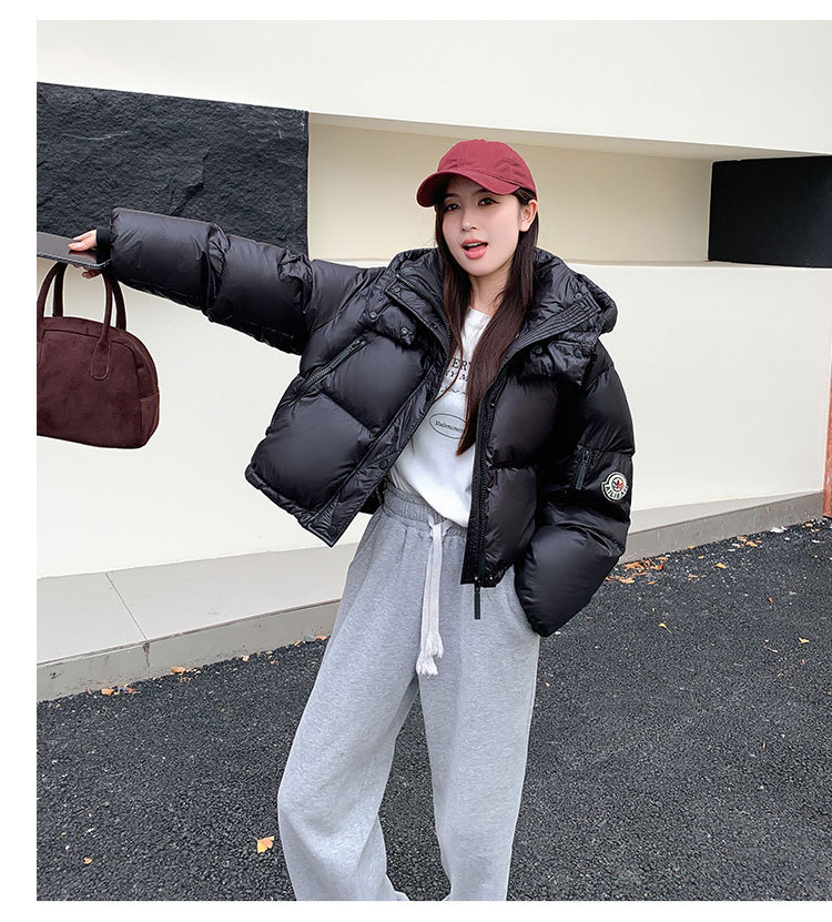 하이 엔드 브랜드 밝은 짧은 다운 재킷 여성의 2024 새로운 겨울 두꺼운 오리 후드 느슨한 빵 코트