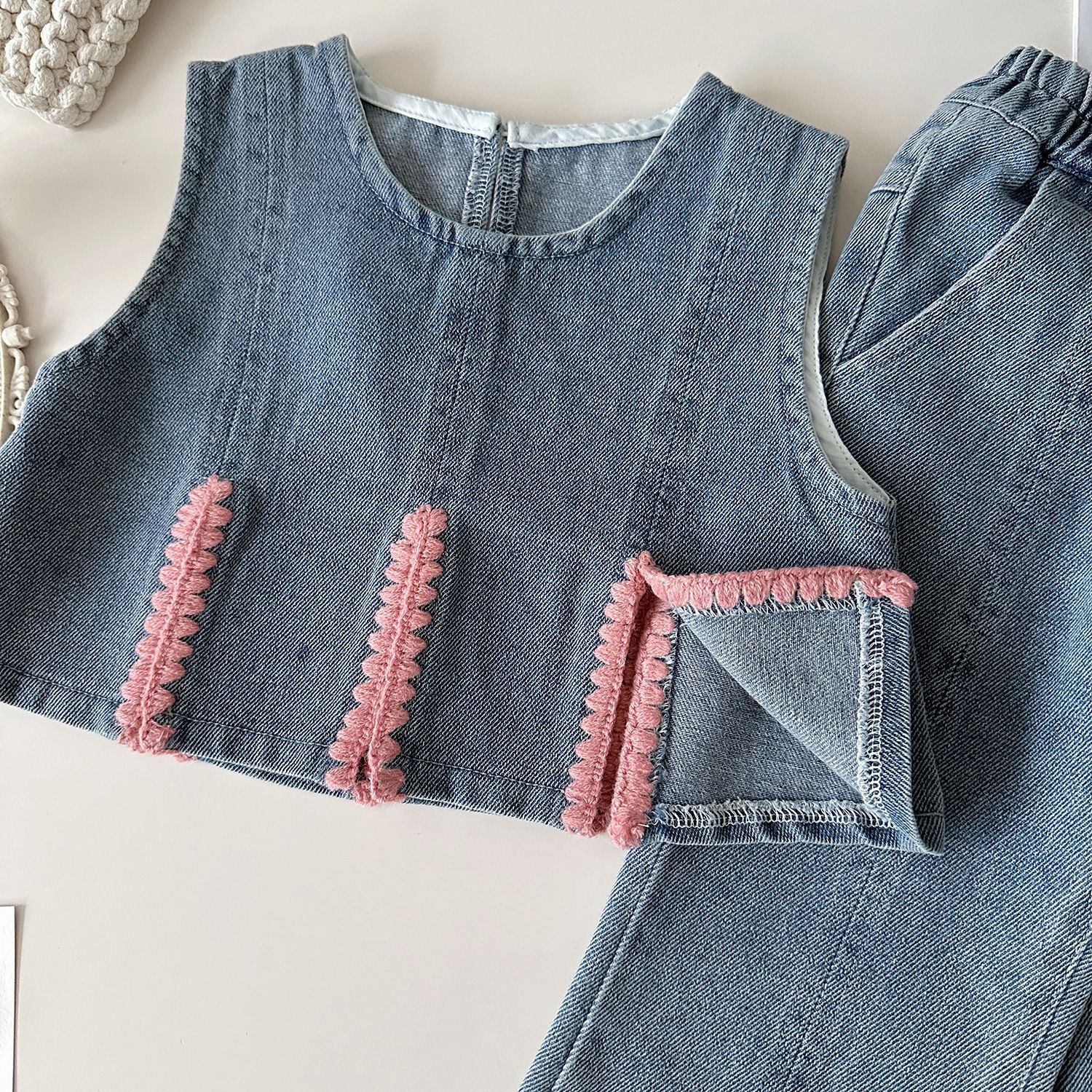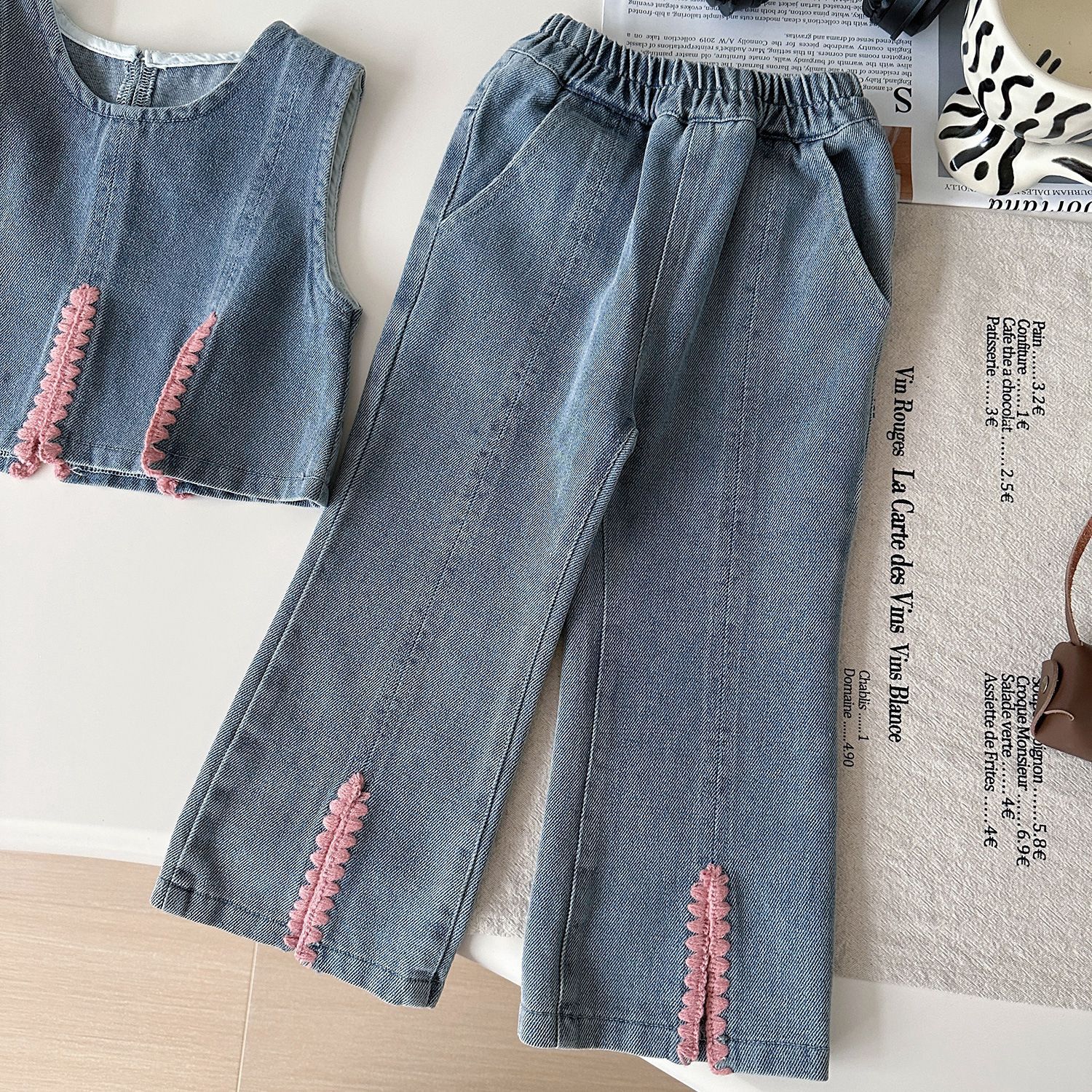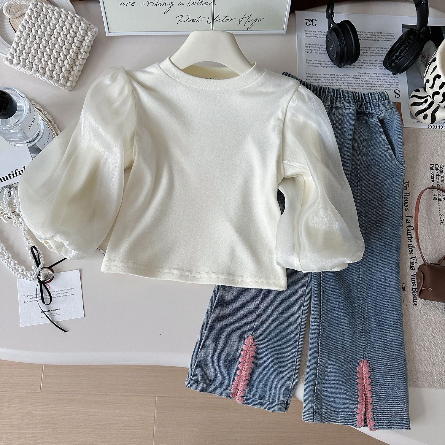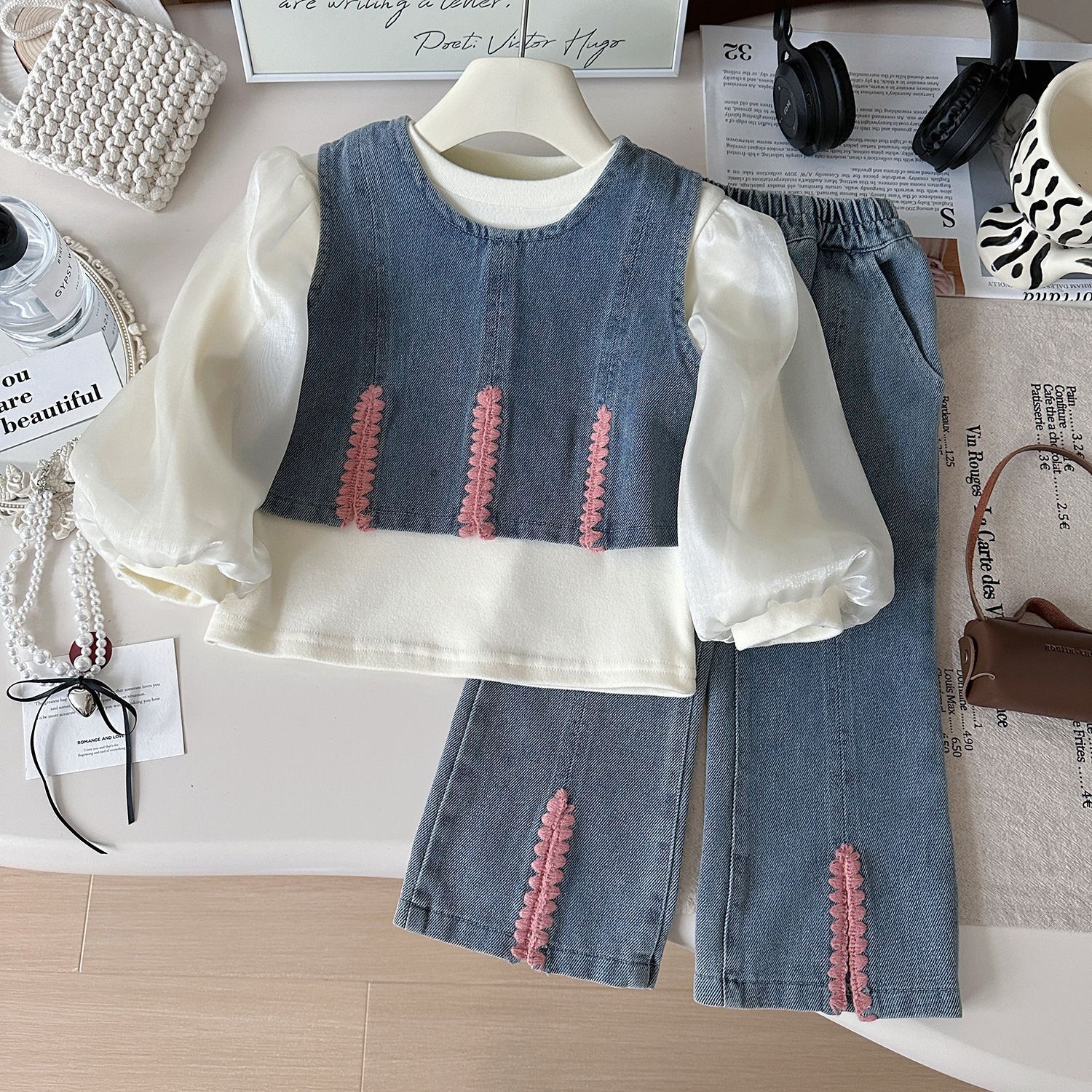 여아복 세트 2025년 봄 신상 여아 패셔너블하고 스타일리쉬한 아동용 베이스 레이어 셔츠와 데님 와이드 팬츠 3종 세트스토어 가기