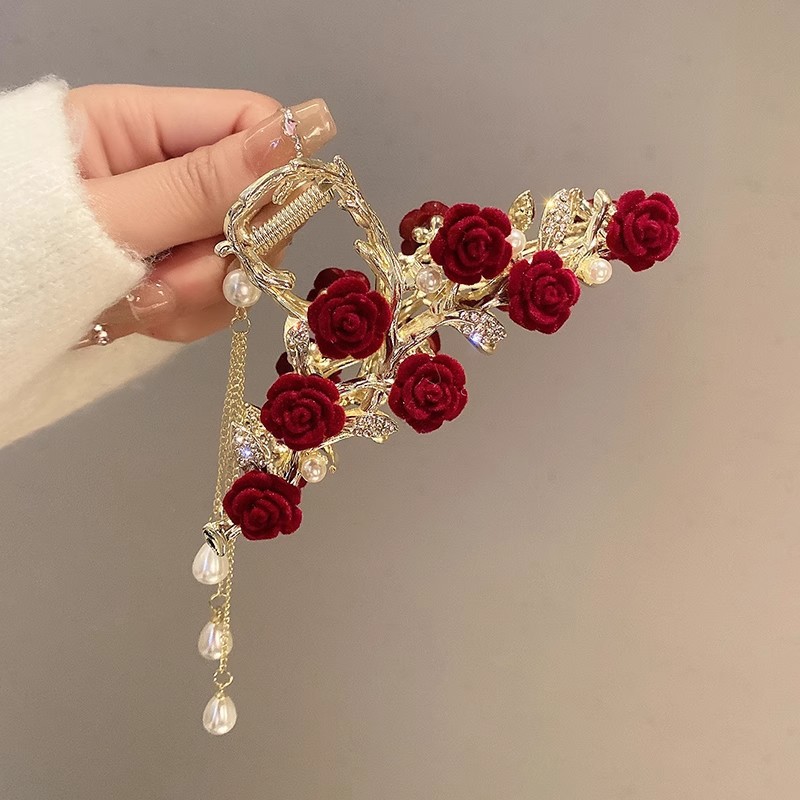 골동품 빨간 장미 술 머리 잡아 클립 기질 여성 머리 상어 클립 고급 감각 디스크 머리 잡아 클립 헤드웨어